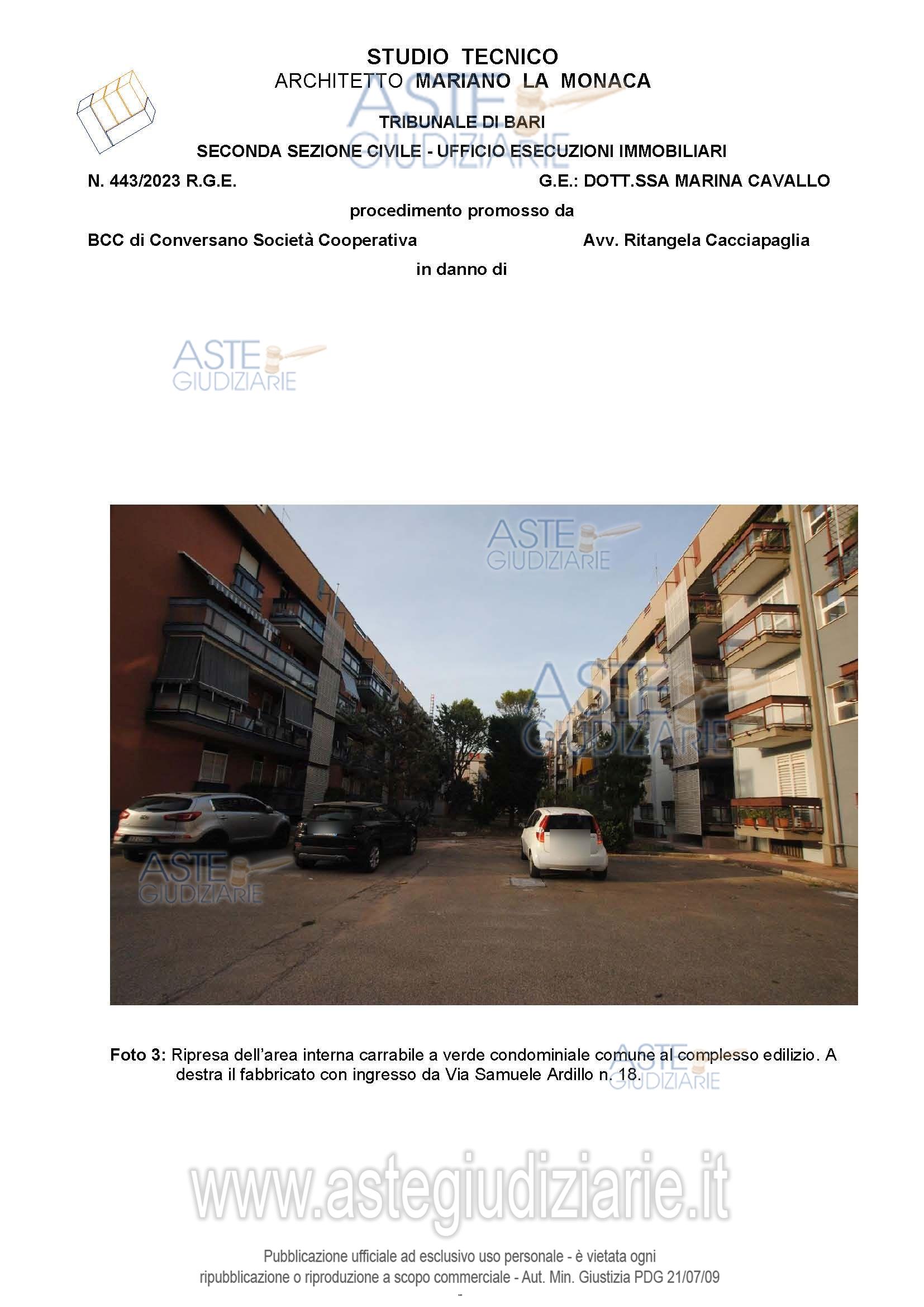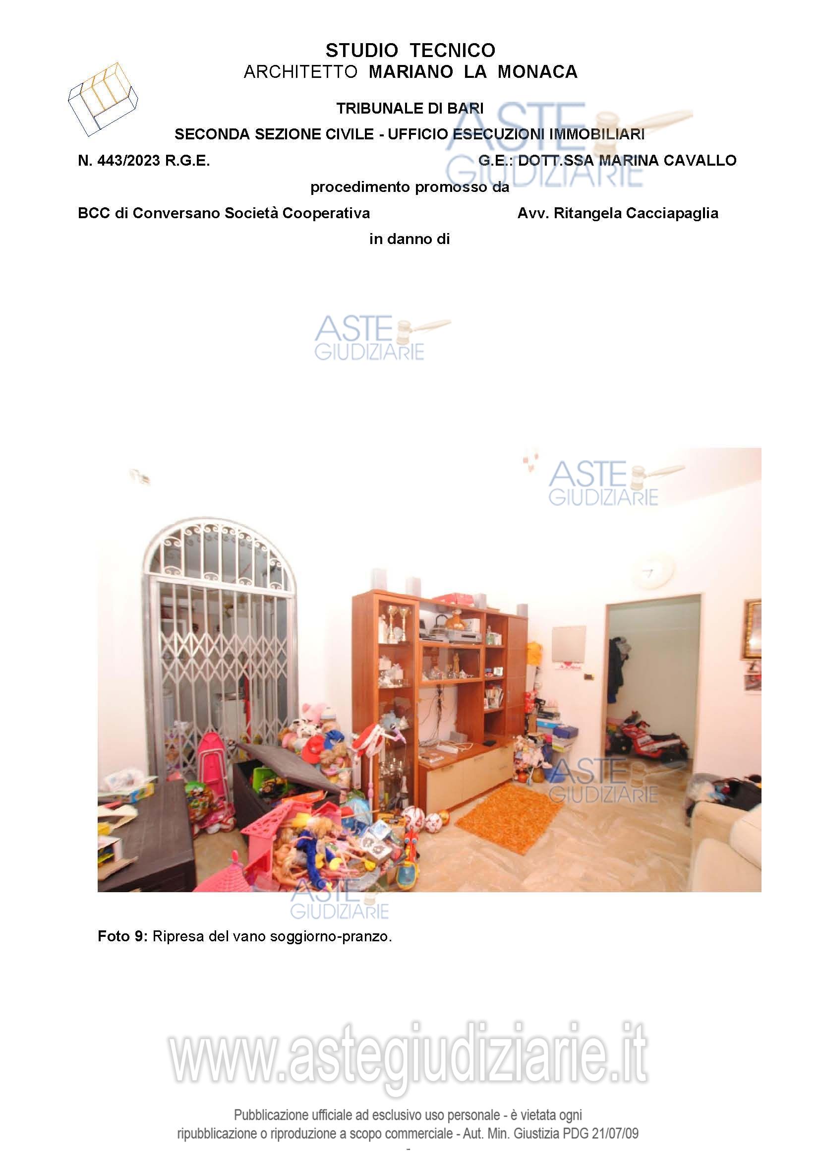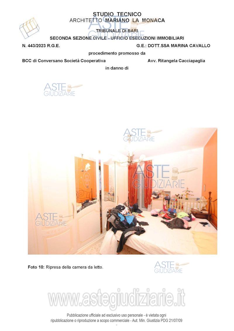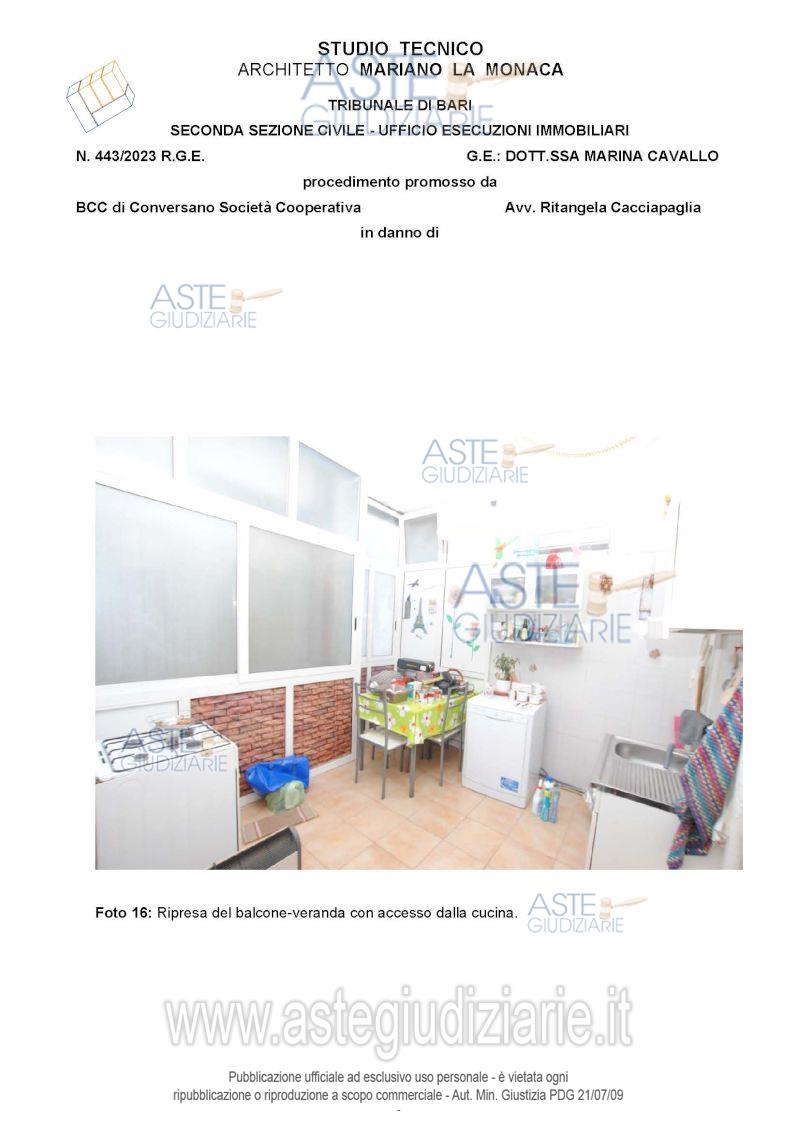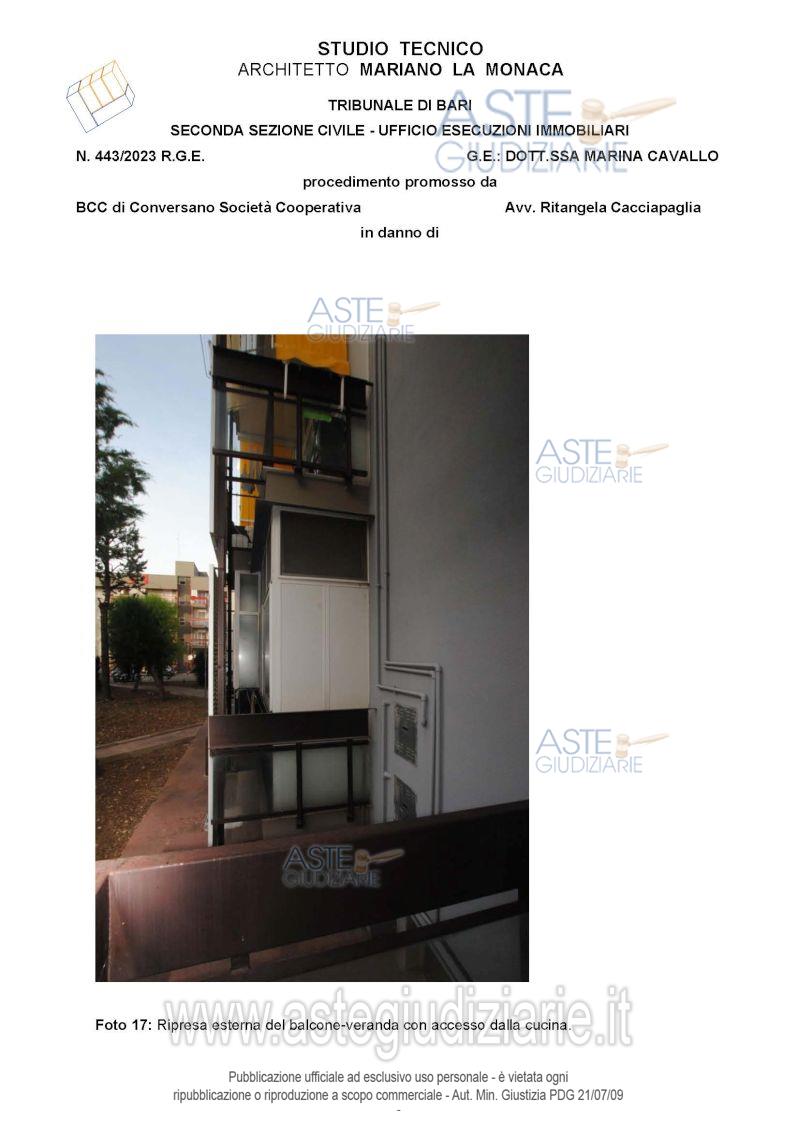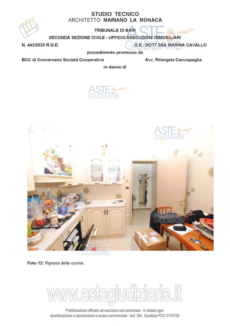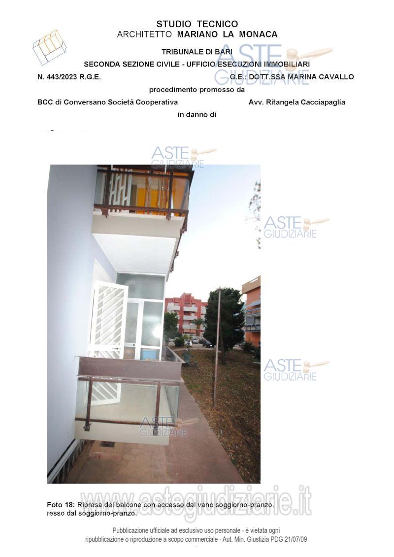 Vendita all'asta Senza incanto, con gara telematica asincrona - LOTTO UNICO: Appartamento per civile abitazione al piano rialzato composto di due vani e accessori, in particolare ingresso, corridoio, soggiorno-pranzo, camera da letto, cucina, bagno, balcone-veranda e balcone. Prezzo base € 70.000,00 (offerta minima € 52.500,00). Data inizio operazioni di vendita: 11/12/2025 ore 16:00. Giudice Dott. Marina Cavallo. Professionista delegato alla vendita Avv. Olimpia Pedota - Email "olimpia.pedota@libero.it". Custode Giudiziario Avv. Olimpia Pedota - Email "olimpia.pedota@libero.it". Rif. Tribunale di Bari - Espropriazione immobiliare (cartabia) n. 443/2023