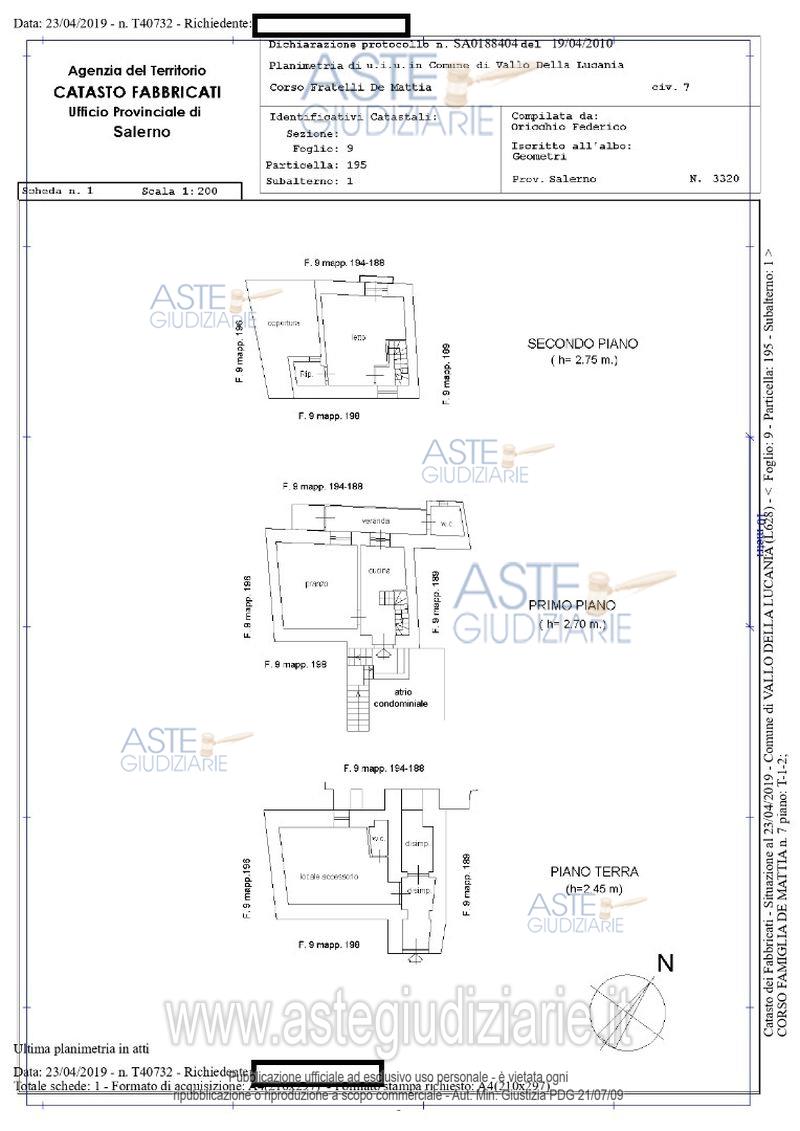 Vendita all'asta Senza incanto - LOTTO UNICO: Piena proprietà di un fabbricato raggiungibile dopo aver percorso un androne aperto che consente di accedere ad uno spazio destinato a corte condominiale, da dove è possibile entrare nell’immobile pignorato, costituito da un piano terra, un primo e secondo piano completati da una copertura a falde inclinate. Prezzo base € 68.637,00 (offerta minima € 51.478,13). Data vendita 21/11/2025 ore 16:00. Giudice Dott. Roberta Giglio. Professionista delegato alla vendita Avv. Umberto Salerno. Custode Giudiziario Avv. Umberto Salerno - Email "umbsal@alice.it"; Cell. 3921008307; Tel. 0974831219. Rif. Tribunale di Vallo della Lucania - Esecuzione immobiliare post legge 80 n. 58/2016
