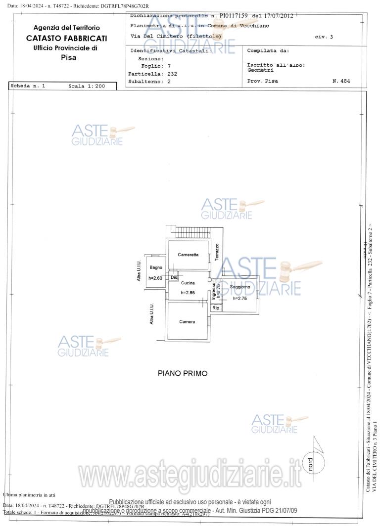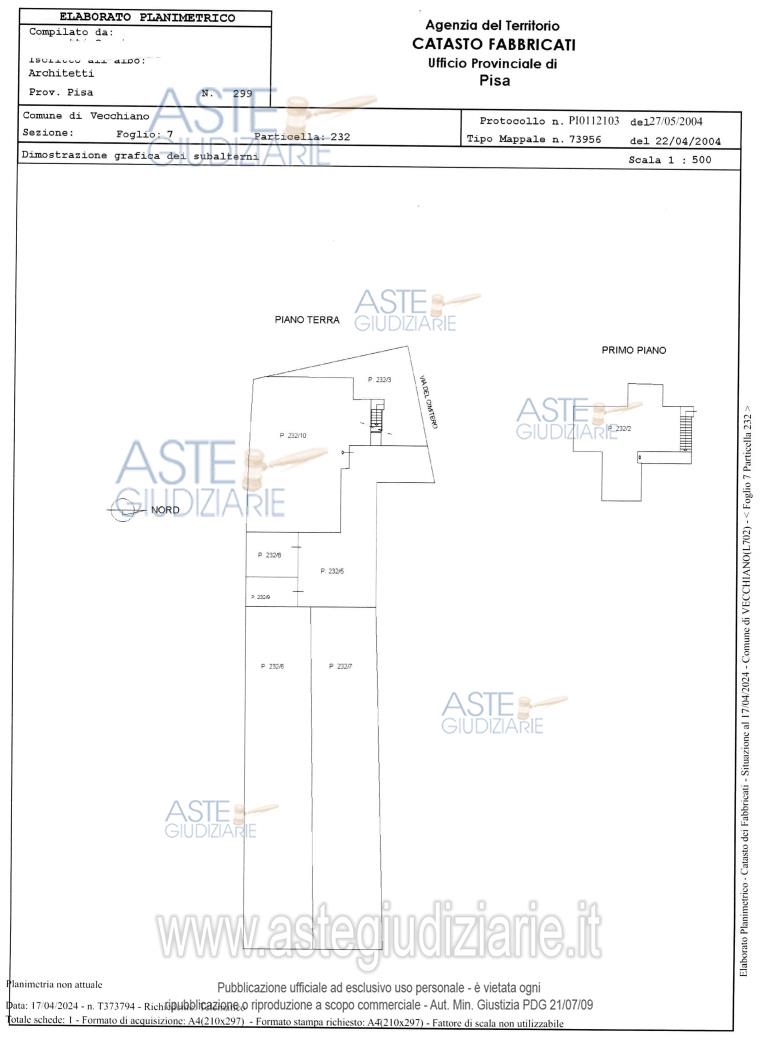 Vendita all'asta Senza incanto, con gara telematica asincrona - LOTTO UNICO: In Vecchiano (PI) - via del Cimitero: appartamento per civile abitazione posto al primo piano, secondo fuori terra, di un maggior fabbricato costituito da due unita` immobiliari. L’appartamento è composto da ingresso, ripostiglio, soggiorno, cucina, due camere e bagno. Sono annessi all'abitazione un locale garage posto al piano terra in posizione distaccata, un resede esclusivo che consente l'accesso dalla Via del Cimitero ed un'area scoperta pertinenziale all'abitazione confinante con il locale garage. Prezzo base € 120.000,00 (offerta minima € 90.000,00). Data inizio operazioni di vendita: 27/11/2025 ore 15:00. Giudice Laura Pastacaldi. Professionista delegato alla vendita Avv. Patrizia Pinto - Email "segreteria@susinipinto.com"; Tel. 05024786. Custode Giudiziario Dott. Cosimo Erriquez - Email "prenotazionipisa@astagiudiziaria.com"; Tel. 050554790. Rif. Tribunale di Pisa - Espropriazione immobiliare (cartabia) n. 213/2023