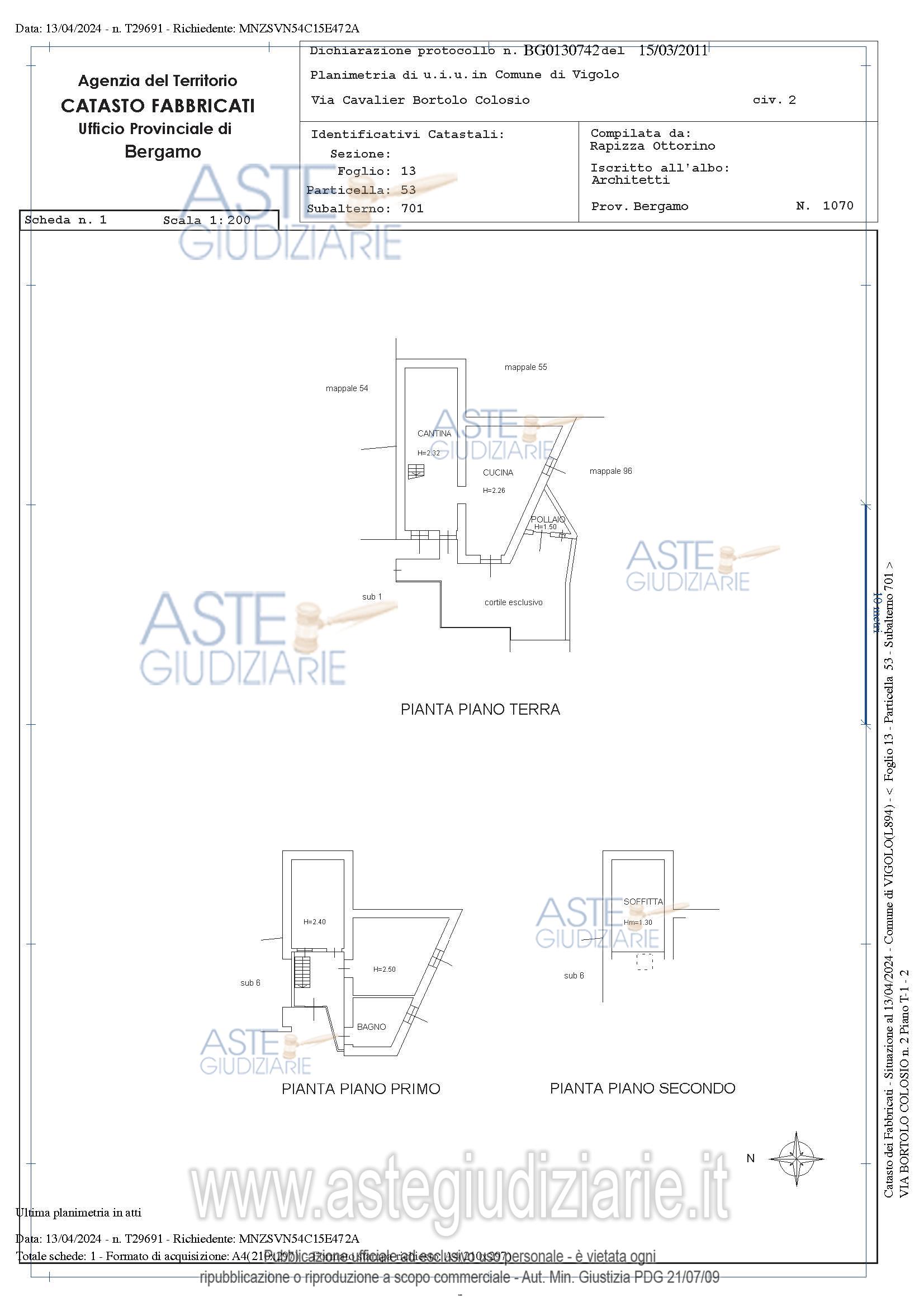Vendita all'asta Senza incanto, con gara telematica asincrona - LOTTO UNICO: Piena proprietà di unità abitativa ad uso residenziale, non di lusso, a cui si accede per mezzo di un camminamento pedonale a fondo chiuso, della superficie di circa 106 mq, disposta su tre livelli e composta: al piano terra da cucina, cantina e cortile, al piano primo da disimpegno, due camere e un bagno e al piano secondo da soffitta. L’unità immobiliare è sita nel Comune di Vigolo (BG), via Bortolo Colosio n.2 (secondo l’attuale toponomastica comunale via Campi n.10H). Stato di occupazione: libero. Prezzo base € 16.031,20 (offerta minima € 12.023,40). Data inizio operazioni di vendita: 25/02/2026 ore 16:00. Professionista delegato alla vendita Avv. Lodovico Valsecchi - Email "VALSECCHI@TUDAV.IT"; Cell. 035242213; Tel. 035242213. Custode Giudiziario Avv. Lodovico Valsecchi - Email "VALSECCHI@TUDAV.IT"; Cell. 035242213; Tel. 035242213. Rif. Tribunale di Bergamo - Espropriazione immobiliare (cartabia) n. 635/2023