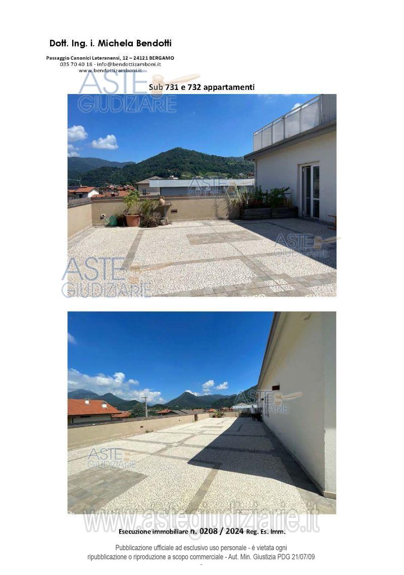 Vendita all'asta Senza incanto, con gara telematica asincrona - LOTTO UNICO: Trattasi di due appartamenti posti al piano secondo, in complesso commerciale, zona periferica del Comune di Villa d'alma. Entrambi hanno accesso dal vano scala comune. Il sub. 731 ha accesso dal BCNC sub. 733, terrazzo scoperto ed è suddiviso in disimpegno, cucina, soggiorno, camera, bagno. Il sub. 732 ha accesso dal vano scala comune ed è suddiviso in disimpegno, cucina con balcone, pranzo, soggiorno, camera, ripostiglio, bagno. Entrambi condividono il balcone comune. . Prezzo base € 205.000,00 (offerta minima € 153.750,00). Data inizio operazioni di vendita: 20/05/2026 ore 15:00. Giudice Dott. Luca Verzeni. Professionista delegato alla vendita Avv. Giulia Martini - Email "studiolegale@giuliamartini.it"; Tel. 035213033. Custode Giudiziario Dott. Paolo Pizzigoni - Email "paolo.pizzigoni@studiopizzigoni.com"; Tel. 035248605. Rif. Tribunale di Bergamo - Espropriazione immobiliare (cartabia) n. 208/2024