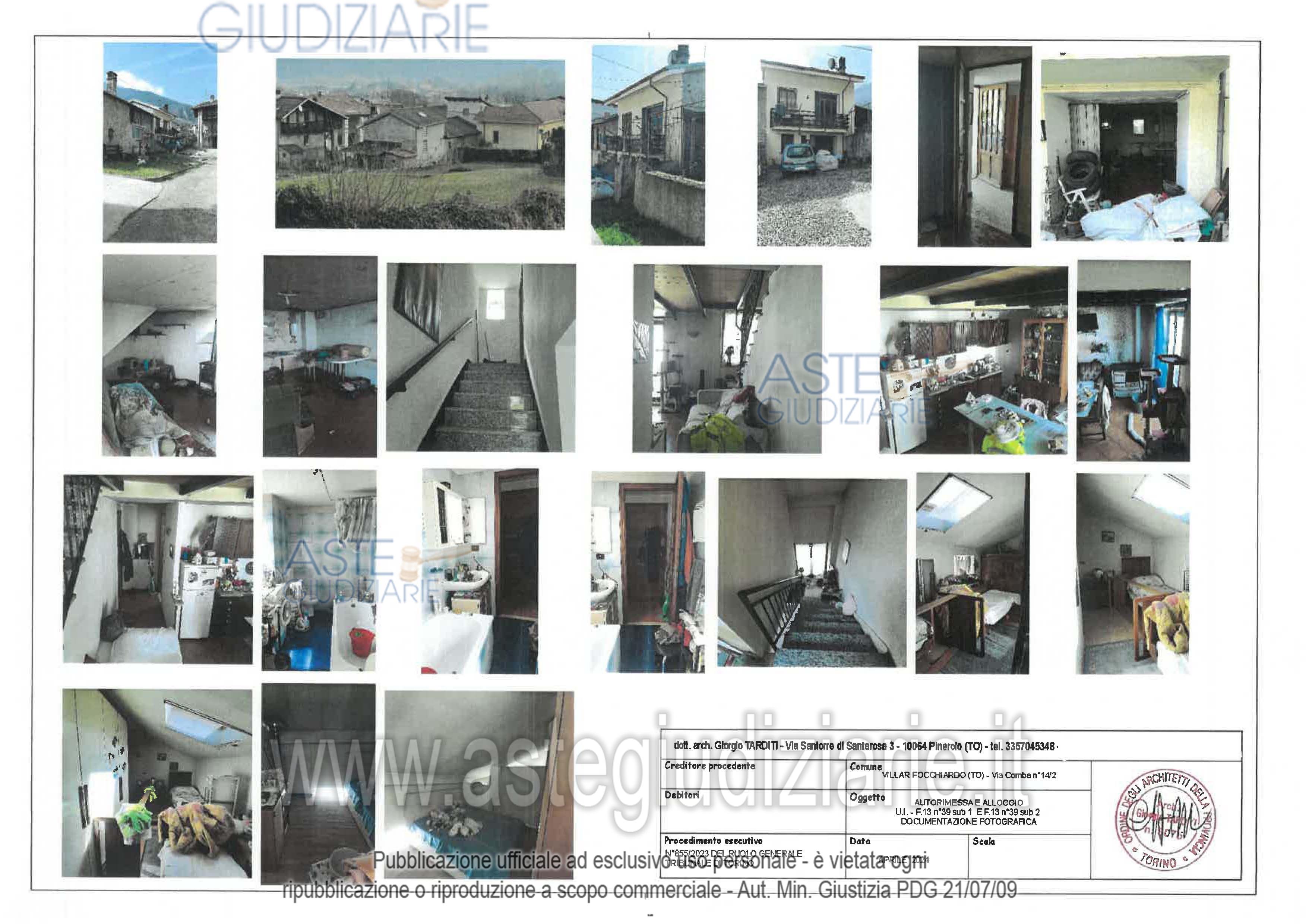 Vendita all'asta Senza incanto, con gara telematica asincrona - LOTTO UNICO: Fabbricato residenziale a Villar Focchiardo (TO), Via Comba 14/2, superficie commerciale 86,29 mq. Composto da due unità: autorimessa al piano terreno e alloggio su piano T-1-2 con cortile pertinenziale nel centro storico. Piano terra: ingresso, scala, cantina, autorimessa, cortile. Piano primo: scala, pianerottolo, soggiorno con angolo cottura, bagno, balcone. Piano secondo mansardato: scala e camere. Accesso da passo carraio su Via Comba attraverso terreni di terzi. Prezzo base € 15.000,00 (offerta minima € 11.250,00). Data inizio operazioni di vendita: 05/05/2026 ore 15:30. Giudice Rossella D'addato. Professionista delegato alla vendita Avv. Cristina Maria Volta - Email "cristinamaria.volta@libero.it". Custode Giudiziario Istituto Vendite Giudiziarie Ivg S.R.L - Email "richieste.visite@ivgpiemonte.it". Rif. Tribunale di Torino - Espropriazione immobiliare (cartabia) n. 855/2023