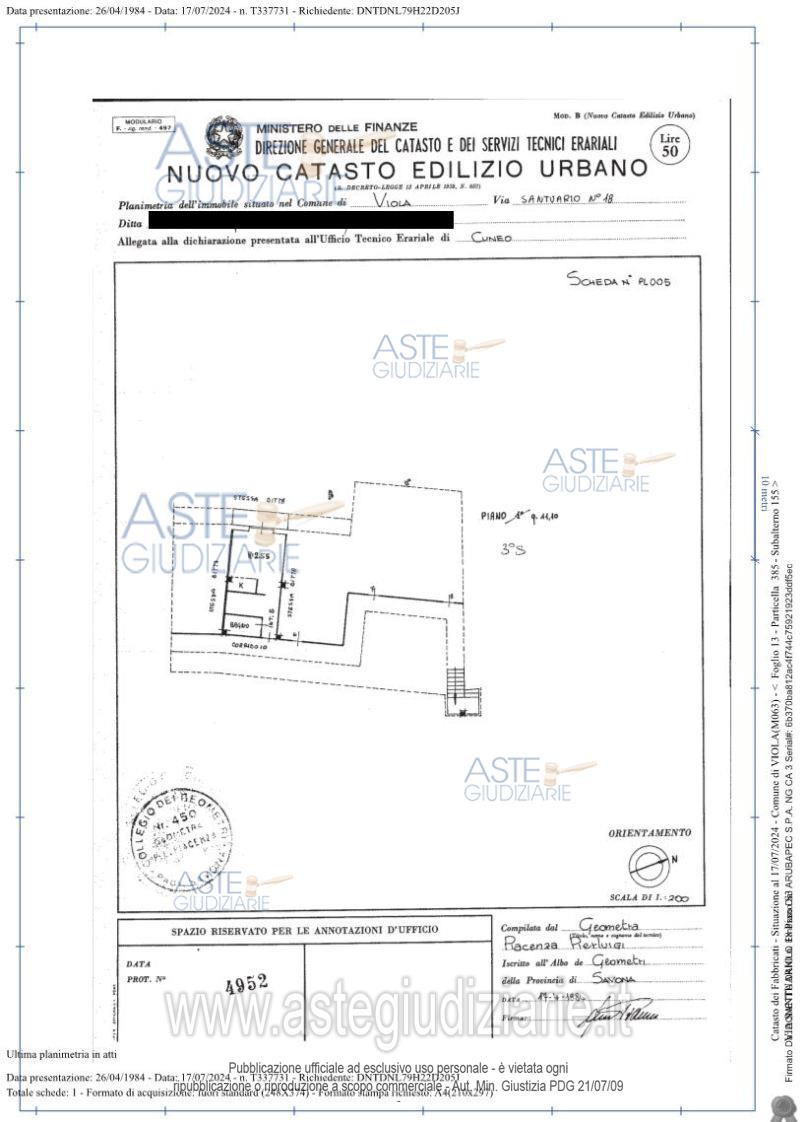 Vendita all'asta Senza incanto, con gara telematica asincrona - LOTTO UNICO: appartamento sito in Viola (Cn) Via Santuario n°18/5 posto al piano terzo sotterraneo adibito a monolocale composto da ingresso, servizio e locale soggiorno/camera oltre a balcone. Superficie di 36,45 mq. Prezzo base € 7.000,00 (offerta minima € 5.250,00). Data inizio operazioni di vendita: 21/10/2025 ore 11:00. Giudice Paola Elefante. Professionista delegato alla vendita Dott. Gian Matteo Rubiolo - Email "gian.matteo.rubiolo@gmail.com"; Tel. 0117497466. Custode Giudiziario Ifir Piemonte Ivg Srl - Email "richiestevisite.cuneo@ivgpiemonte.it"; Tel. 01711873923. Rif. Tribunale di Cuneo - Esecuzione immobiliare n. 79/2024