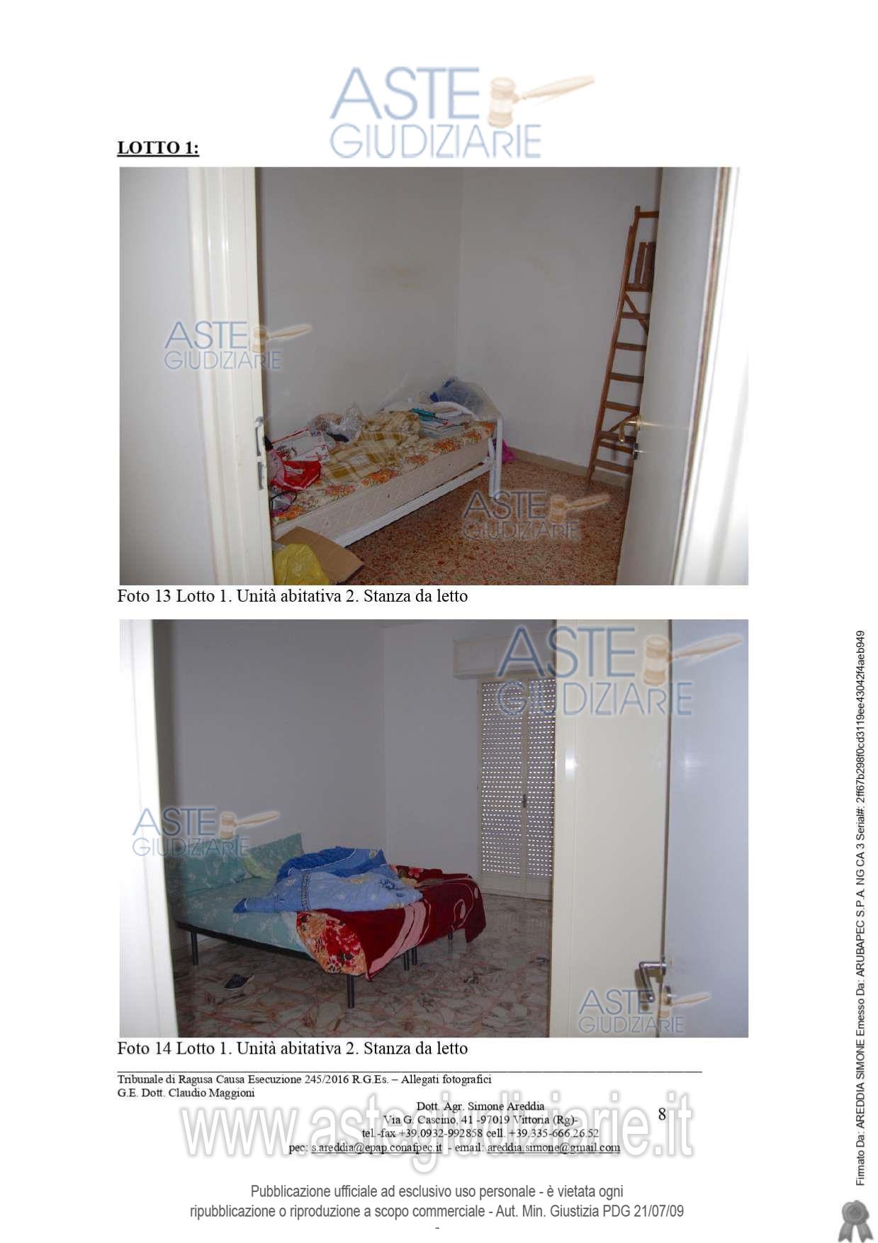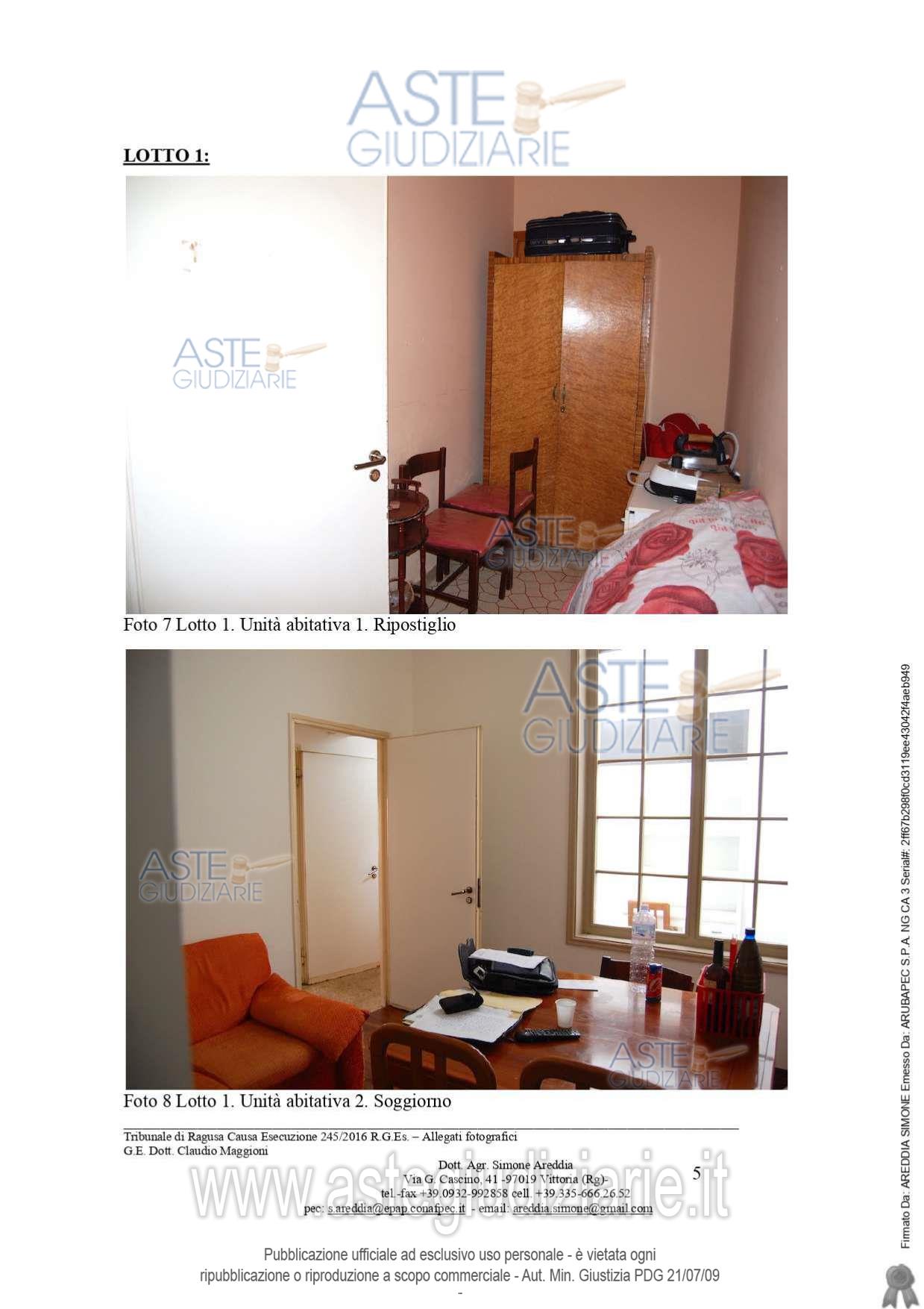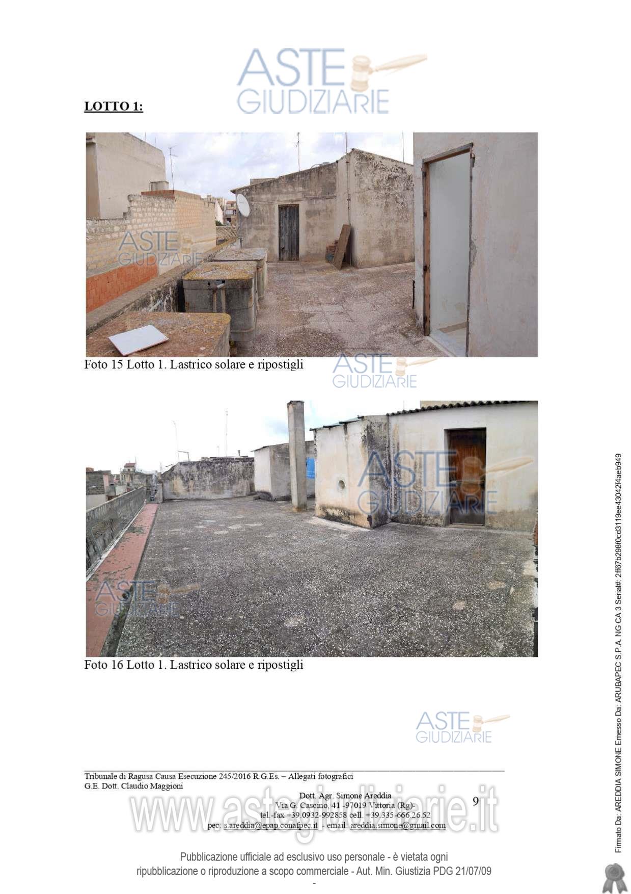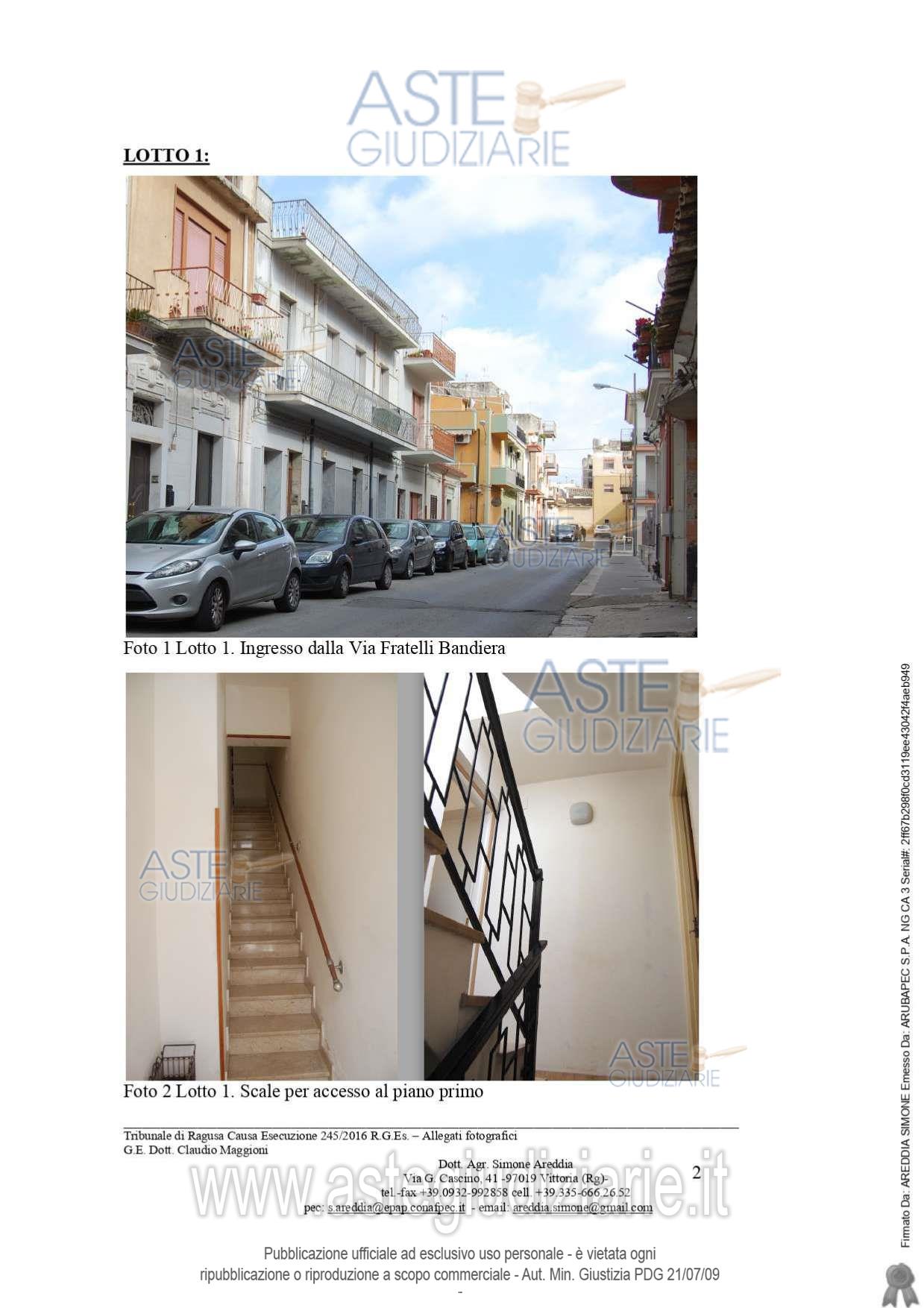 Vendita all'asta Senza incanto, con gara telematica sincrona mista - LOTTO 1: Piena proprietà di un appartamento costituito da 2 unità immobiliari al piano primo (per un totale di 9 vani) e lastrico solare al piano secondo, siti in Vittoria, Via Fratelli Bandiera 21; NCEU foglio 212, p.lle 7760 subb. 2 e 3. L’app.to è al p.1 con ingresso al piano terra (per una superficie netta abitabile di 128,29 mq); il lastrico solare (per una superficie calpestabile di 129,55 mq) con ripostigli (per una superficie lorda di 26,06 mq), è situato al piano secondo. Prezzo base € 38.981,00 (offerta minima € 29.236,00). Data vendita 07/05/2026 ore 16:00. Giudice Francesco Rio. Professionista delegato alla vendita Avv. Serafino Alfano - Email "avv.serafinoalfano@gmail.com"; Cell. 3928488519. Custode Giudiziario Serafino Alfano - Email "avv.serafinoalfano@gmail.com". Rif. Tribunale di Ragusa - Esecuzione immobiliare post legge 80 n. 245/2016