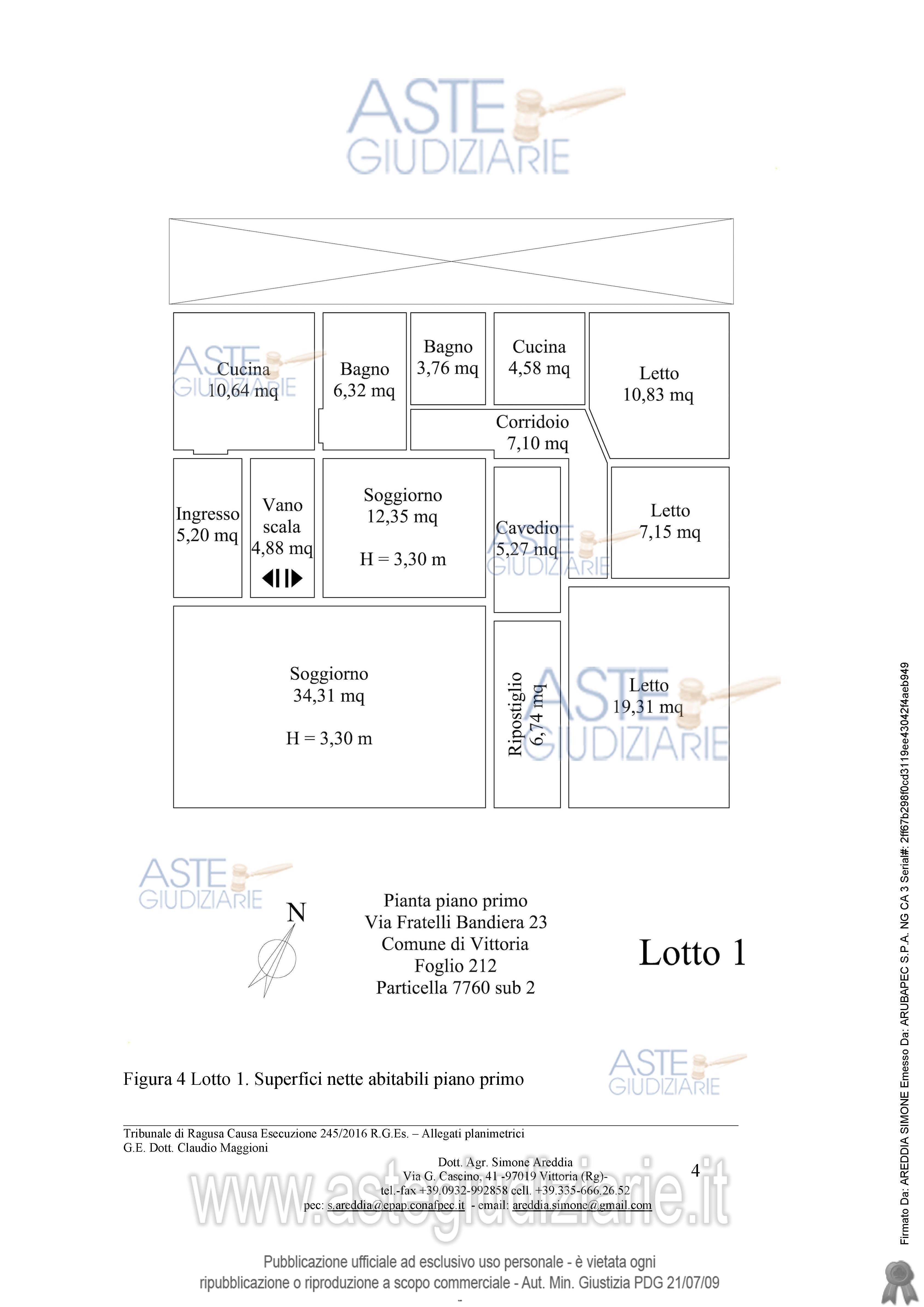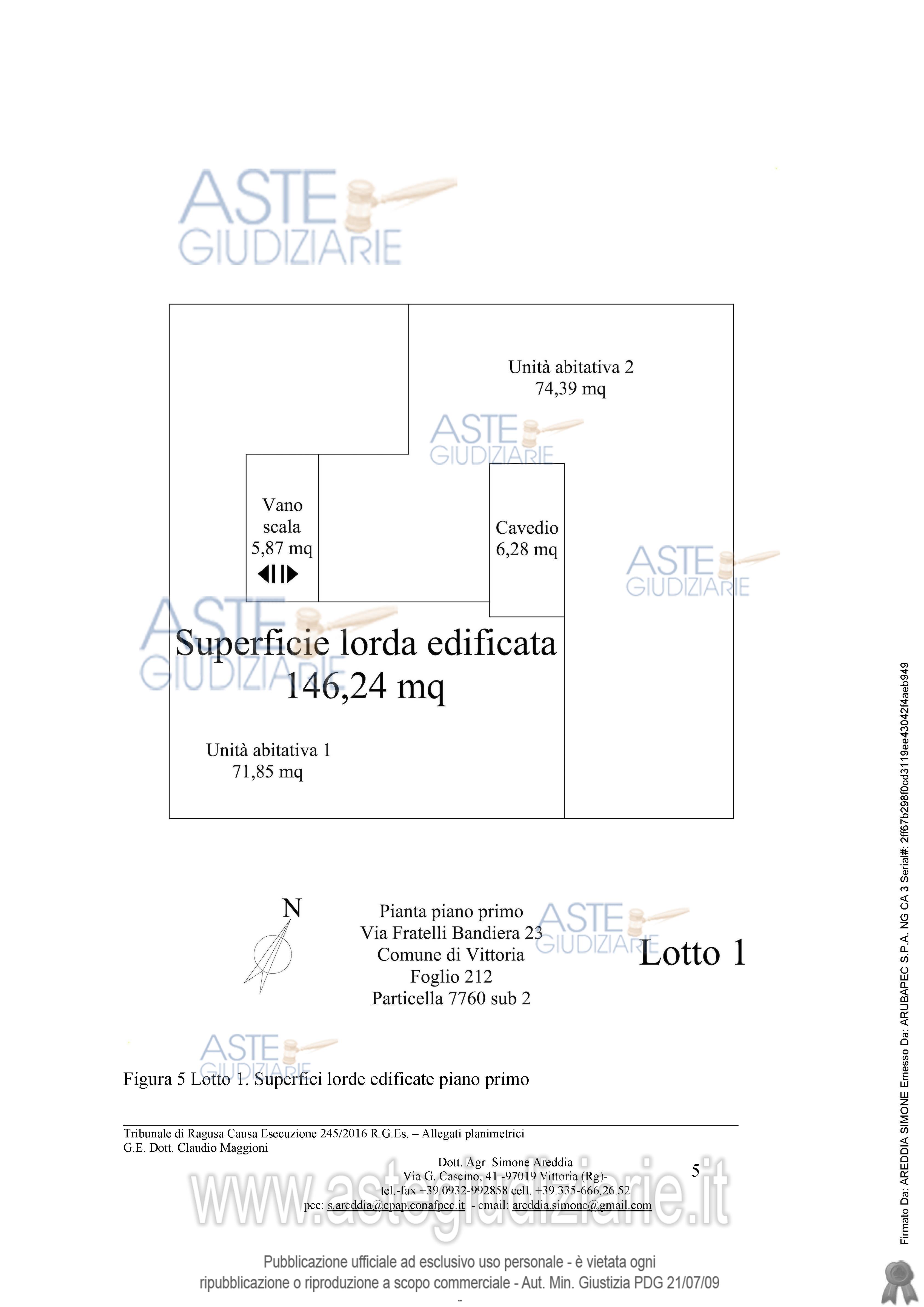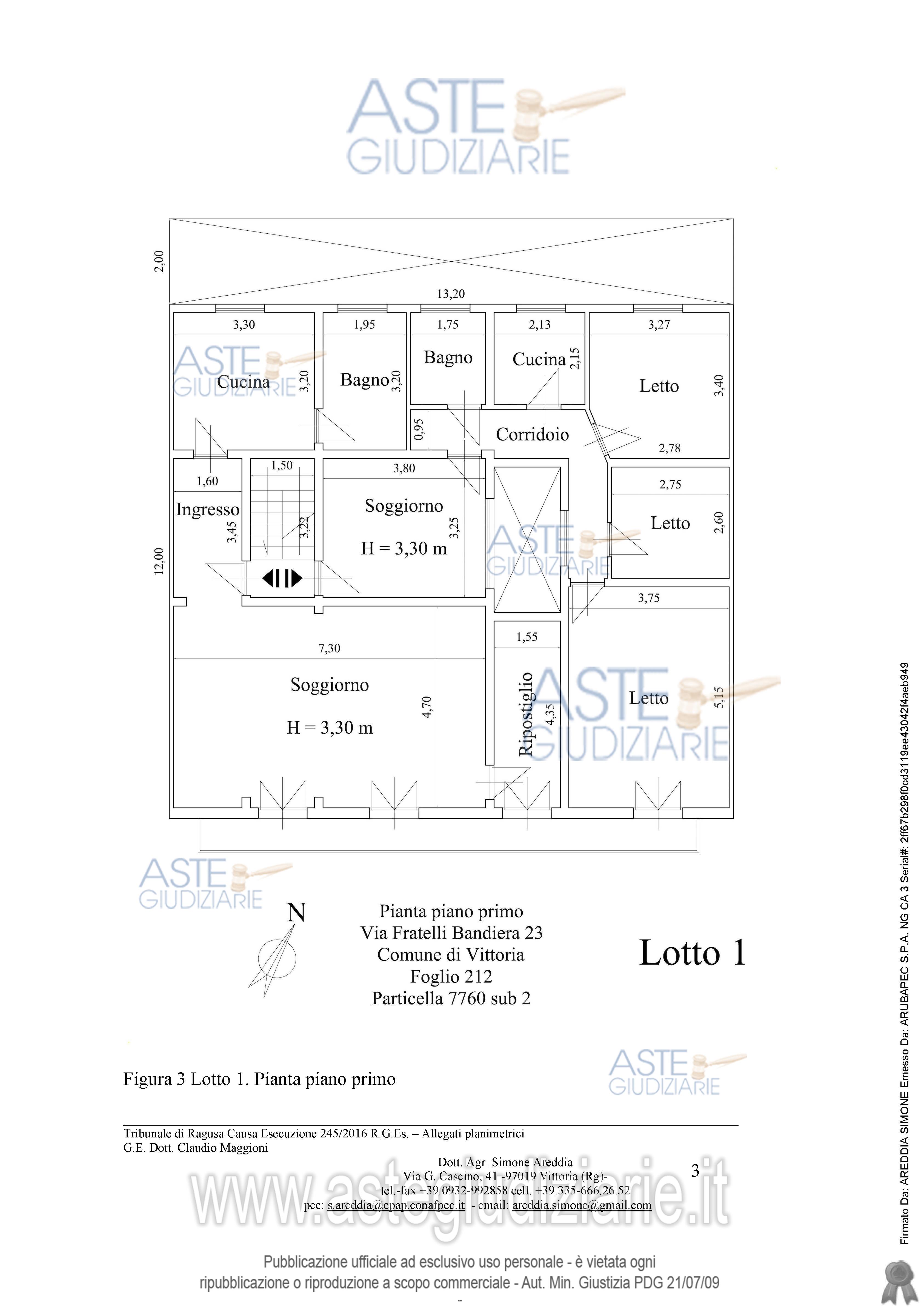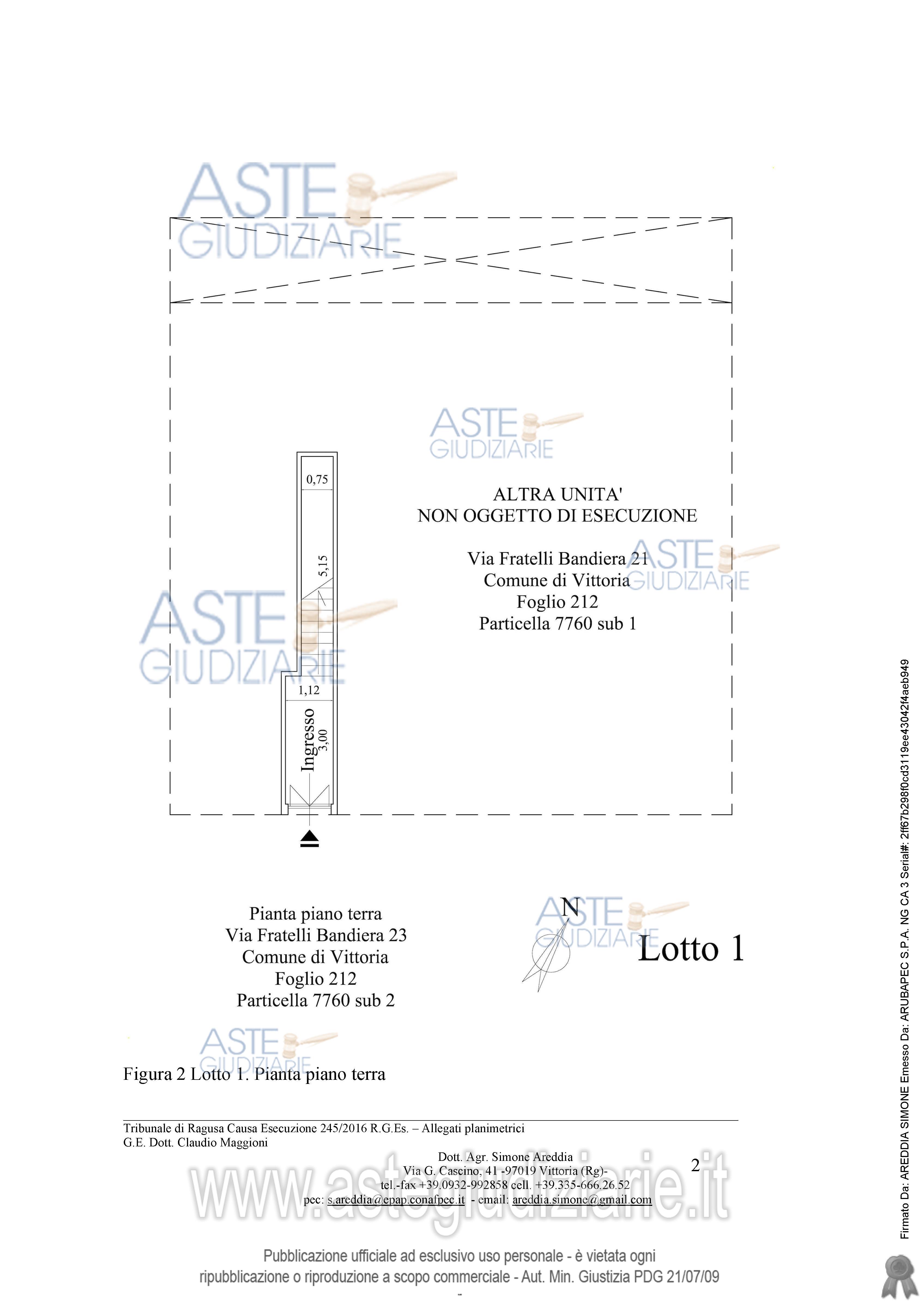 Vendita all'asta Senza incanto, con gara telematica sincrona mista - LOTTO 1: Piena proprietà di un appartamento costituito da 2 unità immobiliari al piano primo (per un totale di 9 vani) e lastrico solare al piano secondo, siti in Vittoria, Via Fratelli Bandiera 21; NCEU foglio 212, p.lle 7760 subb. 2 e 3. L’app.to è al p.1 con ingresso al piano terra (per una superficie netta abitabile di 128,29 mq); il lastrico solare (per una superficie calpestabile di 129,55 mq) con ripostigli (per una superficie lorda di 26,06 mq), è situato al piano secondo. Prezzo base € 38.981,00 (offerta minima € 29.236,00). Data vendita 07/05/2026 ore 16:00. Giudice Francesco Rio. Professionista delegato alla vendita Avv. Serafino Alfano - Email "avv.serafinoalfano@gmail.com"; Cell. 3928488519. Custode Giudiziario Serafino Alfano - Email "avv.serafinoalfano@gmail.com". Rif. Tribunale di Ragusa - Esecuzione immobiliare post legge 80 n. 245/2016