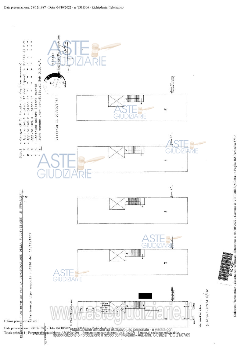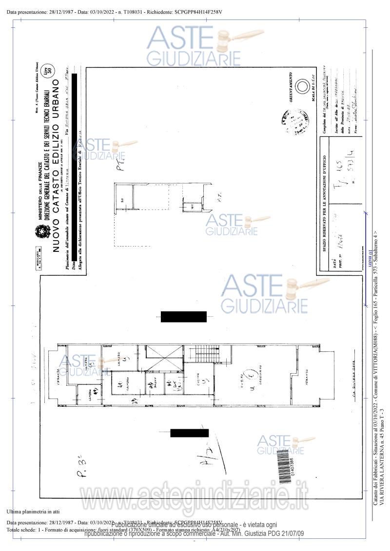 LOTTO 6: Propriété pleine et parfaite du regroupement immobilier composé d'un appartement à usage d'habitation civile situé au troisième étage et d'un débarras et d'une salle de bains au rez-de-chaussée, faisant partie du plus grand bâtiment, situé dans la fraction Scoglitti, avec accès depuis la Via Riviera Gela n. 45-46. Quote-partie indivise équivalente à 1/3 (un tiers) de la pleine et entière propriété de l'emplacement du garage au rez-de-chaussée et de la toiture du troisième étage. Ultimo prezzo base € 194.486,93 (offerta minima € 194.486,93). Vente en attente de l’émission d’un avis nouveau. Giudice Dott. Carlo Di Cataldo. Professionista delegato alla vendita Dott. Giuseppe Buscema. Rif. Tribunale di Ragusa - Liquidazione del patrimonio del debitore n. 1837/2015
