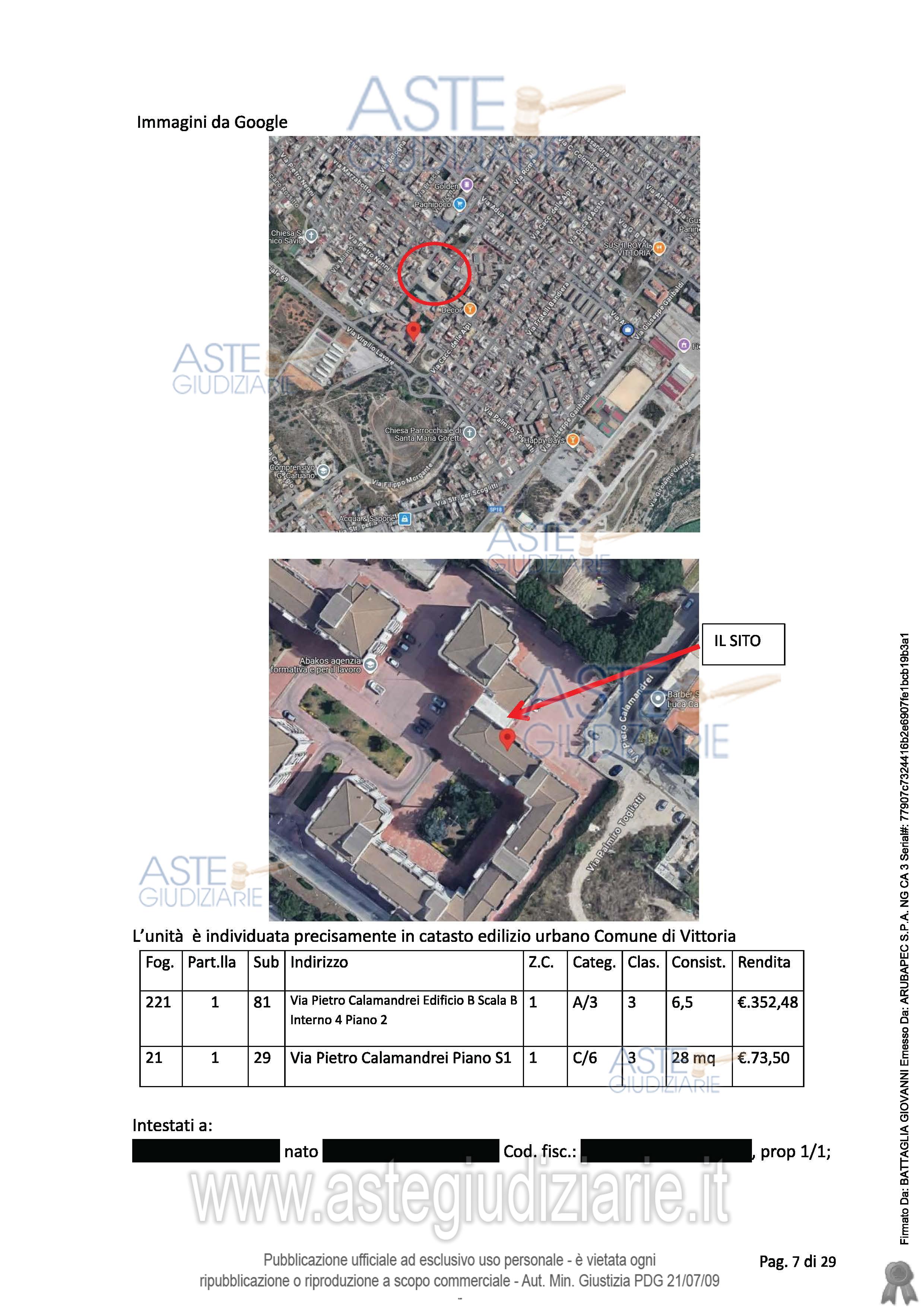 Vendita all'asta Senza incanto, con gara telematica sincrona mista - LOTTO UNICO: L’immobile è un’abitazione ad uso residenziale posta al secondo piano di un fabbricato condominiale, ubicata in Vittoria (RG) - 97019, in Via Pietro Calamandrei n. 86, edificio B, scala B interno 4. L’appartamento è composto da un ingresso, soggiorno, cucina, ripostiglio, due bagni, due camerette, camera matrimoniale, corridoio, balcone e garage a piano scantinato. Prezzo base € 40.950,00 (offerta minima € 30.712,50). Data vendita 24/03/2026 ore 11:30. Giudice Dott. Antonio Pianoforte. Professionista delegato alla vendita Dott. Maria Cannata. Custode Giudiziario Dott. Maria Cannata - Email "studio.cannatamaria@virgilio.it". Rif. Tribunale di Ragusa - Espropriazione immobiliare (cartabia) n. 233/2024