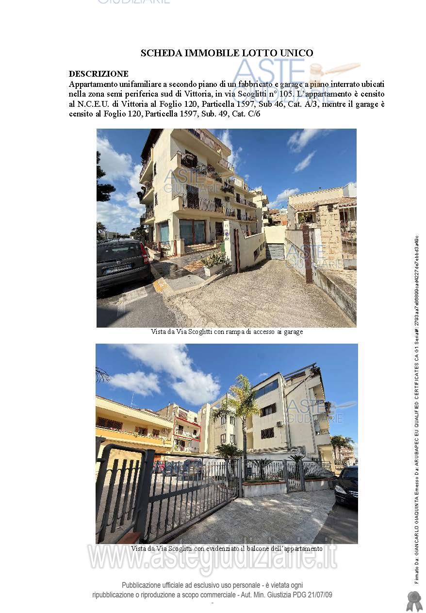Vendita all'asta Senza incanto, con gara telematica sincrona mista - LOTTO UNICO: Appartamento unifamiliare posto al secondo piano di un fabbricato con ascensore e di un garage posto al piano interrato ubicati a Vittoria (RG), in via Scoglitti n° 105. Prezzo base € 51.412,50 (offerta minima € 38.559,37). Data vendita 09/04/2026 ore 10:00. Giudice Dott. Carlo Di Cataldo. Professionista delegato alla vendita Dott. Michelangelo Aurnia - Email "michelangeloaurnia@yahoo.it". Custode Giudiziario Dott. Michelangelo Aurnia - Email "michelangeloaurnia@yahoo.it"; Tel. 0932761651. Rif. Tribunale di Ragusa - Espropriazione immobiliare (cartabia) n. 250/2024
