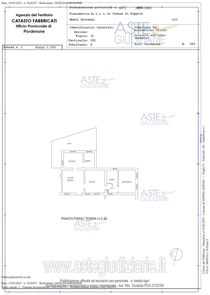 Vendita all'asta Senza incanto, con gara telematica sincrona - LOTTO UNICO: Appartamento al piano terra, facente parte di un fabbricato a tipologia abitativa bifamiliare verticale e si compone di pranzo/cucina bagno, camera/ stireria, altro bagno e camera. All’esterno vi è una corte comune con accesso alla via pubblica denominata via Monti; sulla parte retrostante dell’immobile esiste un’area verde, di proprietà esclusiva, di ridotte dimensioni. L’immobile è dotato di garage coperto, ma senza portone di chiusura. Prezzo base € 40.460,00 (offerta minima € 30.345,00). Data vendita 14/11/2025 ore 15:00. Giudice Dott. Antonio Albenzio. Professionista delegato alla vendita Avv. Tiziano Borlina - Email "avv.borlina@studioborlina.it"; Tel. 0434560730. Custode Giudiziario Avv. Tiziano Borlina - Email "avv.borlina@studioborlina.it"; Tel. 0434560730. Rif. Tribunale di Pordenone - Espropriazione immobiliare (cartabia) n. 121/2024