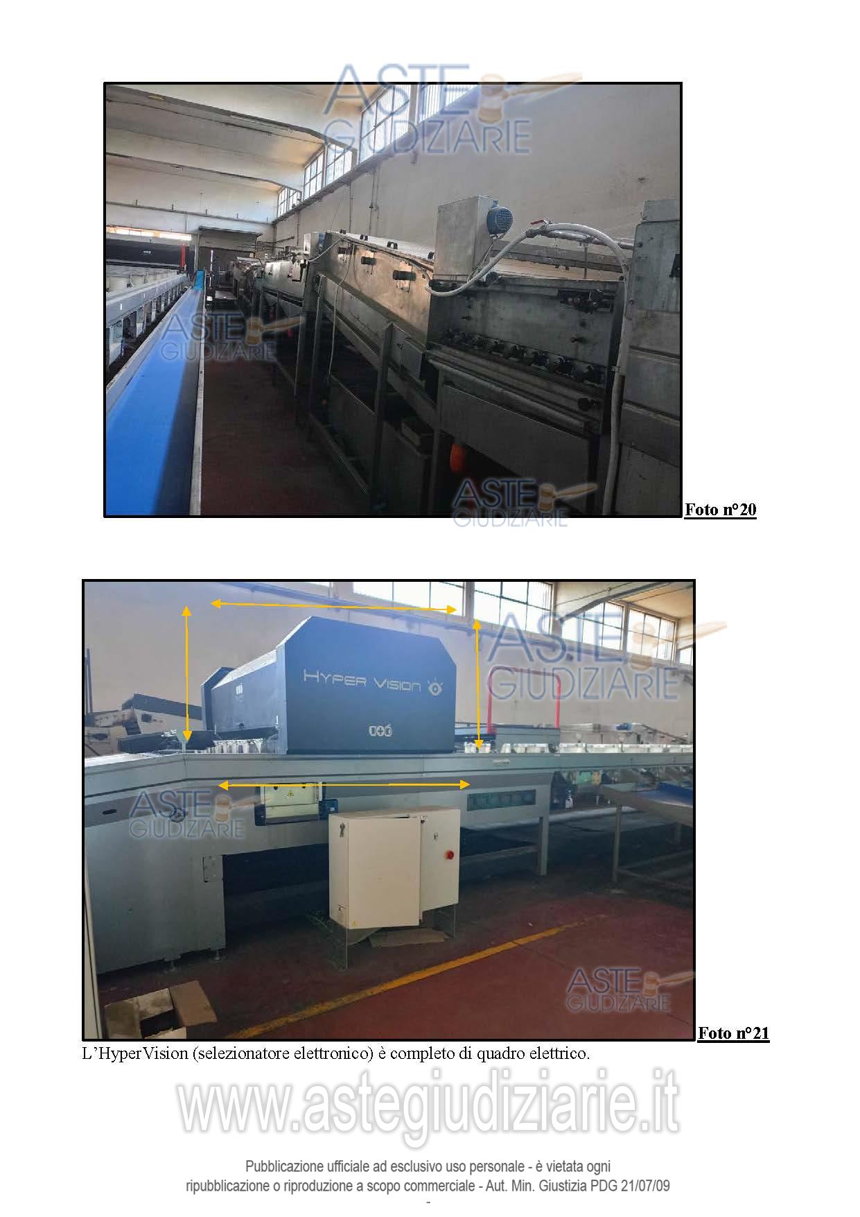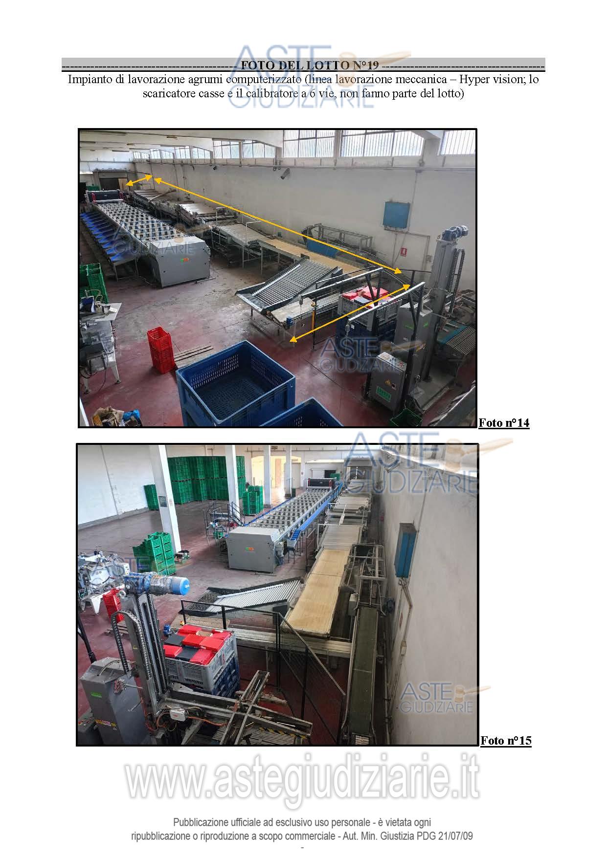 Vendita all'asta Senza incanto, con gara telematica sincrona mista - LOTTO 16: IMPIANTO DI LAVORAZIONE AGRUMI computerizzato (linea lavorazione meccanica + HyperVision) (lotto n.19 perizia n.2) escluso macchinario per la spazzolatura/ceratura e vasca lavaggi inox tipo Drencher . Prezzo base € 135.000,00 (offerta minima € 101.250,00). Data vendita 27/05/2026 ore 17:30. Giudice: Dott. Oriana Calvo.