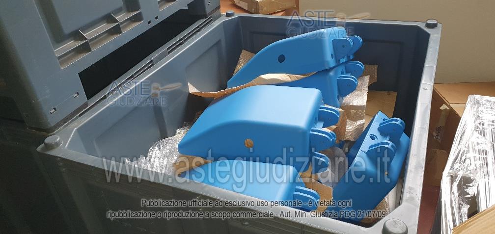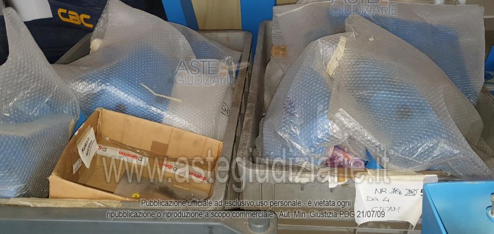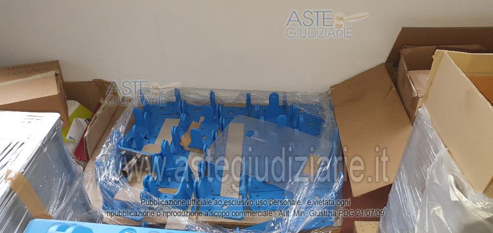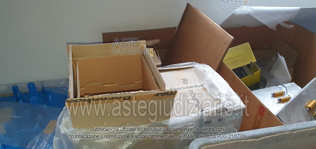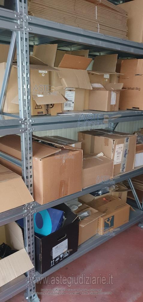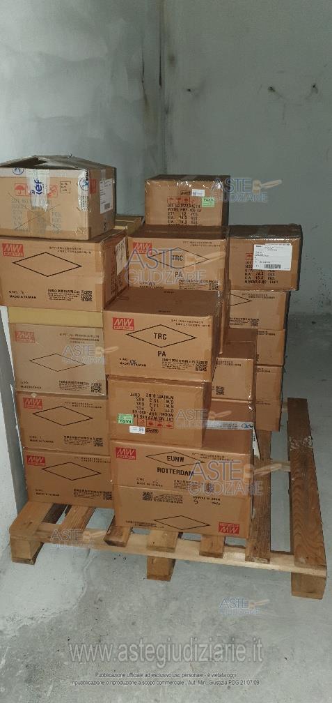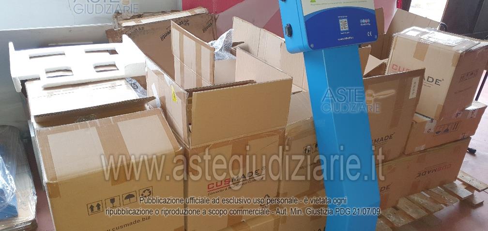 - 16 bancali di materiale vario: scatole gusci, basamenti, cavi vari, stoffe, componenti delle colonnine di ricarica