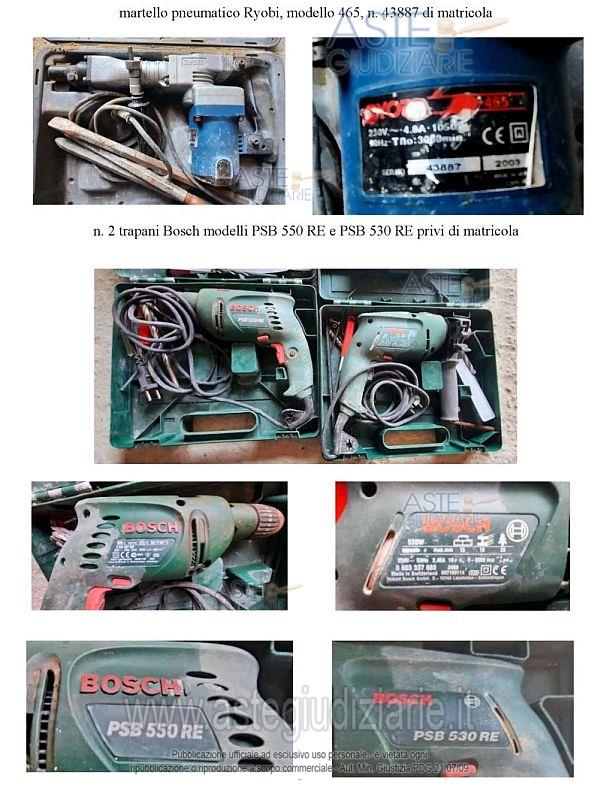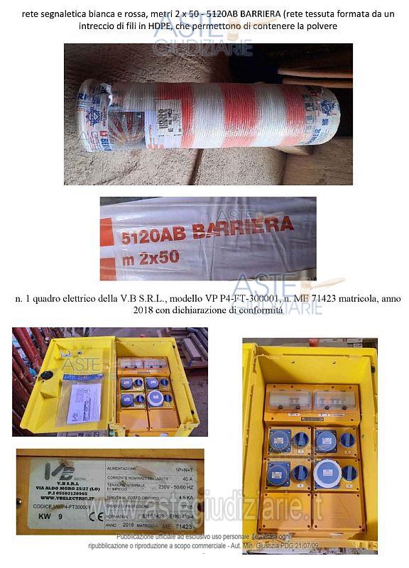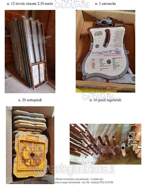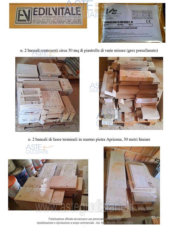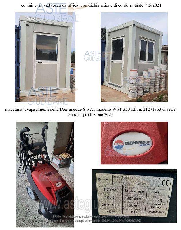 Vendita all'asta Senza incanto, con gara telematica asincrona - LOTTO Unico: N. 1 container monoblocco da ufficio con dichiarazione di conformità del 4.5.2021; N. 1 macchina lavapavimenti della Diemmedue S.p.A., modello WET 350 EL, n. 21271363 di serie, anno di produzione 2021; N. 6 tavoloni in legno da 1,30 metri; N. 14 terminali di spalliera; N. 31 bastoni orizzontali; N. 7 bastoni diagonali; N. 6 mensole a sbalzo; N. 7 cancelletti; N. 20 ancoraggi a L per fermo ponteggio; N. 20 occhielli per fermo ponteggio; N. 12 tavole zincate 2,50 metri; N. 1 carrucola; N. 20 sottopiedi; N. 16 piedi regolabili; N. 20 cavalletti da ponteggio; N. 4 cavalletti da muratore per interno; N. 2 pale; N. 1 argano per ponteggi con bandiera girevole (montacarichi) della Imer, modello AP 120 con portata massima 120 kg e matricola abrasa e non identificabile; N. 2 cinture di sicurezza da lavoro; N. 1 martello pneumatico Bosch, modello HT-2L-26, 230 V, 50 hz, 1800 W, primo di matricola; N. 1 martello pneumatico Ryobi, modello 465, n. 43887 di matricola; N. 2 trapani Bosch modelli PSB 550 RE e PSB 530 RE privi di matricola; N. 1 cassetta attrezzi; N. 2 flessibili di cui uno marca Hitachi, modello G 23SR e uno marca Star; N. 1 impastatore marca Rubimix-N Plus Professional 9, 1000 W;N. 1 rete segnaletica bianca e rossa, metri 2 x 50 - 5120AB BARRIERA (rete tessuta formata da un intreccio di fili in HDPE, che permettono di contenere la polvere);N. 1 quadro elettrico della V.B S.R.L., modello VP P4-FT-300001, n. ME 71423 matricola, anno 2018 con dichiarazione di conformità; N. 2 bancali contenenti circa 30 mq di piastrelle di varie misure (gres porcellanato); N. 2 bancali di fasce terminali in marmo pietra Apricena, 30 metri lineare; N. 2 bancali di pittura acrilica Licata coat per esterni di varie colorazioni di cui n. 35 semilavorati e 18 integri. Prezzo base € 8.400,00 (offerta minima € 6.300,00). Data inizio operazioni di vendita: 11/05/2026 ore 11:00. In caso di più offerte valide si procederà a gara che terminerà il 18/05/2026 ore 11:00. Giudice Dott. Maria Azzurra Guerra. Curatore Avv. Cecilia Tedone - Email "avv.ceciliatedone@gmail.com". Rif. Tribunale di Trani - Liquidazione giudiziale(cci) n. 24/2025