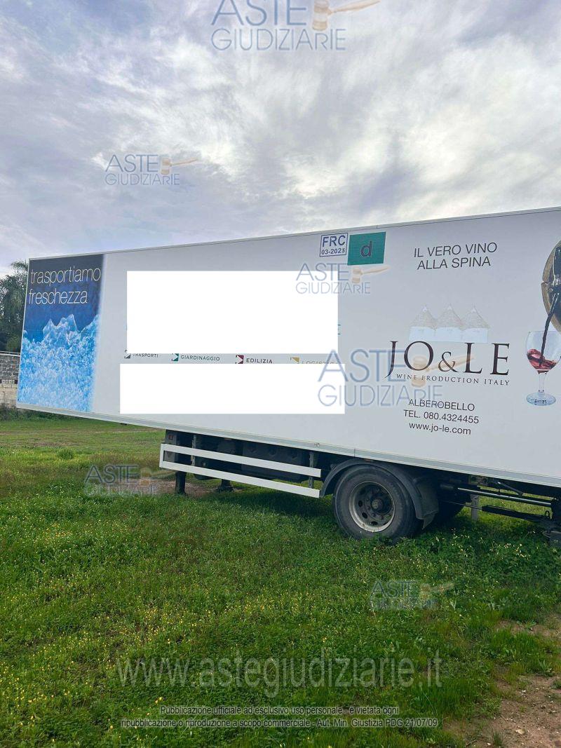 Vendita all'asta Senza incanto, con gara telematica asincrona - LOTTO UNICO: Semirimorchio per trasporto specifico Bartoletti con furgone isotermico con gruppo refrigerante e sponda posteriore caricatrice, TG AF53430, I immatricolazione 11/6/2010; non marciante (chiavi non disponibili; kilometraggio non disponibile: ATP SCADUTO). Prezzo base € 8.000,00 (offerta minima € 8.000,00). Data inizio operazioni di vendita: 16/02/2026 ore 15:30. Giudice Dott. Paola Cesaroni. Curatore Avv. Paola Merico - Email "paola.merico@studioaugusto.it". Rif. Tribunale di Bari - Liquidazione giudiziale(cci) n. 125/2024