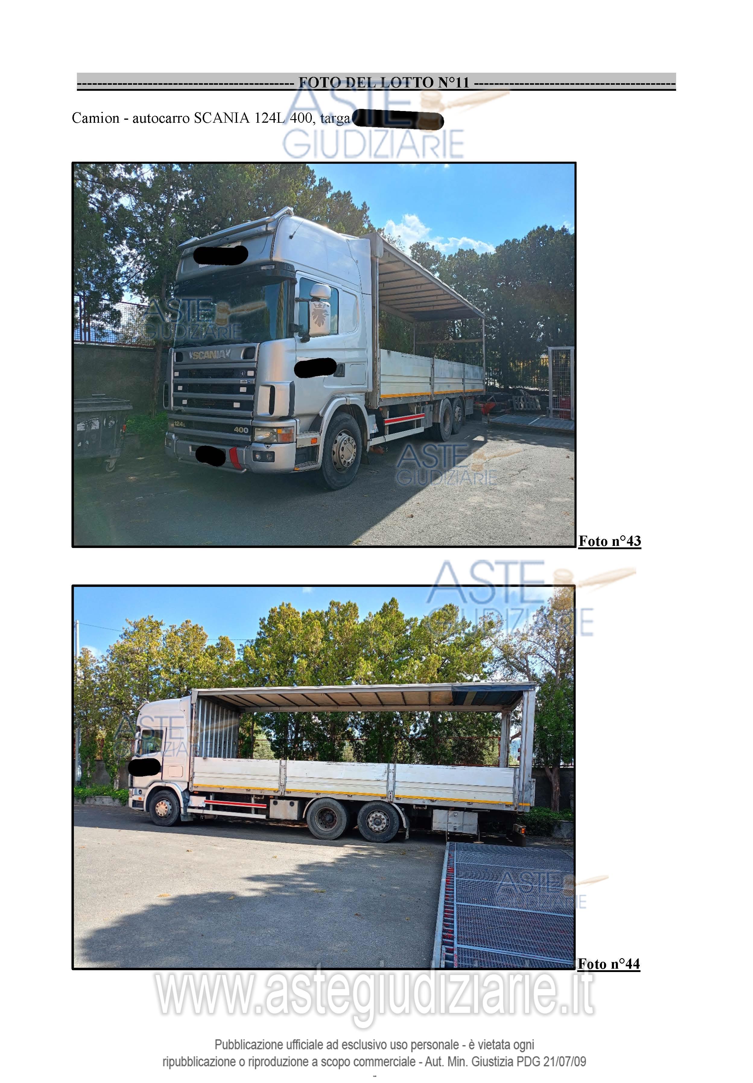 Vendita all'asta Senza incanto, con gara telematica sincrona mista - LOTTO 11: AUTOCARRO Scania 124L 400 (lotto n.11 perizia n.1). Prezzo base € 8.000,00 (offerta minima € 6.000,00). Data vendita 27/05/2026 ore 17:30. Giudice: Dott. Oriana Calvo.