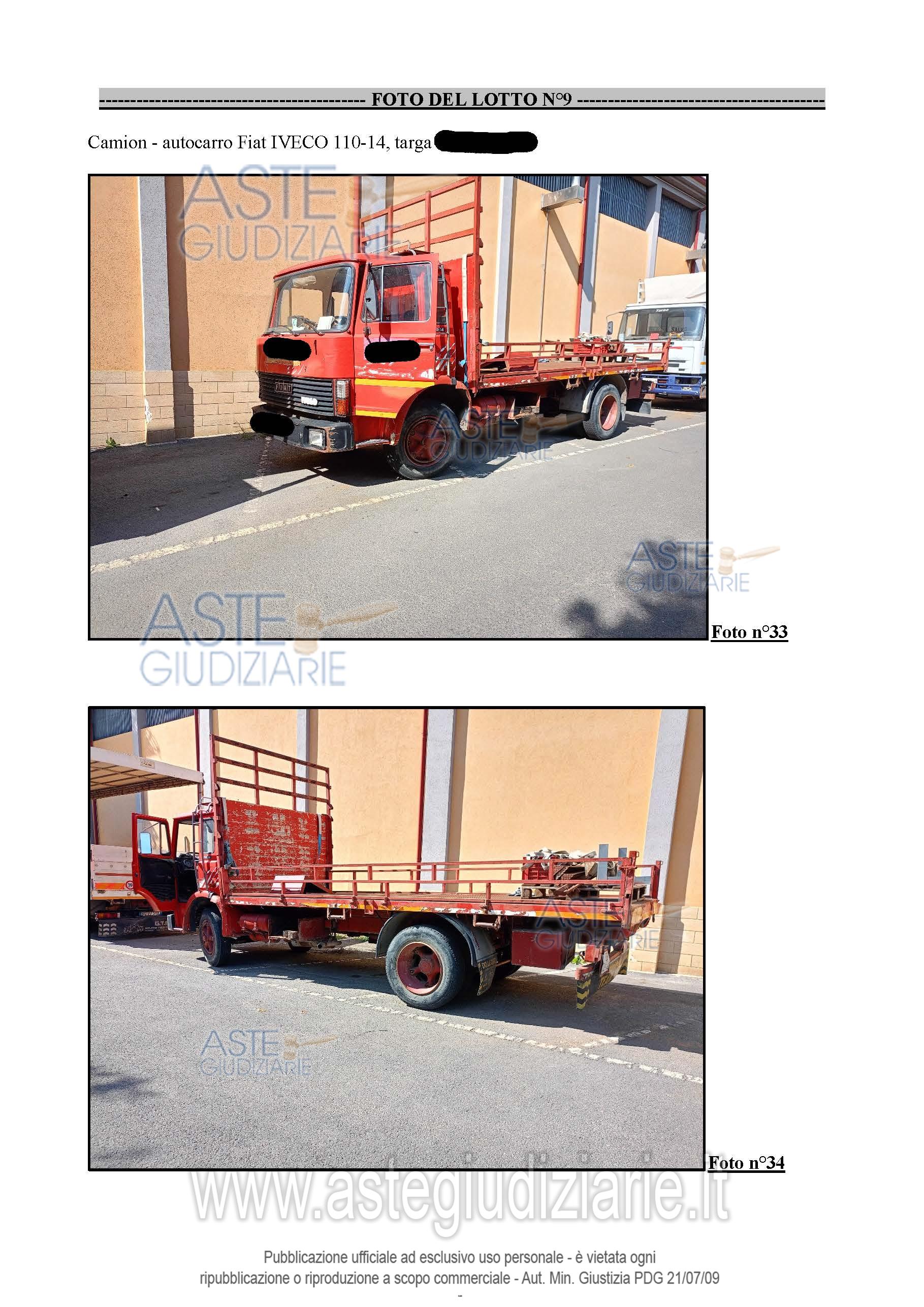 Vendita all'asta Senza incanto, con gara telematica sincrona mista - LOTTO 9: AUTOCARRO Fiat Iveco 110-14 (lotto n.9 perizia n.1). Prezzo base € 1.000,00 (offerta minima € 750,00). Data vendita 27/05/2026 ore 17:30. Giudice: Dott. Oriana Calvo.