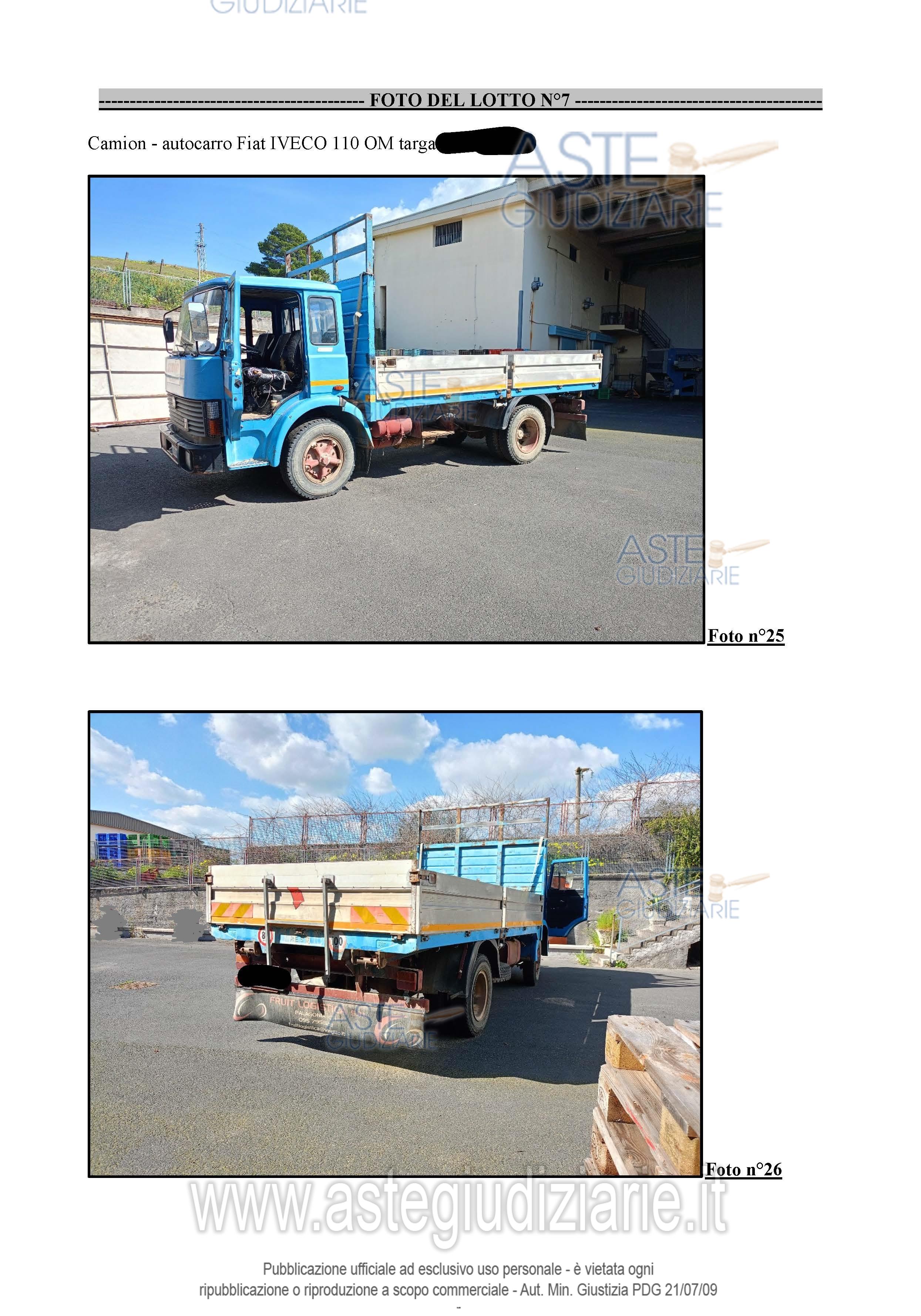 Vendita all'asta Senza incanto, con gara telematica sincrona mista - LOTTO 7: AUTOCARRO Fiat Iveco 110 OM (lotto n.7 perizia n.1). Prezzo base € 1.000,00 (offerta minima € 750,00). Data vendita 27/05/2026 ore 17:30. Giudice: Dott. Oriana Calvo.