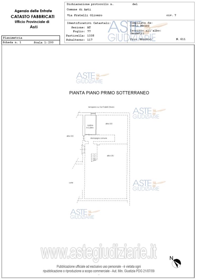 Vendita all'asta Senza incanto, con gara telematica asincrona - LOTTO 2: Piena proprietà di cantina a piano primo sotterraneo. Prezzo base € 1.000,00 (offerta minima € 750,00). Data inizio operazioni di vendita: 21/05/2026 ore 16:00. Giudice Laura Brizi. Professionista delegato alla vendita Avv. Carlotta Binello - Email "carlotta.binello@gmail.com"; Tel. 0141324725. Custode Giudiziario Ifir Piemonte Ivg Srl - Email "richiestevisite.asti@ivgpiemonte.it". Rif. Tribunale di Asti - Espropriazione immobiliare (cartabia) n. 158/2023