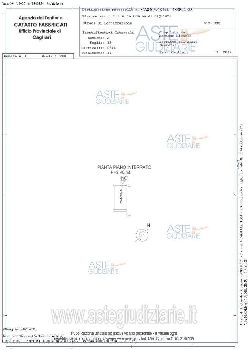 Vendita all'asta Senza incanto, con gara telematica asincrona - LOTTO 32: Quota pari all’intero del diritto di proprietà di una cantina chiudibile con porta metallica ubicata al piano interrato e distinto al CF Foglio A/13 Mapp. 2344, sub 17 Cat. C/2, classe 2, sup. cat 8 mq, rendita € 57,84=. Prezzo base € 4.000,00 (offerta minima € 3.000,00). Data inizio operazioni di vendita: 19/11/2025 ore 15:00. Giudice Silvia Cocco. Professionista delegato alla vendita Avv. Laura Fagioli - Email "avv.laura.fagioli@tiscali.it"; Tel. 0704510261. Custode Giudiziario Ivg Cagliari - Email "ivg.visiteimmobili@tiscali.it"; Tel. 0702299036. Rif. Tribunale di Cagliari - Esecuzione immobiliare post legge 80 n. 270/2017
