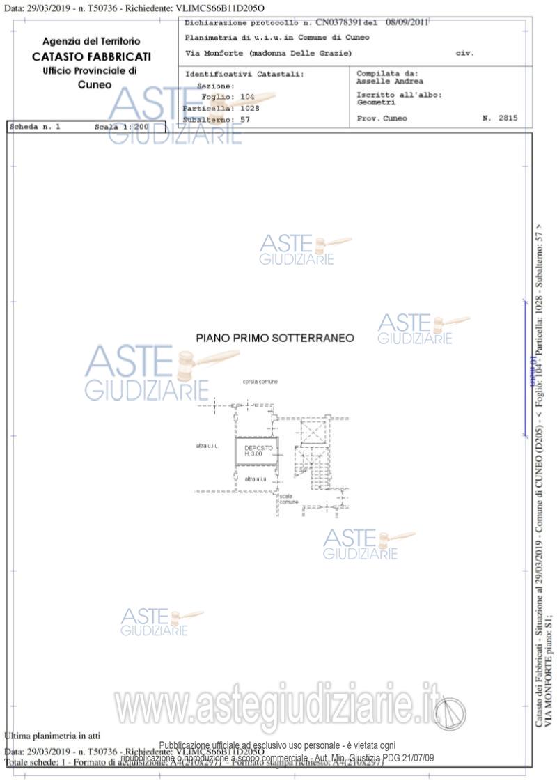 Vendita all'asta Senza incanto - LOTTO 71: LOTTO 71 - Piena proprietà di n. UNA cantina, identificabile al numero interno del condominio M02 ed al LOTTO n. 71 della procedura di concordato preventivo, sita nel comune di Cuneo, frazione Madonna delle Grazie, in via Monforte – “Residenza Il Maneggio” al piano -1. Prezzo base € 2.880,00 (offerta minima € 2.880,00). Data vendita 14/04/2026 ore 10:30. Curatore Dott. Giovanni Imberti - Tel. 0173 759301. Rif. Tribunale di Cuneo - Nuovo concordato preventivo n. 11/2018