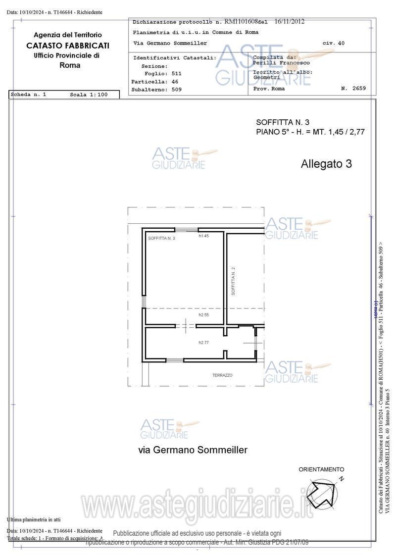 Vendita all'asta Senza incanto, con gara telematica asincrona - LOTTO 1: Quota pari a 1/1 del diritto di proprietà su porzione di fabbricato in Comune di Roma, via Germano Sommeiller n. 42, e precisamente:-locale ad uso soffitta al piano 5, contraddistinto con l’int. 3, catastalmente composto da: un unico ambiente di forma regolare con due finestre e altezza di 1,45/2.77 mt , oggi collegato alla soffitta int. 2 (non pignorata e non trasferibile) e abusivamente trasformato in abitazione composta da un ingresso, in cui è stata realizzata la cucina, un bagno e camera/soggiorno . Prezzo base € 24.000,00 (offerta minima € 18.000,00). Data inizio operazioni di vendita: 12/05/2026 ore 15:00. Professionista delegato alla vendita Avv. Angela Maria Lorena Cordaro. Custode Giudiziario Ivg Di Roma Srl - Email "pvp@visiteivgroma.it"; Tel. 0683751500. Rif. Tribunale di Roma - Espropriazione immobiliare (cartabia) n. 678/2023