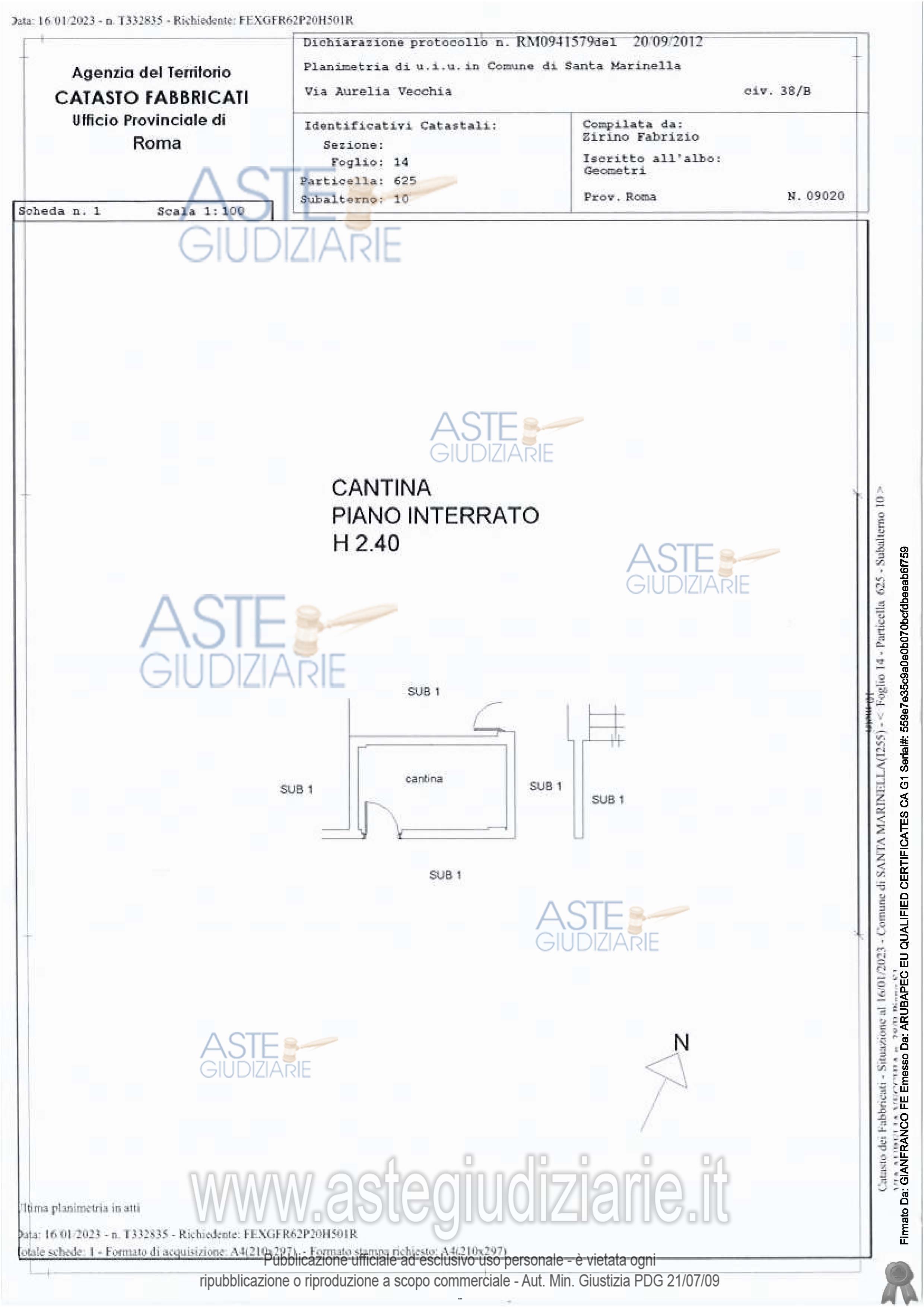 Vendita all'asta Senza incanto, con gara telematica asincrona - LOTTO 11: In Santa Marinella (Roma), Via Aurelia Vecchia attualmente n. 38/B Piano interrato; CANTINA C-C1 come da titolo edilizio – sul posto indicata con il n. 4 con superficie lorda pari a mq 8,60, realizzata al piano interrato, l’accesso avviene dal vialetto – corridoio condominiale, tramite cancello pedonale con apertura elettrica, è dotata di impianto di illuminazione, altezza interna mt 2,40. A confine con: per 4 lati con zona di manovra, corridoio, scale sub 1. Prezzo base € 3.600,00 (offerta minima € 2.700,00). Data inizio operazioni di vendita: 24/11/2025 ore 15:00. Giudice Dott. Francesco Vigorito. Professionista delegato alla vendita Avv. Alessia Marchi. Custode Giudiziario Avv. Alessia Marchi. Rif. Tribunale di Civitavecchia - Esecuzione immobiliare post legge 80 n. 219/2022