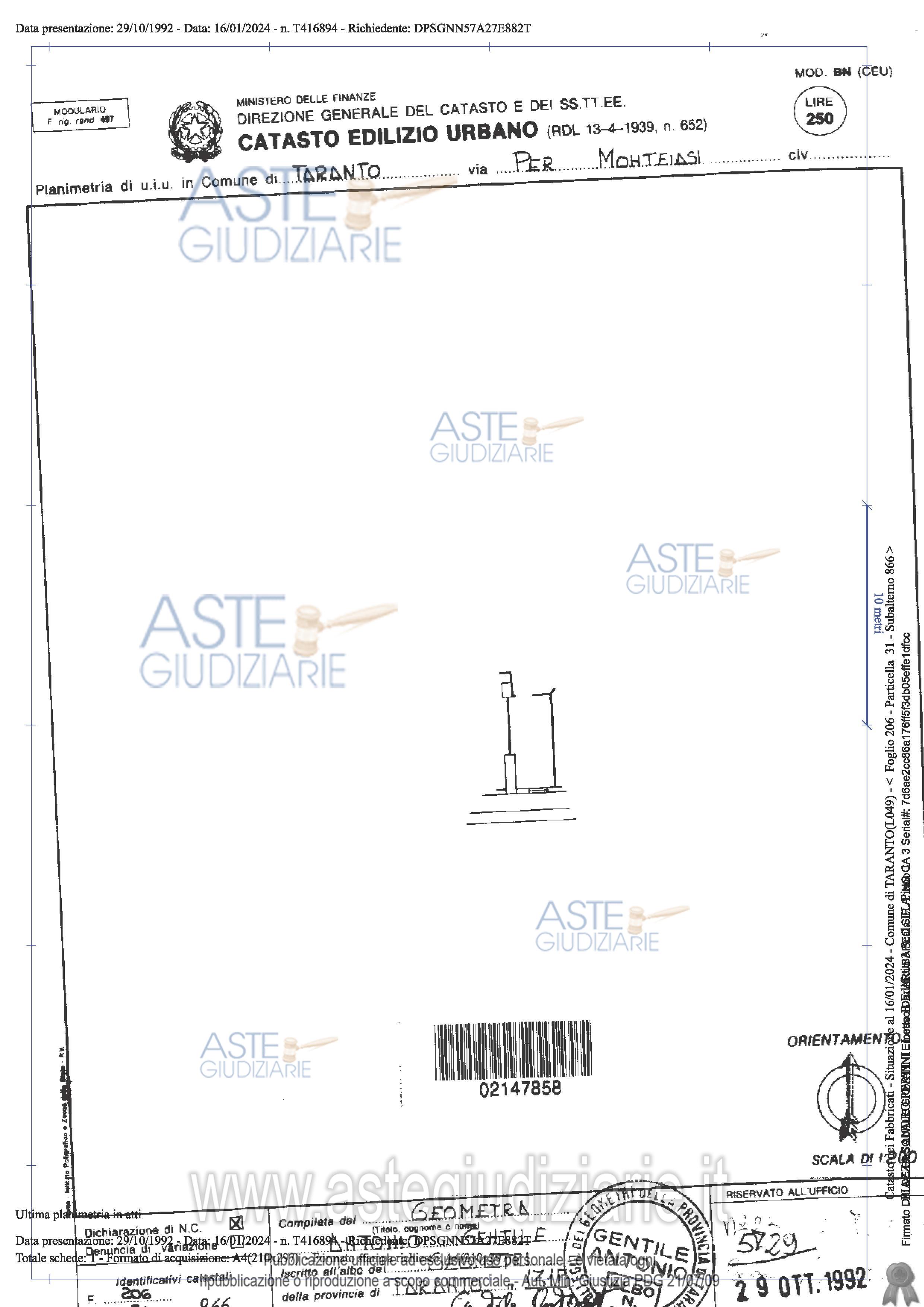 Vendita all'asta Senza incanto, con gara telematica asincrona - LOTTO 2: LOTTO 2: Locale deposito sito al piano interrato dell’Edificio “B3” scala EL del complesso edilizio denominato “Centro Mar Piccolo” o “Centro Mar Piccolo Direzionale & Residenziale o “Centro Direzionale Mar Piccolo” ubicato in Taranto quartiere Paolo VI alla Piazza Sandro Pertini, n. 22, composto da unico vano della superfice catastale di circa mq. 8,00, e per quanto effettivamente è, distinto con il numero interno “C23”. Prezzo base € 1.181,25 (offerta minima € 885,94). Data inizio operazioni di vendita: 26/05/2026 ore 17:00. Giudice Dott. Andrea Paiano. Professionista delegato alla vendita Avv. Paolo Miraglia - Tel. 0994533500. Custode Giudiziario Ivg Taranto - Email "ivgta.visiteimmobili@gmail.com". Rif. Tribunale di Taranto - Espropriazione immobiliare (cartabia) n. 291/2023