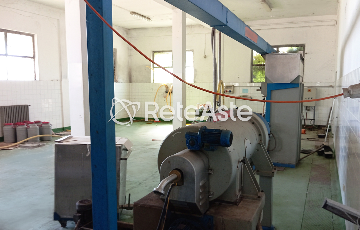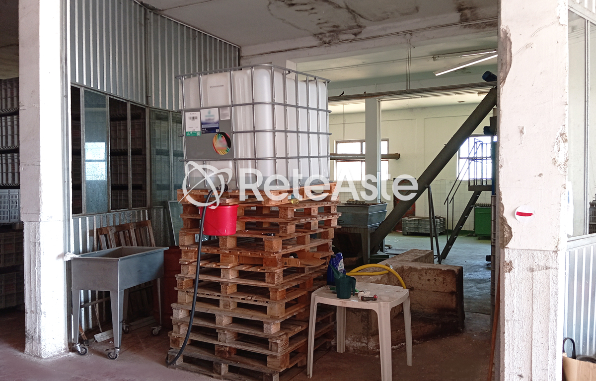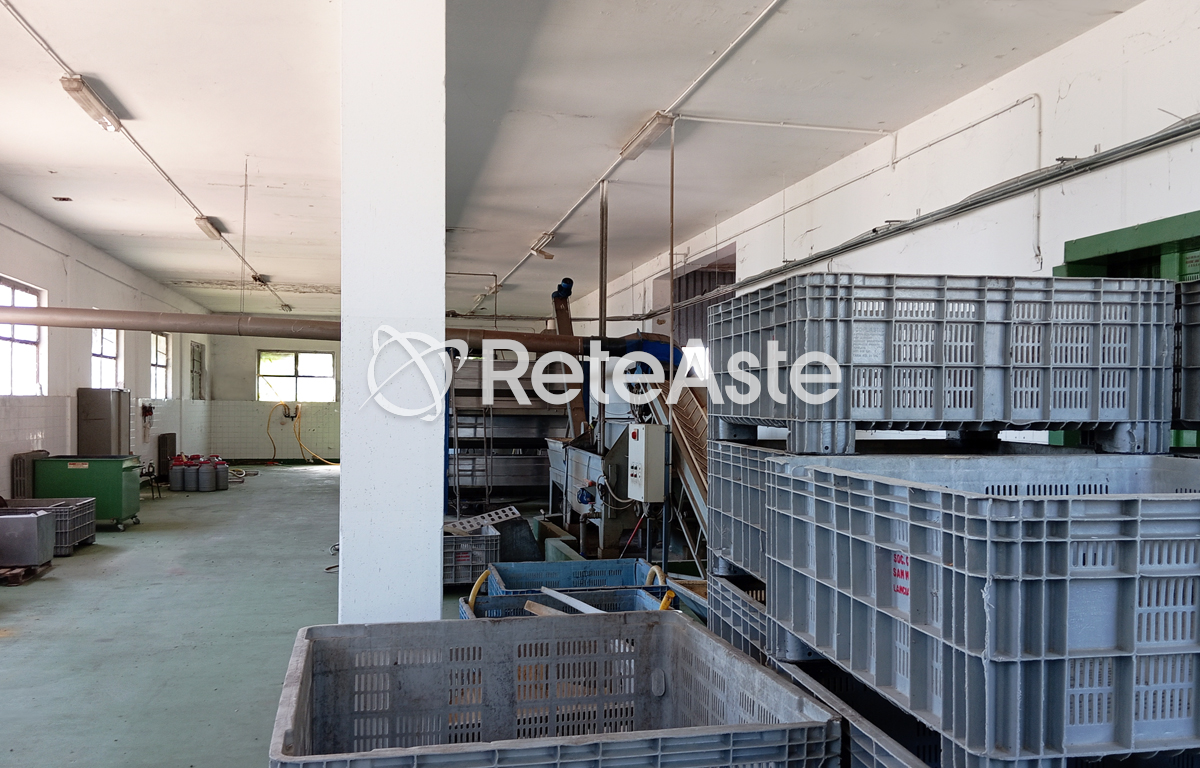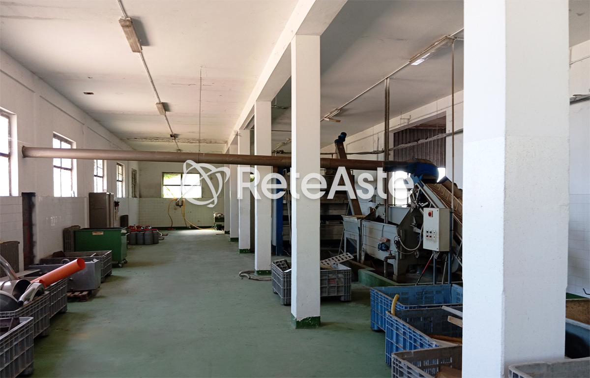 The industrial building includes several movable assets functional to the previous activity, including 166 "beans" baskets, a Pieralisi M/2 plant (without a separator), 3 transport containers, 1 filing cabinet, 16 oil bins, 3 desks, and an external 25-ton weight scale.