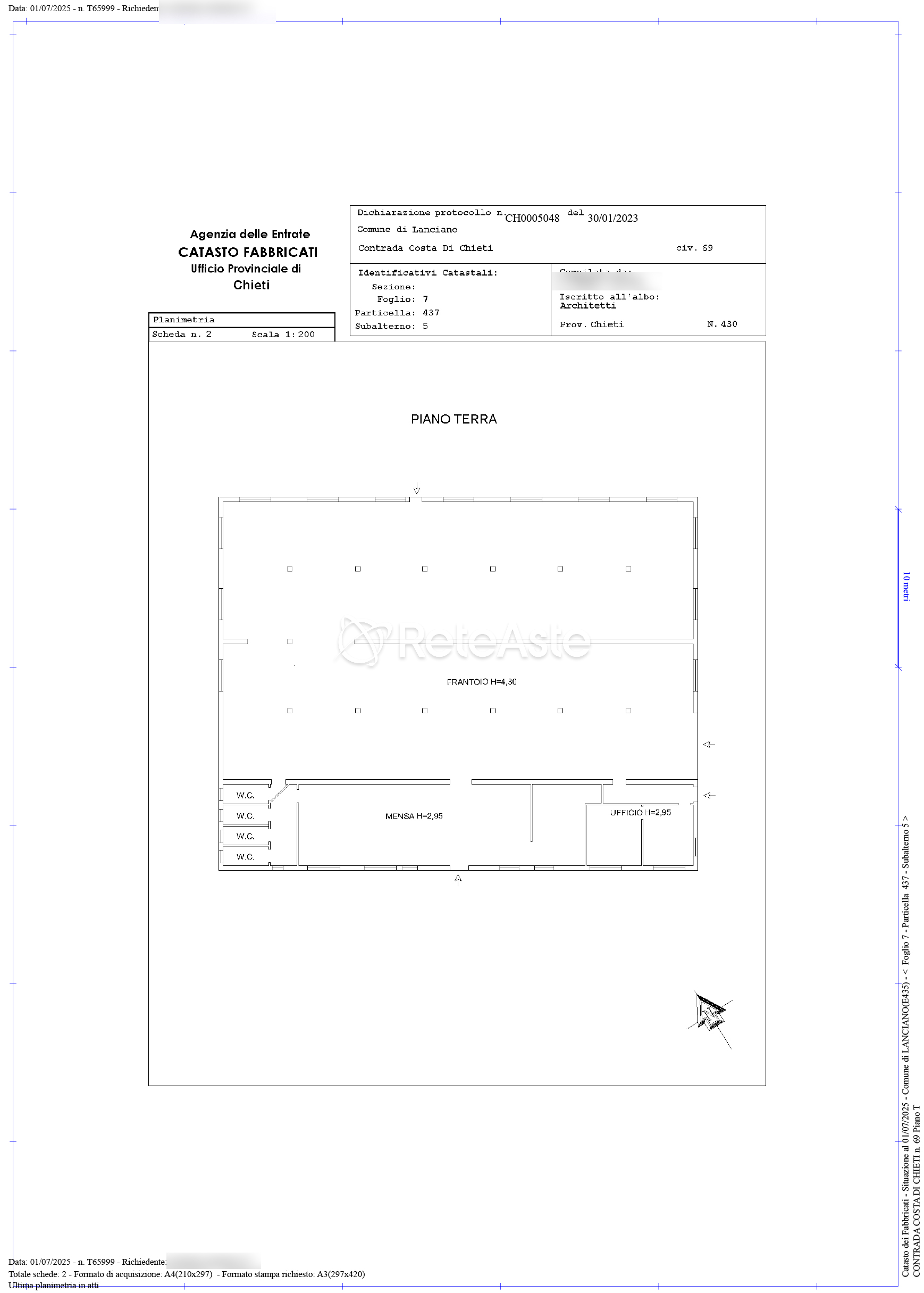 在意大利兰恰诺722平方米的工业厂房位于切蒂县哥斯达路Badia di Frisa。这个长方形平面的仓库建筑是用钢筋混凝土建造,带有立柱基础,结构条件良好。建筑物在功能上分为三个主要区域:一块面积为261.36平方米,高度为4.25米的油榨作业区,设有九个地下储罐;中央区域249.48平方米,高度也为4.25米,用于车辆通行;第三个区域面积为145.11平方米,高度为2.95米,设有四个卫生间,一个会计/过秤办公室和两个附属房间。外部还有一个面积约为13.61平方米的双层电力变压器舱和一个部分围栏区域。 工业厂房内包括各种与之前活动相关的移动设备,包括166个“豆子”筐,一台Pieralisi M/2设备(不带分离器),3个运输容器,1个文件柜,16个储油桶,3个写字台和一个25吨的户外秤。该仓库位于兰恰诺市规划设计的D2区,被列为“现有生产区”。这一指定表明这一城市规划专门用于已经巩固的工业、手工业或商业定居点。位于D2区意味着有利于支持生产活动的基础设施和法规框架,促进物流、与运营需求的兼容性以及有效管理工业空间。该物业位于兰恰诺市Badia di Frisa地区的市郊地区。尽管位置偏离市中心,但对于交通和货物运输却具有战略优势,这对工业活动来说是必要的。位于生产区确保了与居民区的必要距离,同时保持了与主要道路网络的良好连接,以便进行商业和物流运营。能效证书(APE):卖方声明该不需要能效表现证书,因为该物业属于D/1类别,是以工业或手工业为主要目的的加热建筑,或者是用于不可再利用的能源流的建筑。