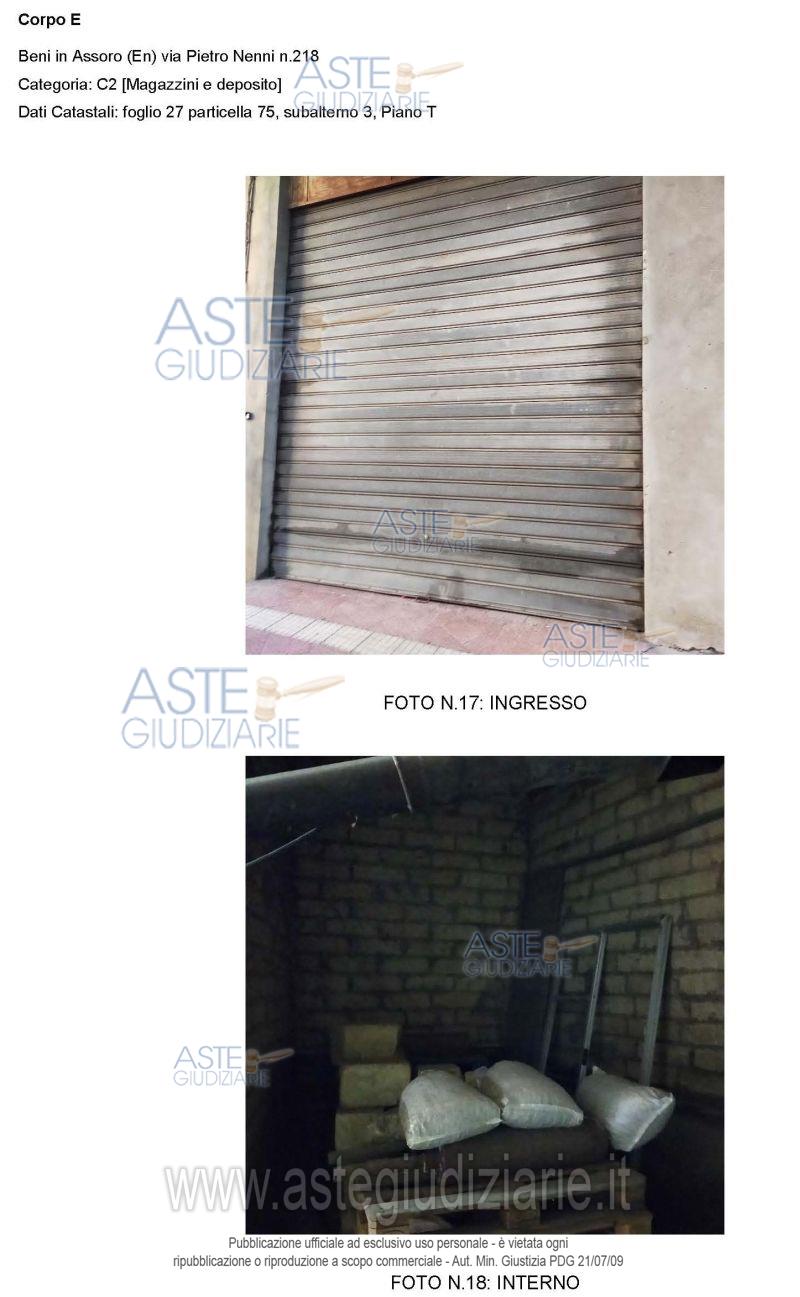 Vendita all'asta Senza incanto, con gara telematica sincrona mista - LOTTO 4: Piena proprietà del magazzino e deposito sito in Assoro (EN), via Pietro Nenni n. 218 (ex via Provinciale n. 11-11/A), piano terra, della consistenza di 151 mq. Prezzo base € 39.496,00 (offerta minima € 29.622,00). Data vendita 23/06/2026 ore 10:30. Giudice Nunzio Noto. Professionista delegato alla vendita Avv. Sara Indovino - Email "studiolegale.saraindovino@gmail.com". Custode Giudiziario Avv. Sara Indovino - Email "studiolegale.saraindovino@gmail.com"; Tel. 3317312856. Rif. Tribunale di Enna - Esecuzione immobiliare post legge 80 n. 9/2022