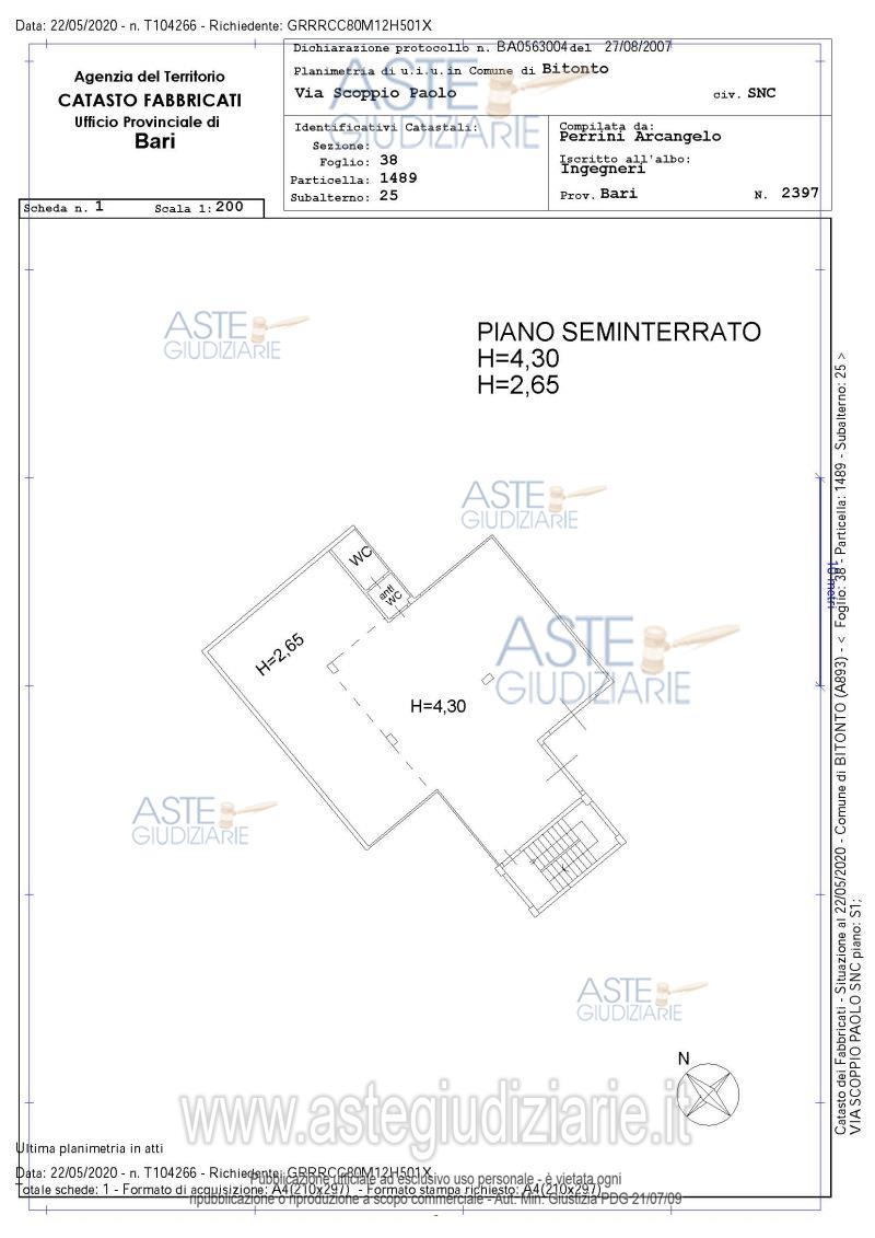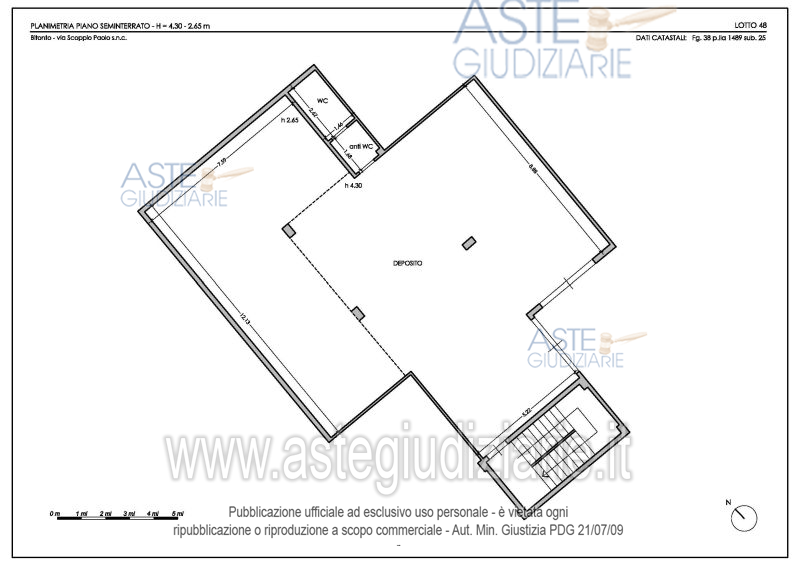 Vendita in attesa dell'emissione del nuovo bando d'asta. LOTTO 48: Deposito a piano seminterrato ad uso deposito dotato di servizio igienico. Il bene è dotato di due serrande affacciate sullo spazio condominiale ed è articolato con spazio principale privo di tramezzi, altezza netta oltre quattro metri, ben areato e illuminato e uno spazio secondario con altezza netta di circa 2,65 metri. Ultimo prezzo base € 63.281,25 (offerta minima € 47.500,00). Giudice Dott. Antonio Ruffino. Professionista delegato alla vendita Avv. Domenico Pinto - Email "avv.domenico.pinto81@gmail.com". Custode Giudiziario Avv. Domenico Pinto - Email "avv.domenico.pinto81@gmail.com". Rif. Tribunale di Bari - Esecuzione immobiliare post legge 80 n. 681/2019