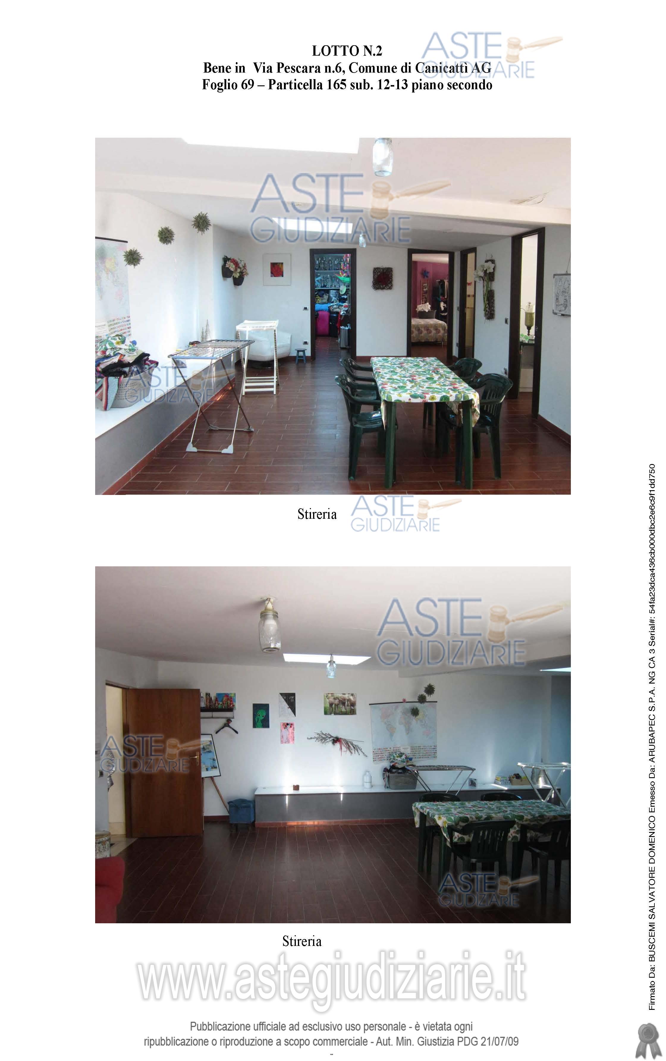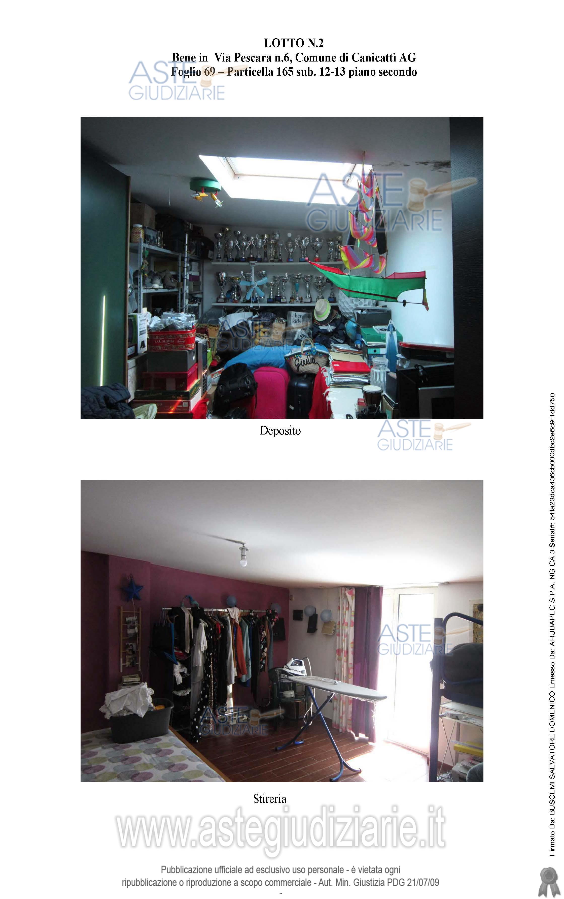 Vendita all'asta Senza incanto, con gara telematica sincrona mista - LOTTO 2: Piena proprietà per la quota di 1000/1000 di deposito sito in Canicattì (AG), via Pescara n°6 piano 2. Si tratta di un’unica unità immobiliare identificata al Foglio 69 part. 165 sub 12 e sub 13, cat. C/2. Indirizzo catastale: viale Regina Elena n°92. Il deposito sviluppa una superficie complessiva di mq.126 circa. Il fabbricato è stato autorizzato con autorizzazione in sanatoria n.178 del 7.11.2011. Prezzo base € 27.759,38 (offerta minima € 20.819,53). Data vendita 29/05/2026 ore 17:30. Professionista delegato alla vendita Dott. Domenica Zagrì - Email "domenicazagri@libero.it"; Cell. 3335019005; Tel. 3335019005. Custode Giudiziario Dott. Domenica Zagrì - Email "domenicazagri@libero.it"; Cell. 3335019005; Tel. 3335019005. Rif. Tribunale di Agrigento - Esecuzione immobiliare post legge 80 n. 124/2021