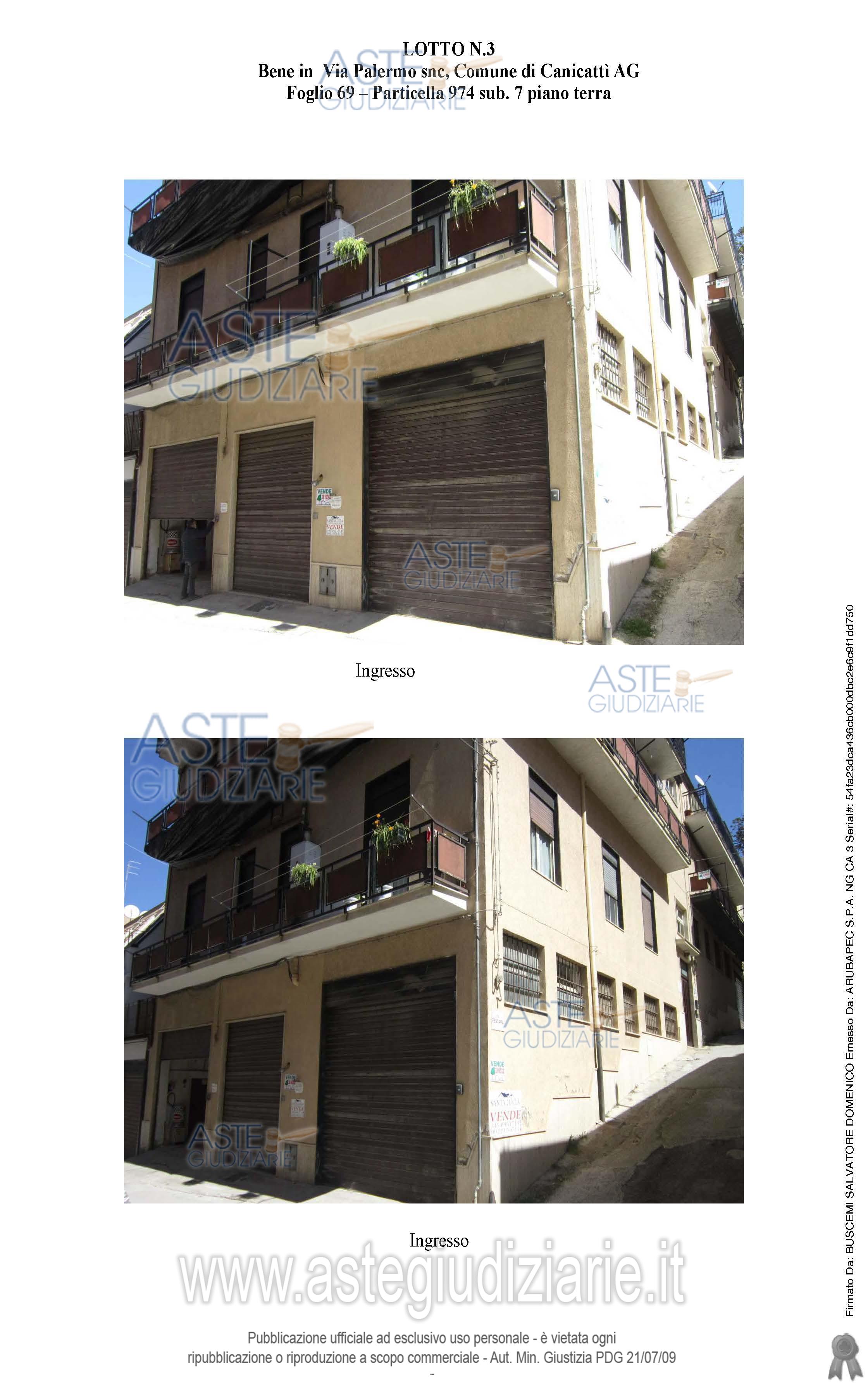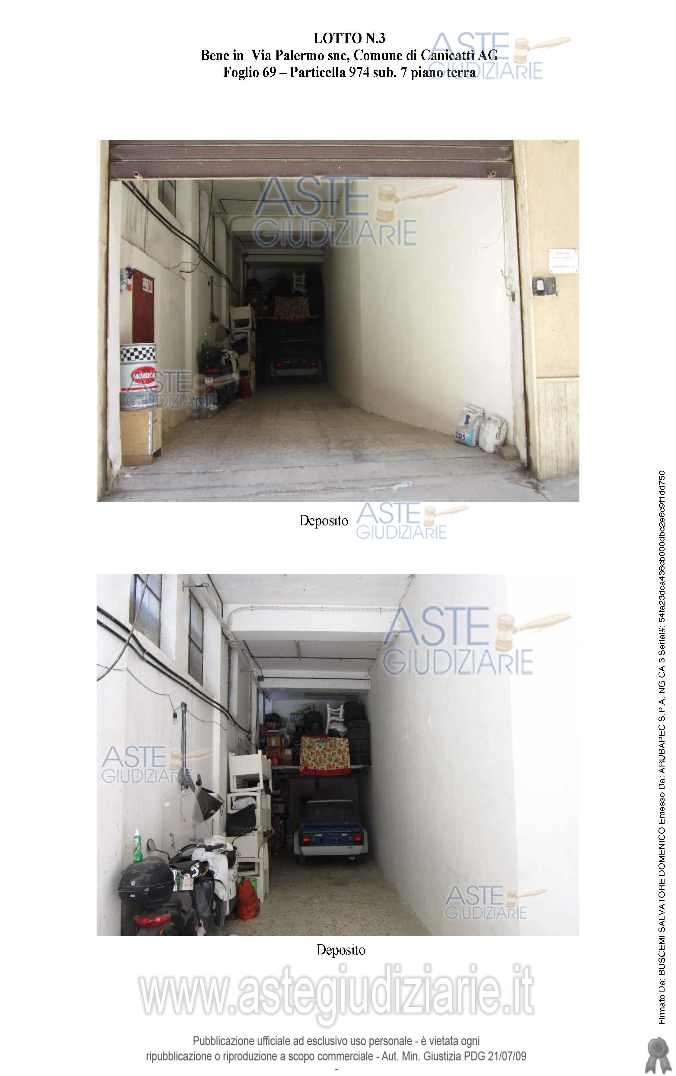 Vendita all'asta Senza incanto, con gara telematica sincrona mista - LOTTO 3: Piena proprietà per la quota di 1000/1000 di deposito sito in Canicattì (AG), via Palermo snc, piano terra. Costituito da un unico vano,è identificato al catasto fabbricati del comune di Canicattì al Foglio 69 part. 974 sub 7, cat. C/2. Il deposito sviluppa una superficie complessiva di mq.57 circa. Il fabbricato è stato realizzato in data anteriore al 1967. Autorizzato con autorizzazione n.173/10 del 4.11.2010 è conforme allo stato attuale. Prezzo base € 11.903,20 (offerta minima € 8.927,40). Data vendita 29/05/2026 ore 17:30. Professionista delegato alla vendita Dott. Domenica Zagrì - Email "domenicazagri@libero.it"; Cell. 3335019005; Tel. 3335019005. Custode Giudiziario Dott. Domenica Zagrì - Email "domenicazagri@libero.it"; Cell. 3335019005; Tel. 3335019005. Rif. Tribunale di Agrigento - Esecuzione immobiliare post legge 80 n. 124/2021