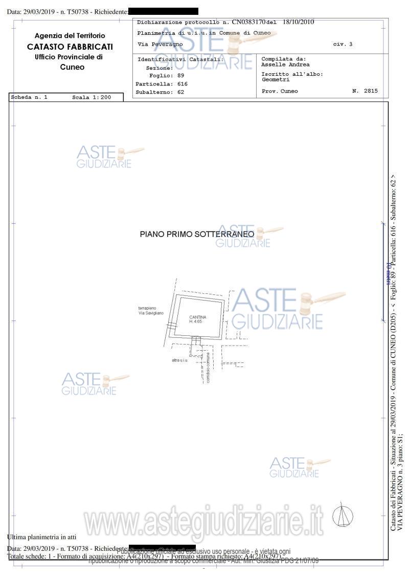 Vendita all'asta Senza incanto - LOTTO 95: Piena proprietà di deposito/cantina al primo piano interrato di un condominio storico di pregio recentemente ristrutturato sito in zona di prestigio dell’abitato di Cuneo (Piazza Boves), via Peveragno n. 3, censito al catasto al:= Foglio 89, particella 616, sub 62, zona cens. 2, cat. C/2, consistenza 17 mq, superficie catastale 22 mq, rendita € 15,80. Prezzo base € 7.000,00 (offerta minima € 7.000,00). Data vendita 02/12/2025 ore 11:30. Professionista delegato alla vendita Dott. Giovanni Imberti - Tel. 0173 759301. Rif. Tribunale di Cuneo - Nuovo concordato preventivo n. 11/2018
