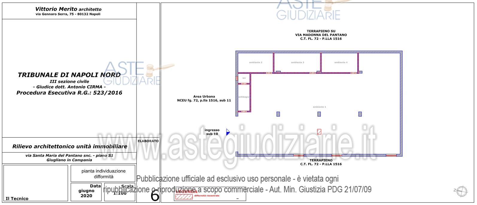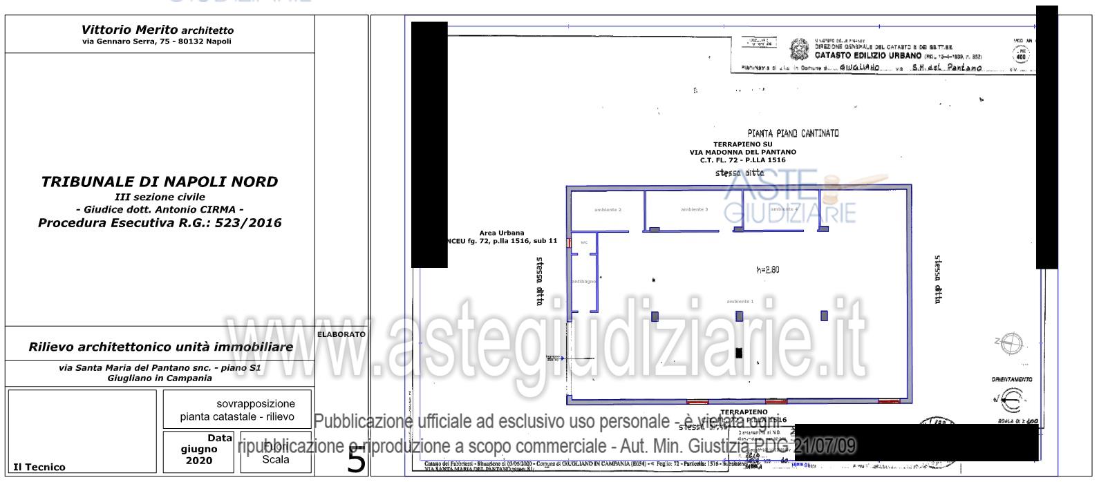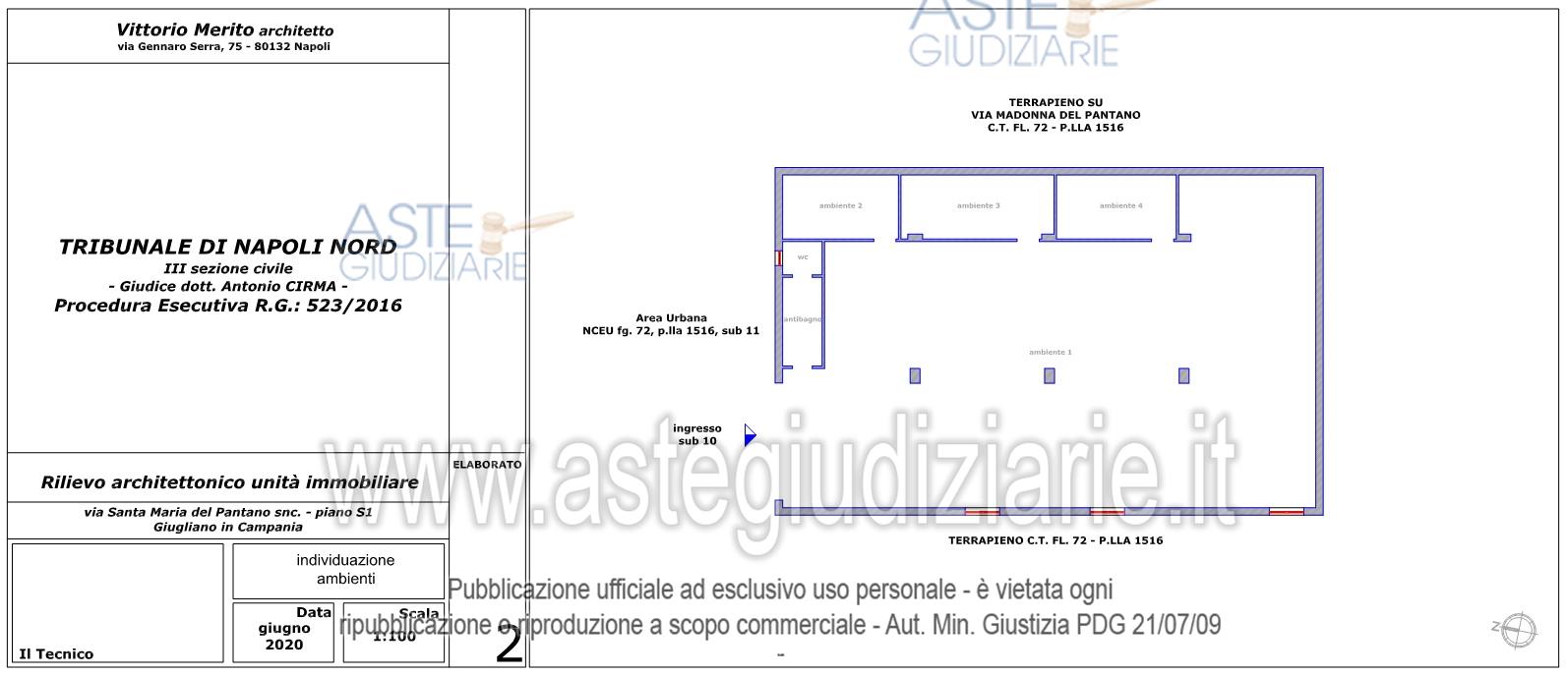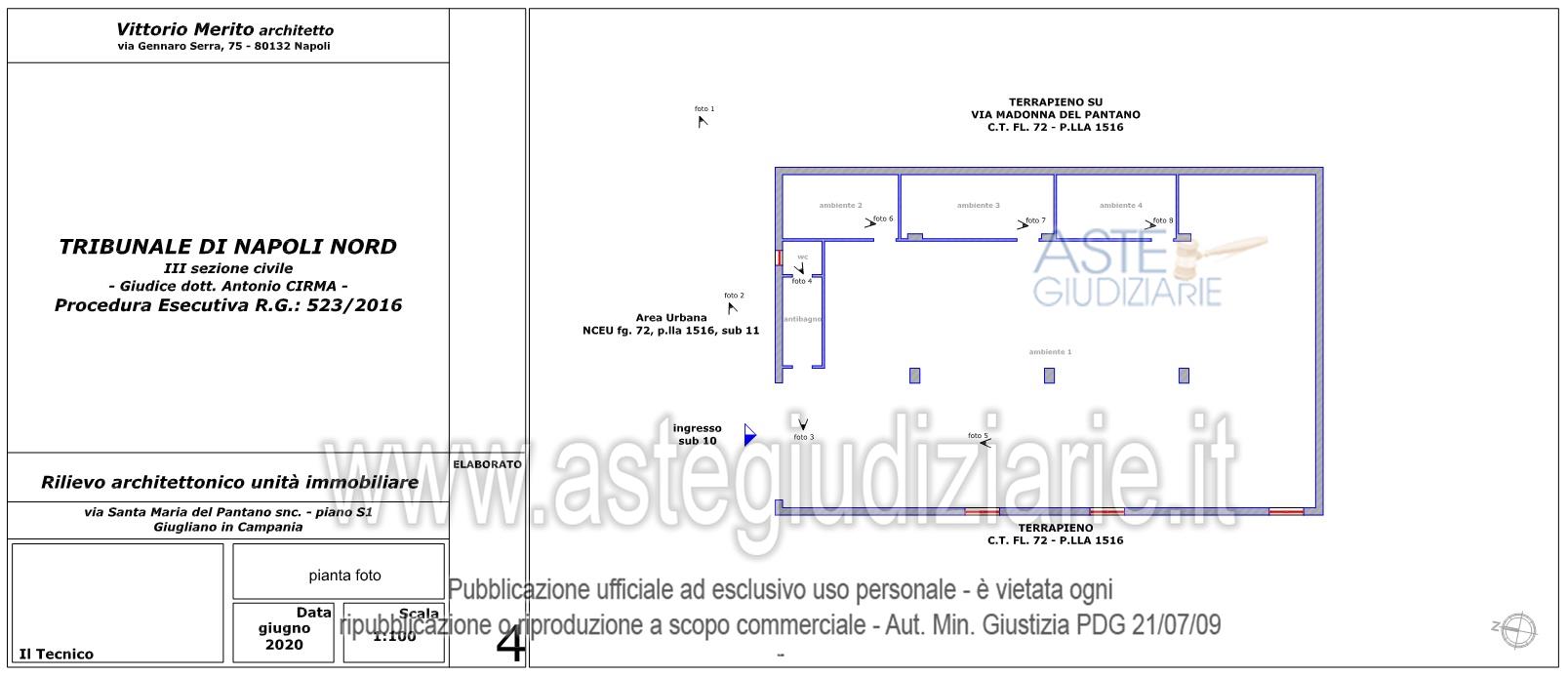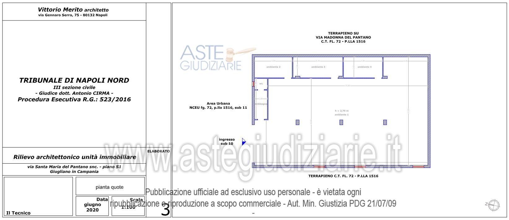 Vendita all'asta Senza incanto, con gara telematica asincrona - LOTTO 3: Piena ed esclusiva proprietà di locale deposito ubicato in Giugliano in Campania (NA) alla via Madonna del Pantano snc (catastalmente via Santa Maria del Pantano snc) piano S1, composto da un locale deposito con n. 4 ambienti, antibagno e bagno e riportato al Catasto Fabbricati del Comune di Giugliano in Campania al F. 72, p.lla 1516, sub. 10, cat. C/2, cl. 3, consistenza 296 mq., sup. cat. 312 mq., rendita € 10,22. Prezzo base € 111.375,00 (offerta minima € 83.531,25). Data inizio operazioni di vendita: 10/03/2026 ore 15:00. Professionista delegato alla vendita Avv. Marco D'arcangelo - Email "marcodarca1974@gmail.com"; Tel. 0810491814. Custode Giudiziario Avv. Marco D'arcangelo - Email "marcodarca1974@gmail.com"; Tel. 0810491814. Rif. Tribunale di Napoli Nord - Esecuzione immobiliare post legge 80 n. 523/2016