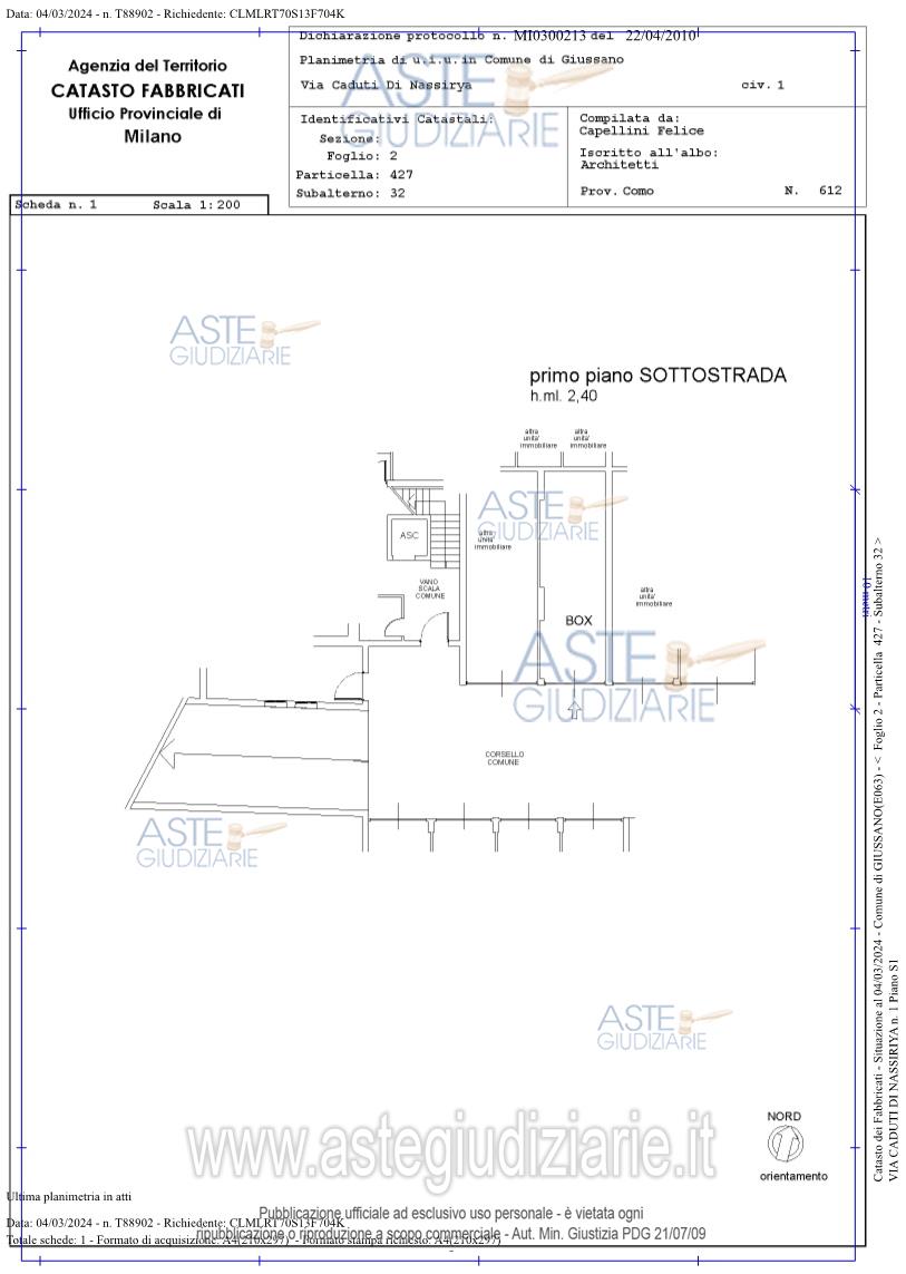Vendita all'asta Senza incanto, con gara telematica sincrona - LOTTO UNICO: Box doppio di 29,00 mq e cantina di mq 6,40, posti al piano interrato. “PER L’ASSISTENZA ALLA PARTECIPAZIONE ALL’ASTA DEI BENI IMMOBILI E MOBILI CI SI PUO’ RIVOLGERE ALL’I.V.G. DI MONZA. IL TRIBUNALE DI MONZA NON HA CONFERITO ALCUN INCARICO A INTERMEDIARI/AGENZIE IMMOBILIARI PER LA PUBBLICITÀ GIUDIZIARIA E L’ASSISTENZA ALLA PARTECIPAZIONE ALL’ASTA”. Prezzo base € 20.500,00 (offerta minima € 15.375,00). Data vendita 29/10/2025 ore 14:30. Giudice Caterina Rizzotto. Professionista delegato alla vendita Rag. Francesca Salamone - Email "paoreati@tin.it"; Tel. 039481450. Custode Giudiziario Rag. Francesca Salamone - Email "paoreati@tin.it"; Tel. 039481450. Rif. Tribunale di Monza - Espropriazione immobiliare (cartabia) n. 552/2023