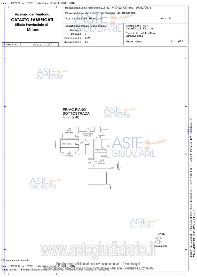 Vendita all'asta Senza incanto, con gara telematica sincrona - LOTTO UNICO: Box doppio di mq. 29. Cantina di mq. 6,40, posti al piano interrato.“PER L’ASSISTENZA ALLA PARTECIPAZIONE ALL’ASTA DEI BENI IMMOBILI E MOBILI CI SI PUO’ RIVOLGERE ALL’I.V.G. DI MONZA. IL TRIBUNALE. Prezzo base € 15.375,00 (offerta minima € 11.532,00). Data vendita 28/01/2026 ore 14:30. Giudice Arianna Toppan. Professionista delegato alla vendita Rag. Francesca Salamone - Email "salamone.francesca@outlook.it"; Tel. 039481450. Custode Giudiziario Rag. Francesca Salamone - Email "salamone.francesca@outlook.it"; Tel. 039481450. Rif. Tribunale di Monza - Espropriazione immobiliare (cartabia) n. 552/2023