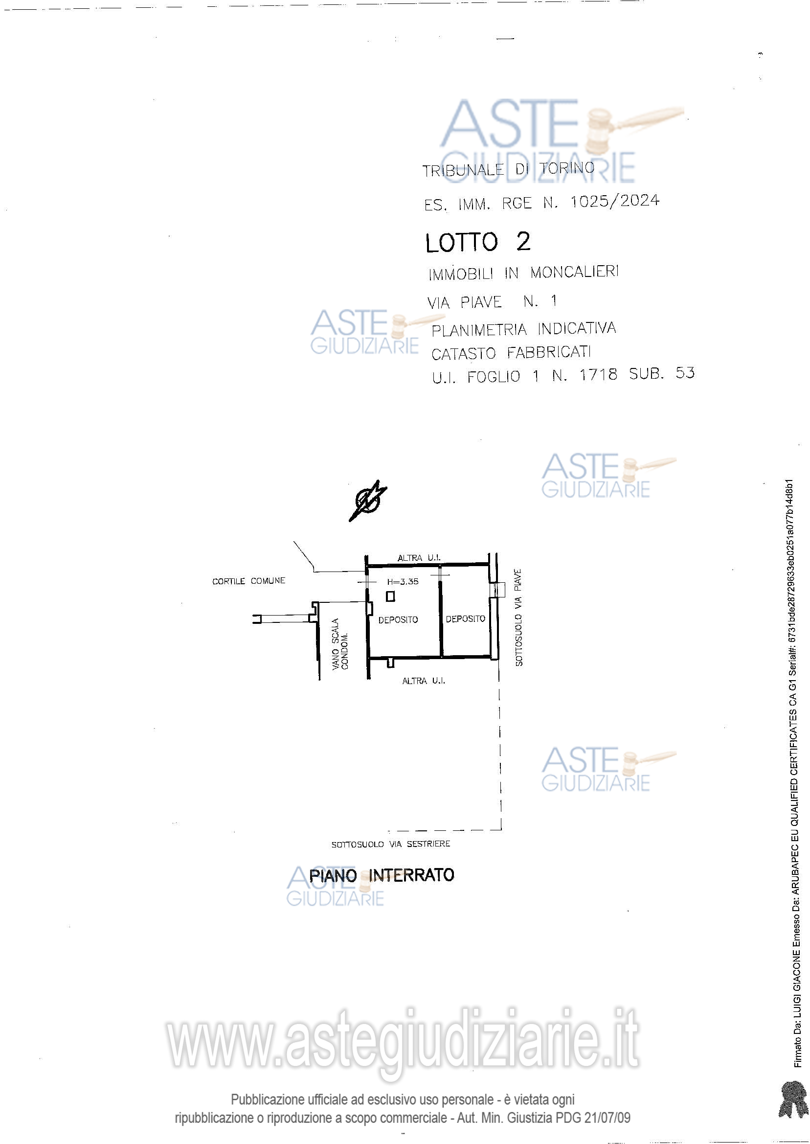 Vendita all'asta Senza incanto, con gara telematica asincrona - LOTTO 2: Deposito al piano interrato. Prezzo base € 9.000,00 (offerta minima € 6.750,00). Data inizio operazioni di vendita: 12/05/2026 ore 15:00. Giudice Anna Castellino. Professionista delegato alla vendita Not. Paolo Demaria. Custode Giudiziario Lorenzo Vigone - Email "richieste.visite@ivgpiemonte.it"; Tel. 011482822. Rif. Tribunale di Torino - Espropriazione immobiliare (cartabia) n. 1025/2024