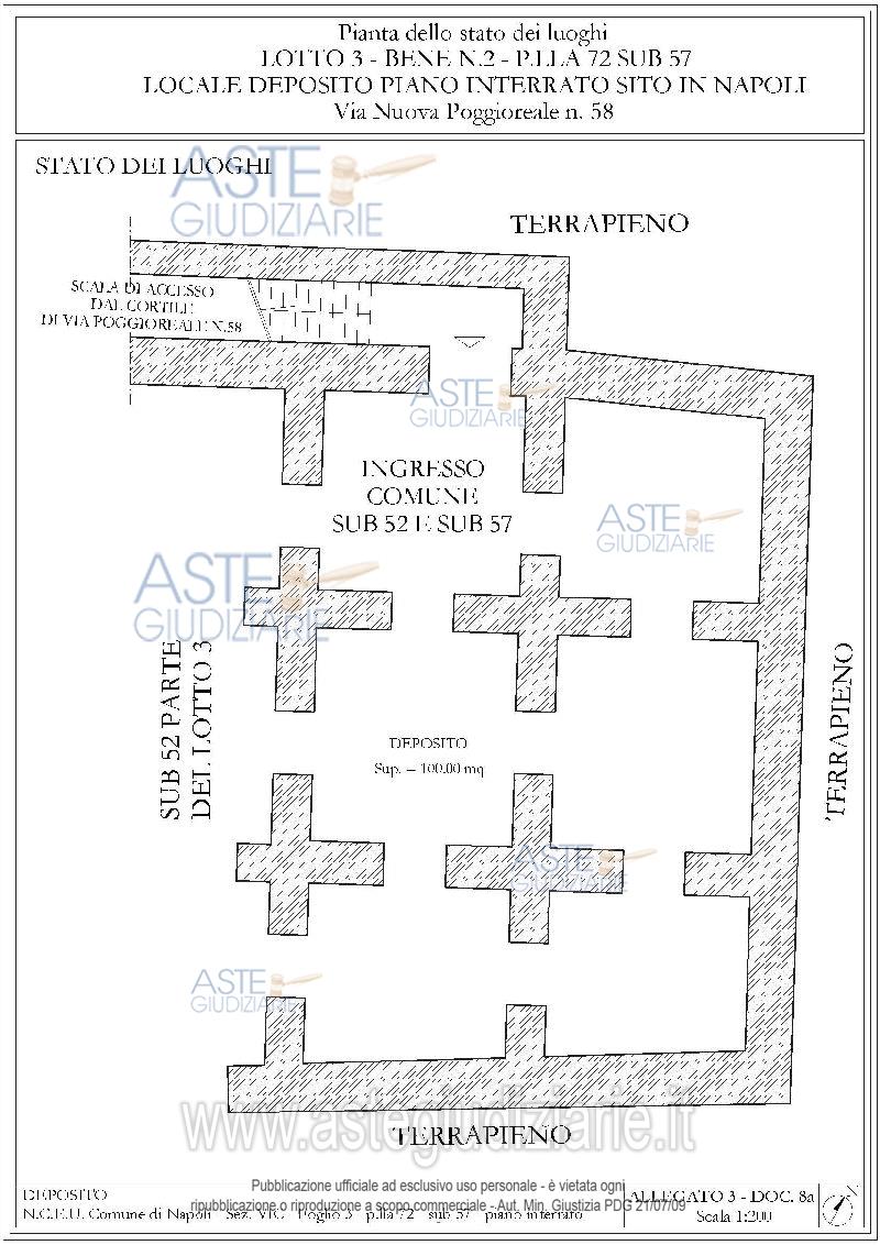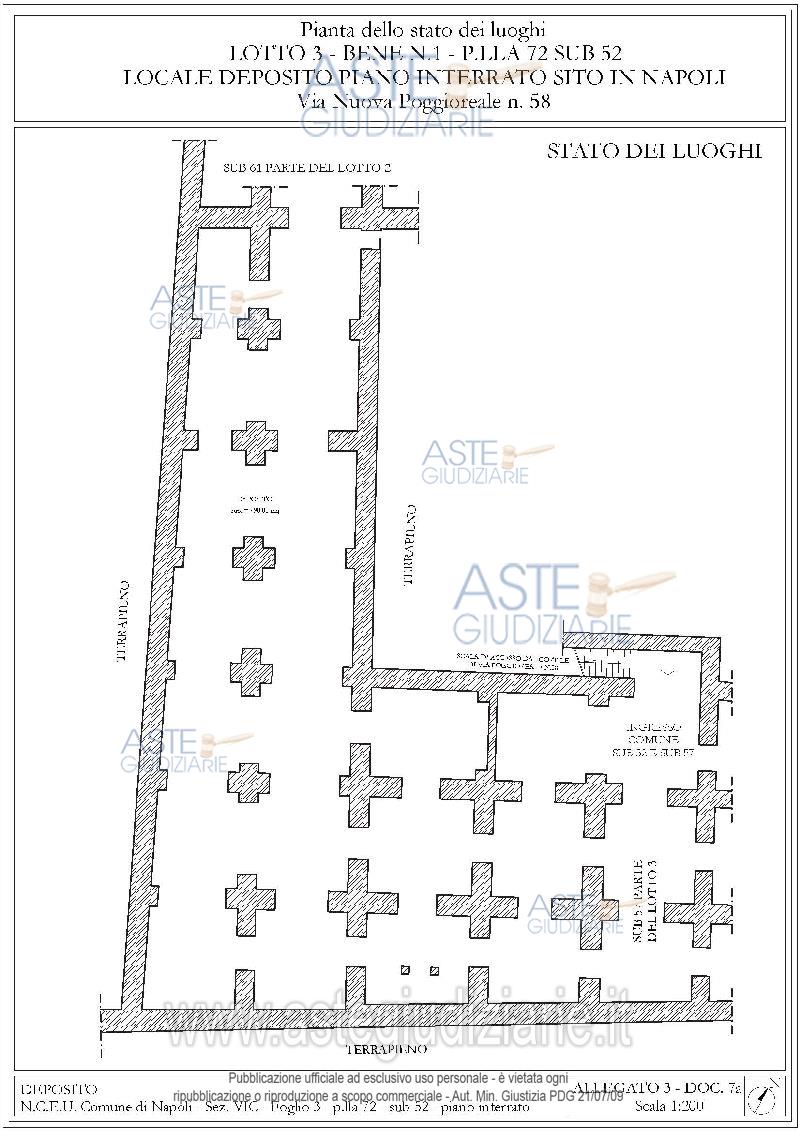 Vendita all'asta Senza incanto, con gara telematica asincrona - LOTTO 3: piena ed intera proprietà di Locale deposito al piano interrato sito in Napoli alla via Nuova Poggioreale n. 58, con accesso dal cortile interno mediante scala in muratura ubicata a destra dell’androne entrando dalla via Poggioreale, composto da ampio deposito. Prezzo base € 21.120,11 (offerta minima € 15.840,08). Data inizio operazioni di vendita: 14/01/2026 ore 15:00. In caso di più offerte valide si procederà a gara che inizierà il 14/01/2026 ore 15:00 e terminerà il 14/01/2026 ore 15:00. Professionista delegato alla vendita Avv. Adolfo Coppola - Email "adolfo.coppola@legalecm.it"; Cell. 3491412531; Tel. 08231656102. Custode Giudiziario Avv. Adolfo Coppola - Email "adolfo.coppola@legalecm.it"; Cell. 3491412531; Tel. 08231656102. Rif. Tribunale di Napoli - Esecuzione immobiliare post legge 80 n. 874/2018