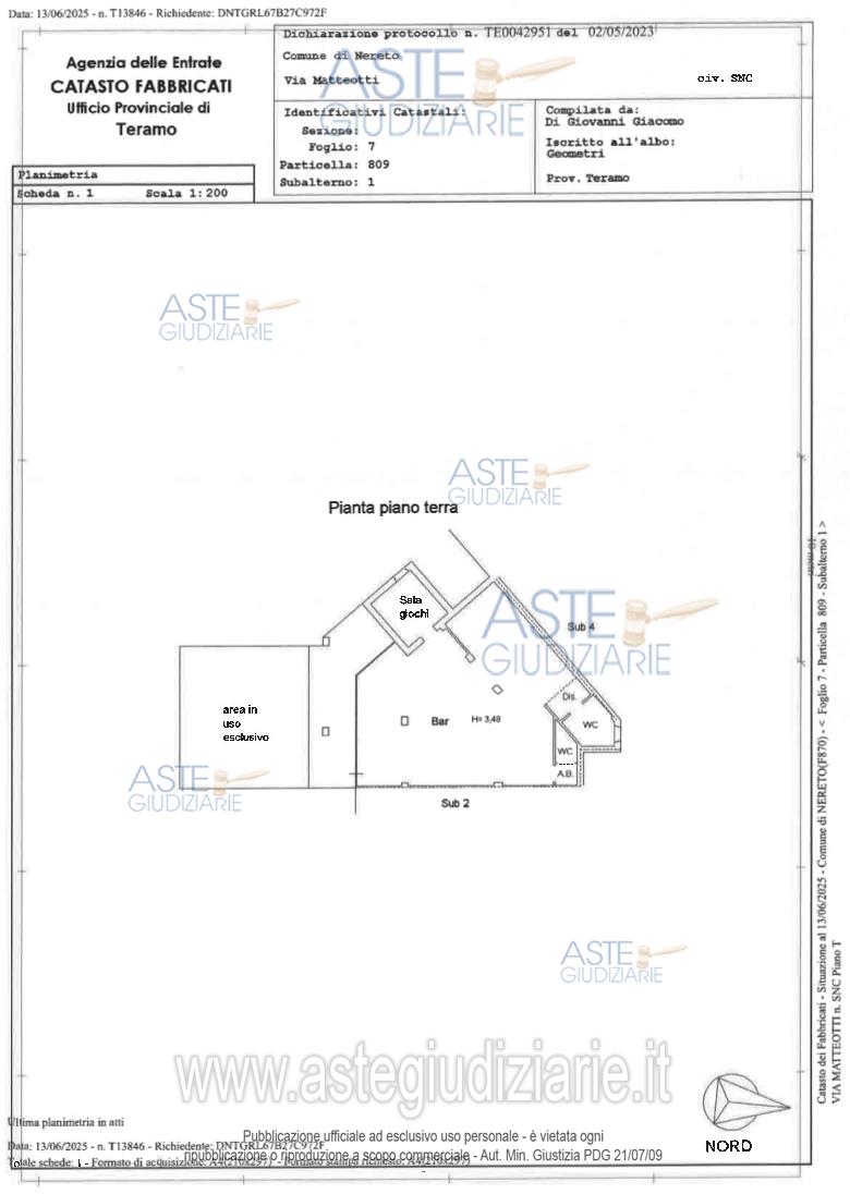 Vendita all'asta Senza incanto, con gara telematica asincrona - LOTTO UNICO: Locale commerciale (Sub. 1) posto al piano terra della superficie catastale di Mq. 100,00 circa, attualmente destinato a bar, costituito da sala, bagno, sala giochi, bagno personale, e portico della superficie di Mq. 21,00 circa, area in uso esclusiva destinata a parcheggio della superficie di Mq. 44,00 circa; Il locale risulta non conforme allo stato autorizzato ed accatastato per la non realizzazione dell’antibagno nel bagno personale. L’immobile si presenta in uno stato conservativo buono. Prezzo base € 56.000,00 (offerta minima € 42.000,00). Data inizio operazioni di vendita: 27/05/2026 ore 15:00. Professionista delegato alla vendita Dott. Gianni Di Furia - Email "difuria.gianni@gmail.com"; Cell. 3277353730. Custode Giudiziario Avv. Luigi Ranalli - Email "luigi.ran@hotmail.com"; Cell. 3283312560. Rif. Tribunale di Teramo - Esecuzione immobiliare post legge 80 n. 94/2025
