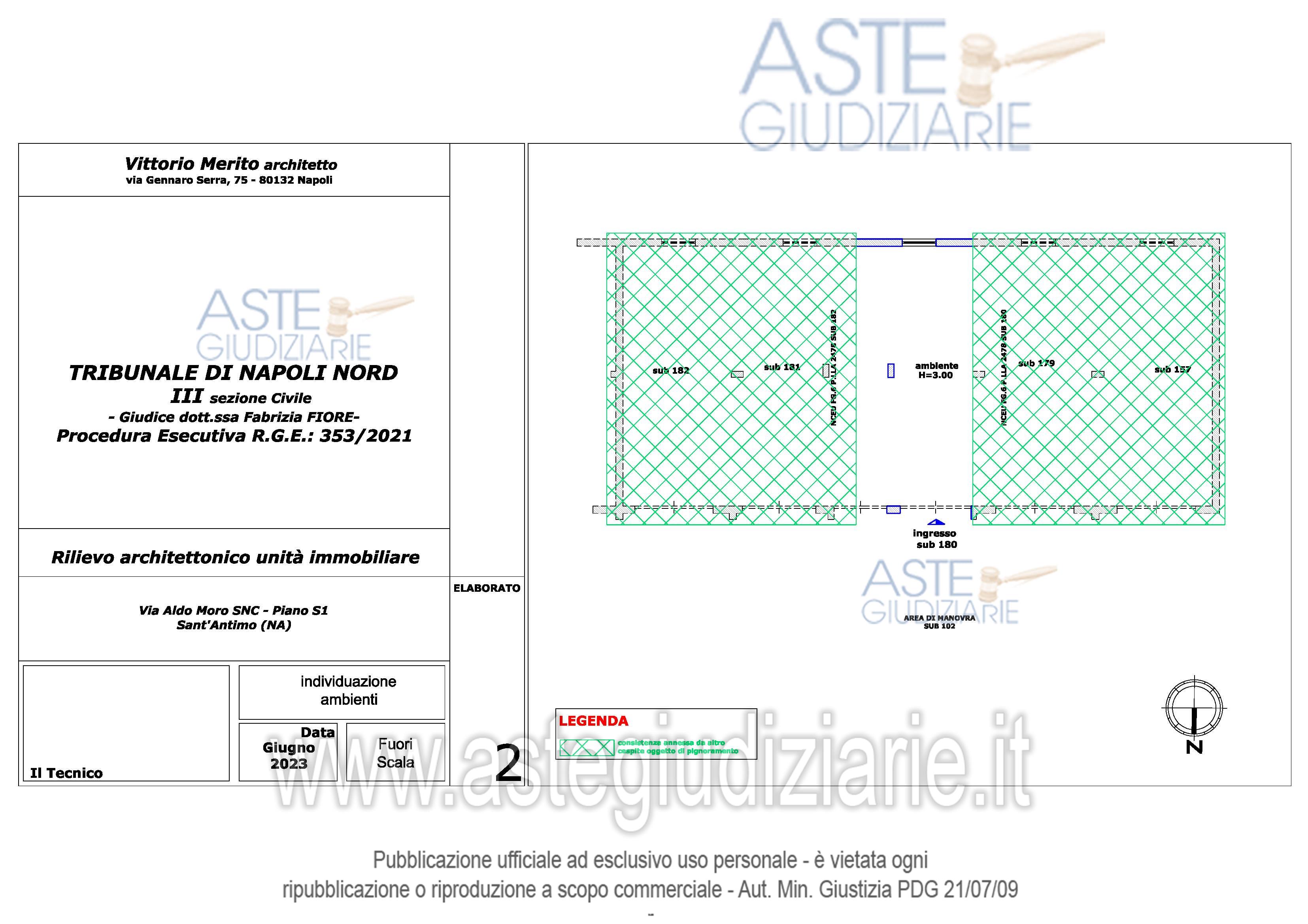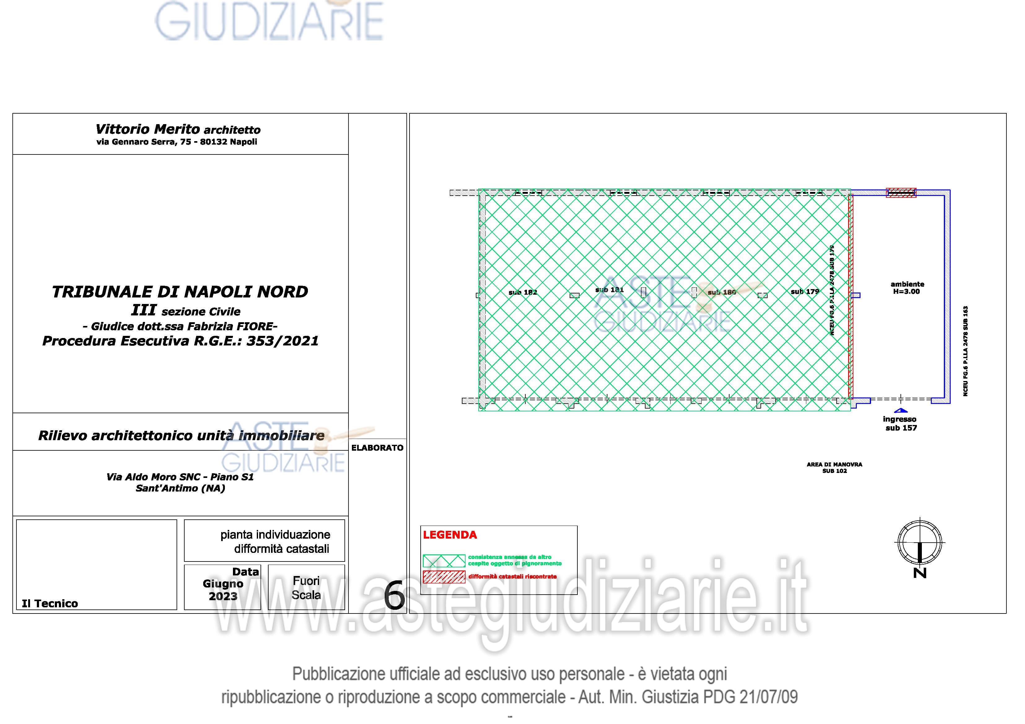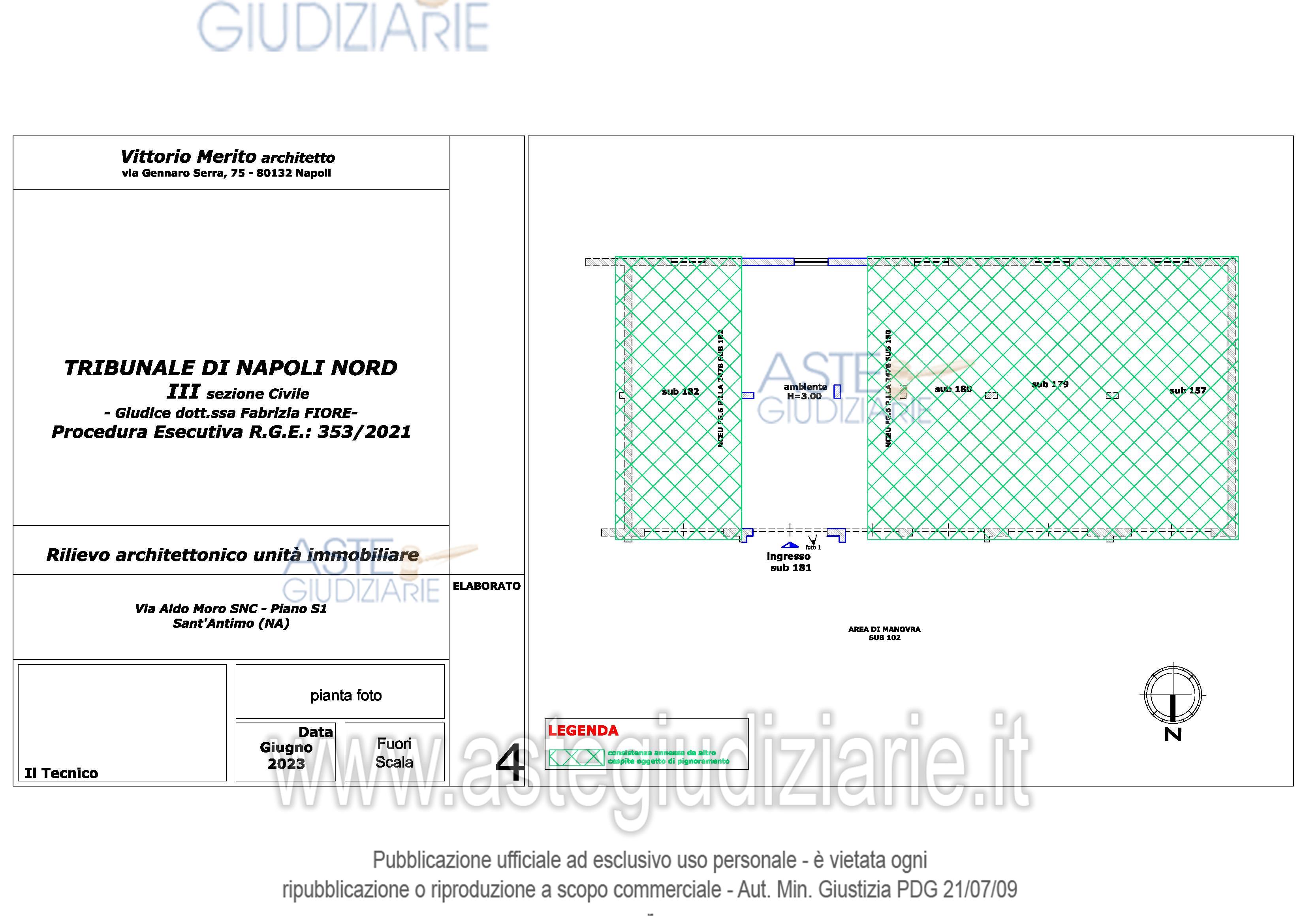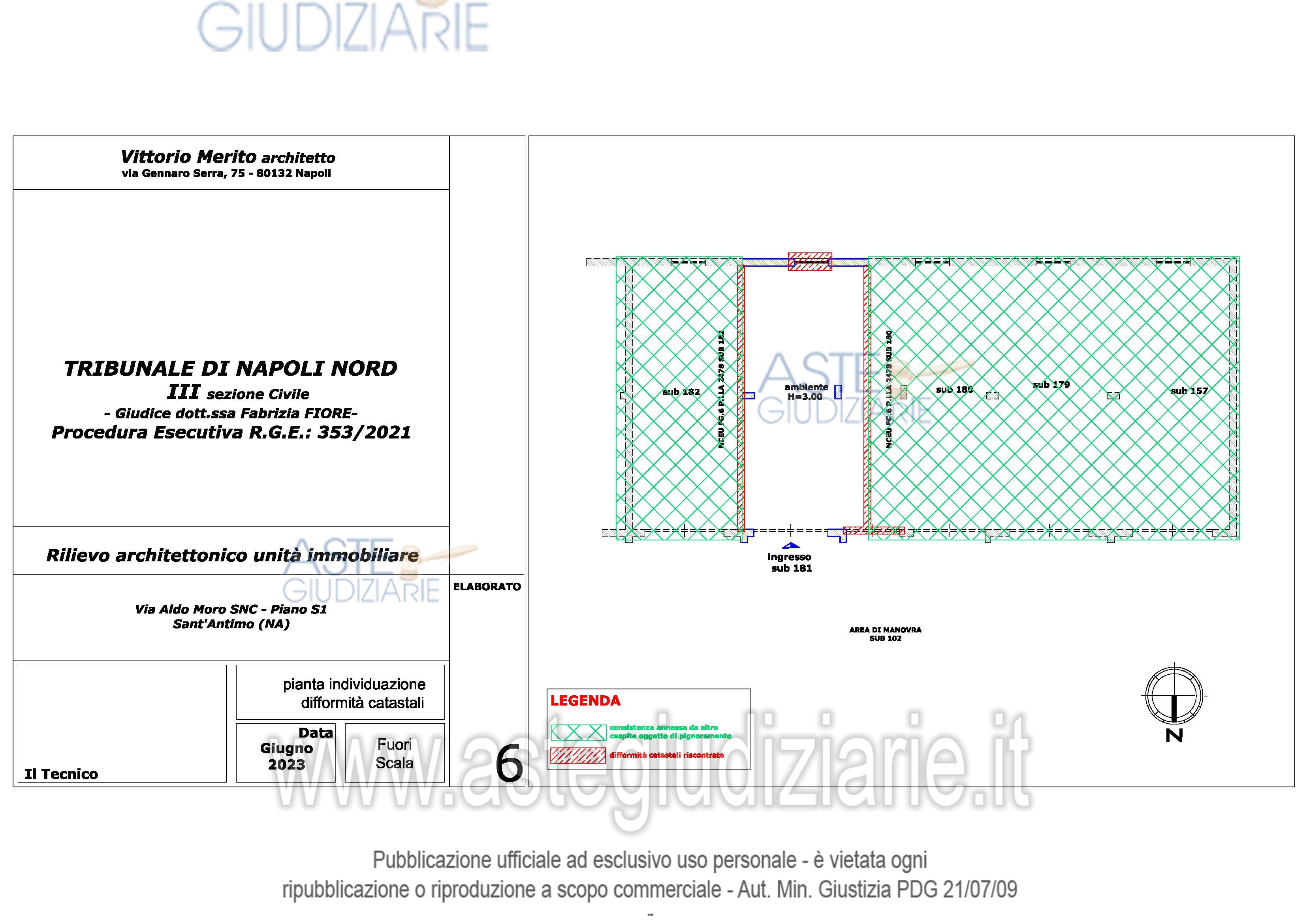 Vendita all'asta Senza incanto, con gara telematica asincrona - LOTTO 36: BENE 1 – Garage sito nel Comune di Sant’Antimo (Na) via Aldo Moro 21, piano S1 “Parco Omissis” composto da unico ambiente; in NCEU foglio 6, particella 2478, sub. 157, cat. C/6, classe 3, consistenza 52 mq, sup. cat. 56 mq. Bene 2 -Bene 3 - Bene 4 e Bene 5 - Locali Deposito, censiti in NCEU al foglio 6, part. 2478, sub 179, 180, 181, 182. I beni de quibus risultano tutti liberi. Prezzo base € 141.600,00 (offerta minima € 106.200,00). Data inizio operazioni di vendita: 27/11/2025 ore 16:00. Custode Giudiziario Dott. Francesco Russo - Email "studiocasillorusso@libero.it"; Tel. 0815404454. Rif. Tribunale di Napoli Nord - Esecuzione immobiliare post legge 80 n. 353/2021