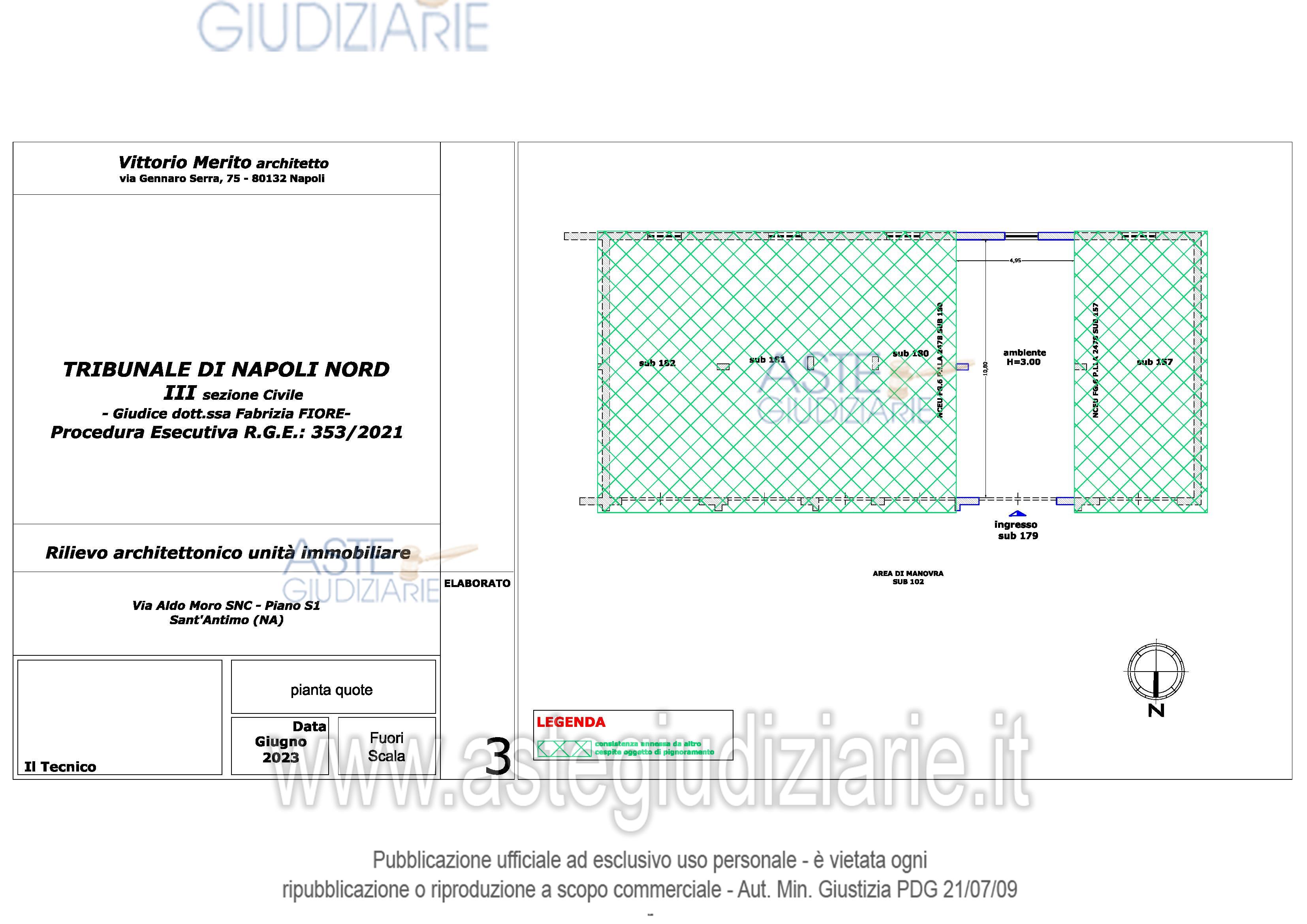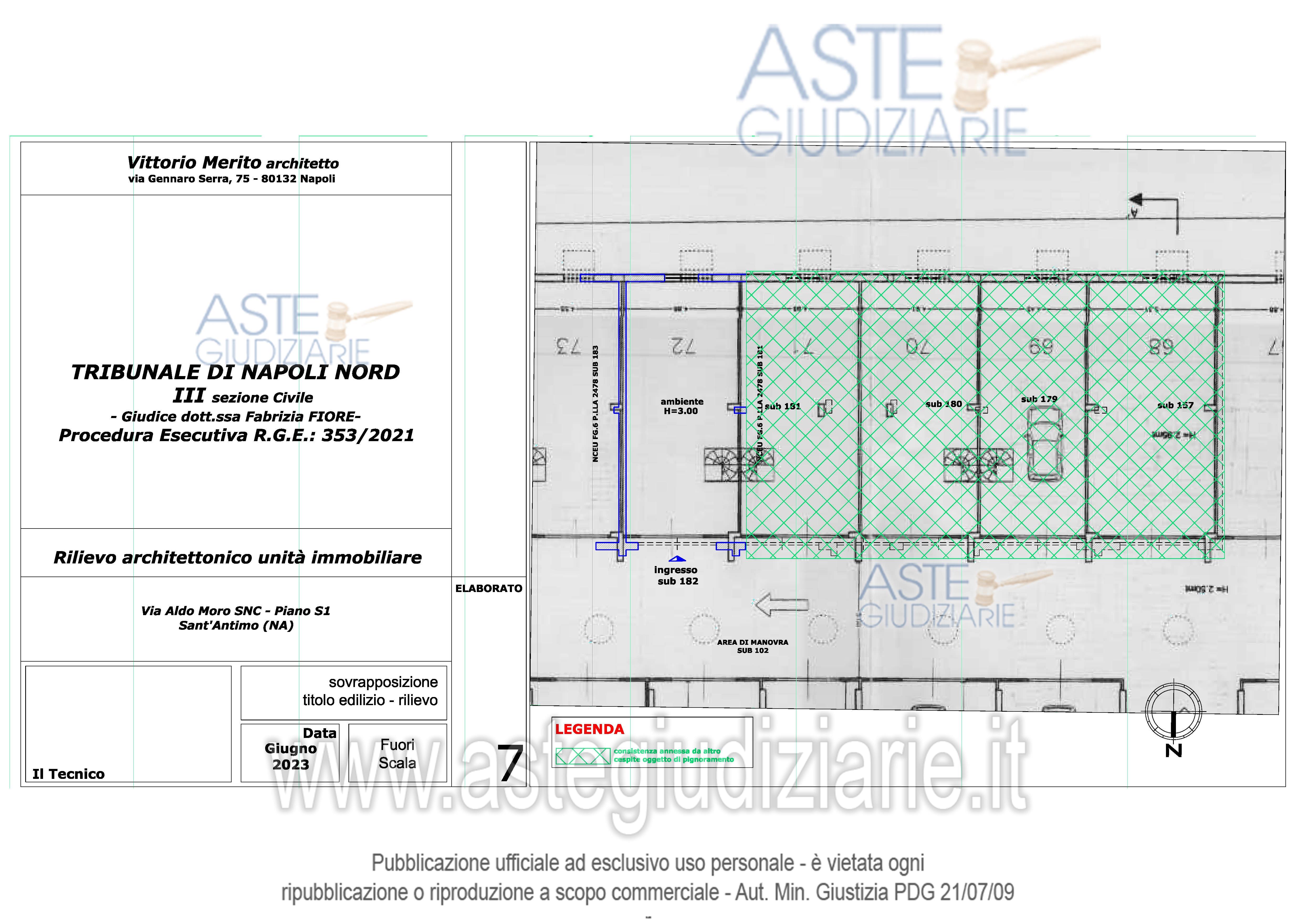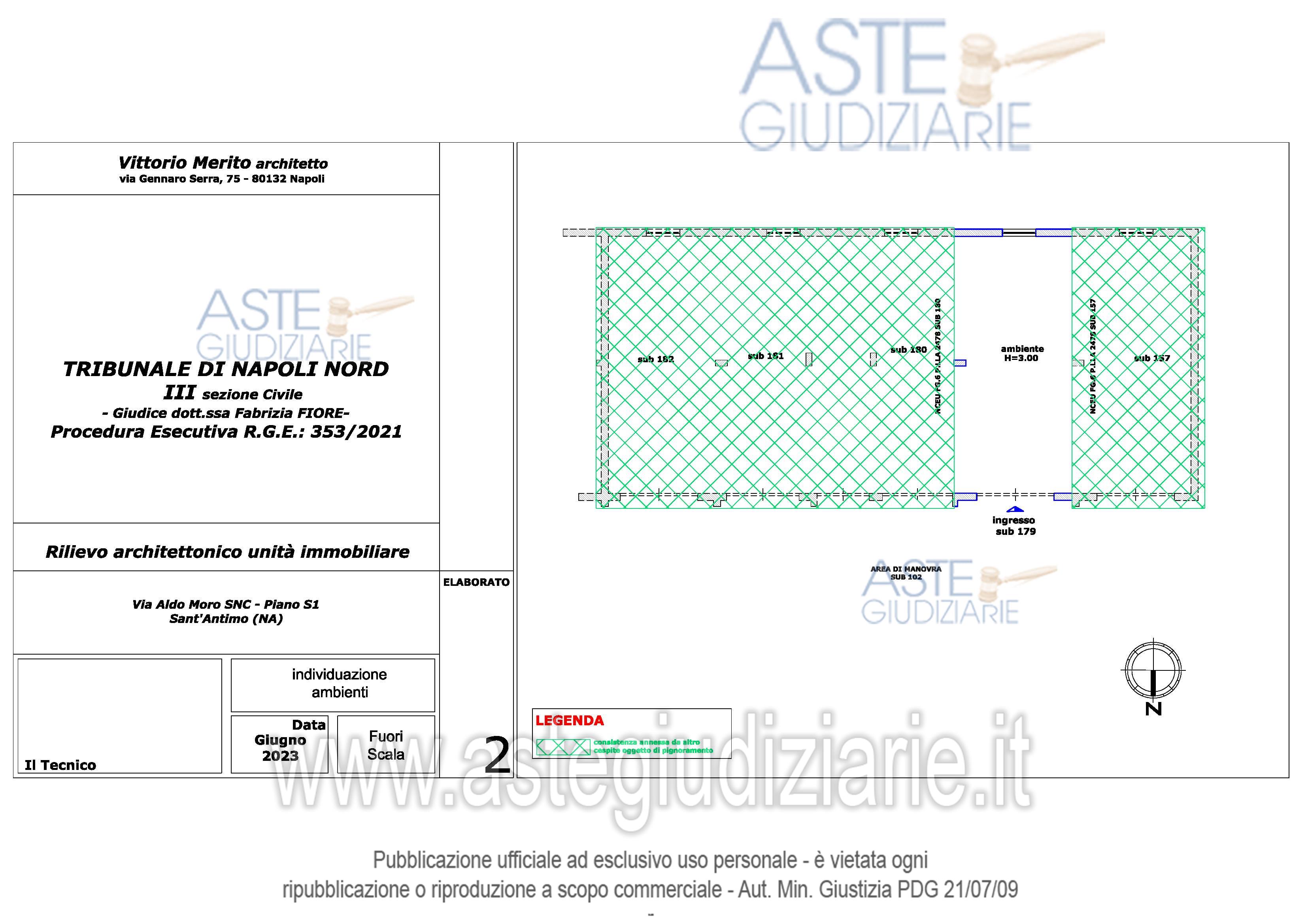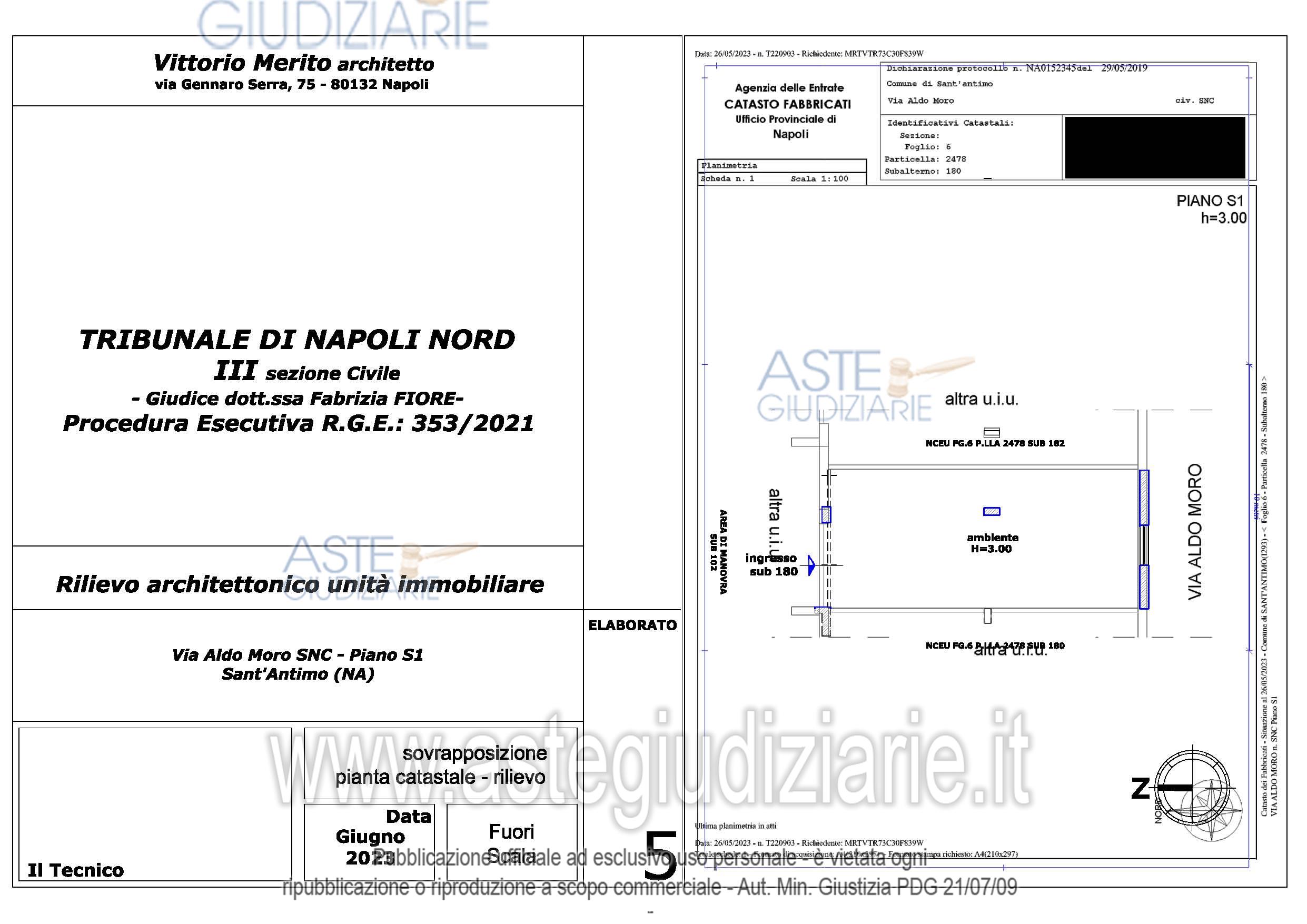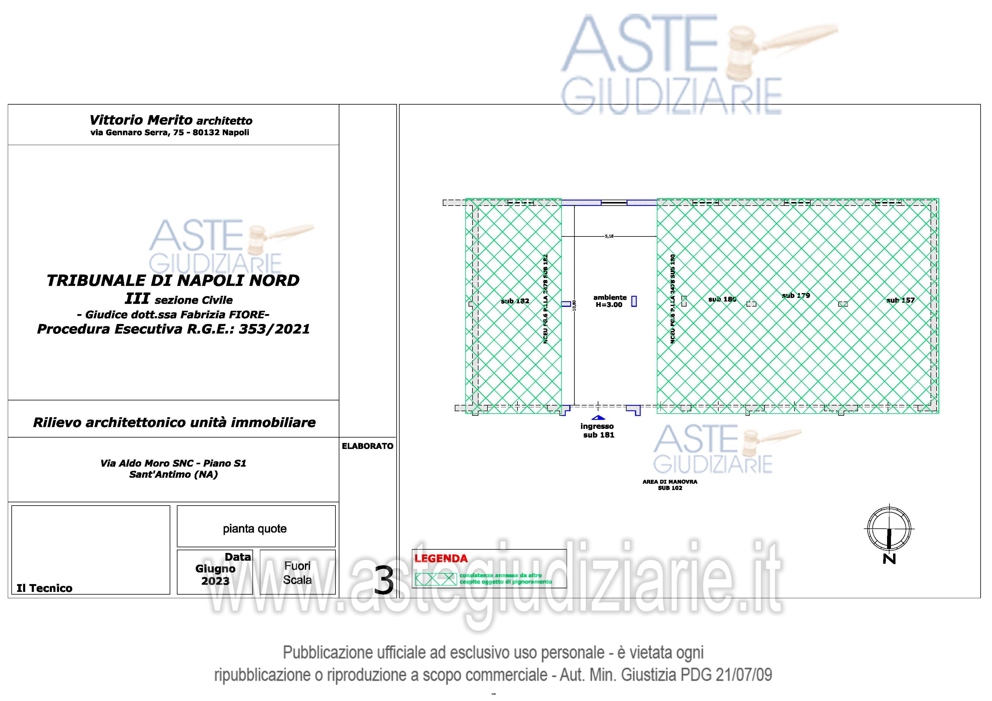 Vendita all'asta Senza incanto, con gara telematica asincrona - LOTTO 36: BENE 1 – Garage sito nel Comune di Sant’Antimo (Na) via Aldo Moro 21, piano S1 “Parco Omissis” composto da unico ambiente; in NCEU foglio 6, particella 2478, sub. 157, cat. C/6, classe 3, consistenza 52 mq, sup. cat. 56 mq. Bene 2 -Bene 3 - Bene 4 e Bene 5 - Locali Deposito, censiti in NCEU al foglio 6, part. 2478, sub 179, 180, 181, 182. I beni de quibus risultano tutti liberi. Prezzo base € 141.600,00 (offerta minima € 106.200,00). Data inizio operazioni di vendita: 27/11/2025 ore 16:00. Custode Giudiziario Dott. Francesco Russo - Email "studiocasillorusso@libero.it"; Tel. 0815404454. Rif. Tribunale di Napoli Nord - Esecuzione immobiliare post legge 80 n. 353/2021
