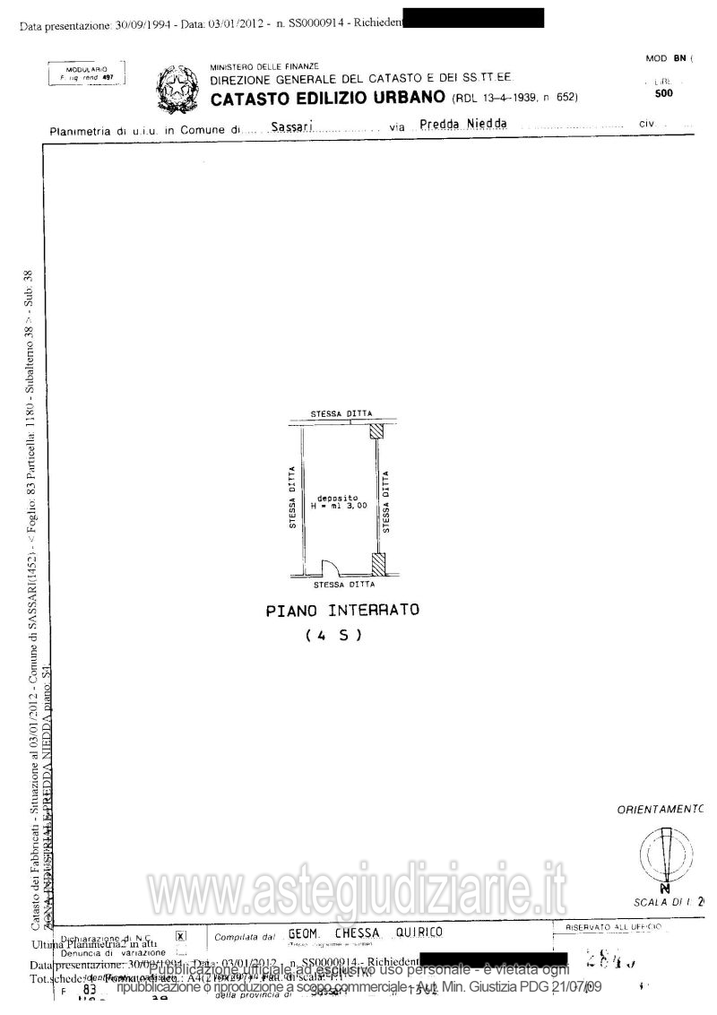 Vendita in attesa dell'emissione del nuovo bando d'asta. LOTTO 6: Piena proprietà:Immobile ad uso magazzino ubicato al 4° livello seminterrato, distinto al NCEU delComune di Sassari alfoglio 83 - particella 1180 - sub 38 - Zona Industriale Predda Niedda - p. S4 - Z.C. 2 -Cat. C/2 - Cl. 1 - mq 37 - superficie catastale totale 40 mq - Rendita Euro 150,96. Ultimo prezzo base € 2.575,75 (offerta minima € 1.931,81). Giudice Dott. Elisa Remonti. Professionista delegato alla vendita Not. Antonietta Piras - Email "apiras.esecuzioni@gmail.com"; Tel. 079273264. Custode Giudiziario Istituto Vendite Giudiziarie - Email "visitaivgsassari@gmail.com"; Tel. 079260228. Rif. Tribunale di Sassari - Esecuzione immobiliare post legge 80 n. 167/2011
