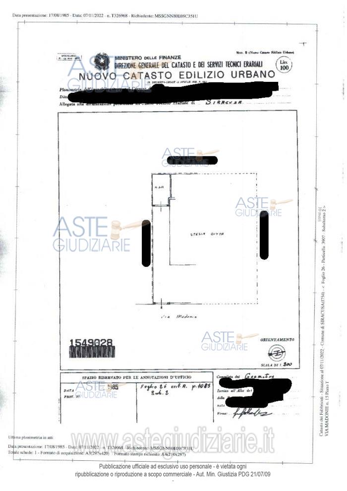 Vendita all'asta Senza incanto, con gara telematica sincrona mista - LOTTO UNICO: Lotto 1: 1/1 della proprietà del garage sito in Siracusa, via Madonie n. 15/17, piano terra, censito al C.F. del predetto Comune al fg. 26, p.lla 3907, sub. 2, cat. C/2, già fg. 26, p.lla 1085, sub. 2, r.c. € 99,16. Prezzo base € 6.693,75 (offerta minima € 5.020,31). Data vendita 03/02/2026 ore 10:00. Professionista delegato alla vendita Avv. Monica Benedetto - Email "avvmonicabenedetto@hotmail.com"; Cell. 3391109753; Tel. 09311560608. Custode Giudiziario Avv. Monica Benedetto - Email "avvmonicabenedetto@hotmail.com"; Cell. 3391109753; Tel. 09311560608. Rif. Tribunale di Siracusa - Esecuzione immobiliare post legge 80 n. 149/2022