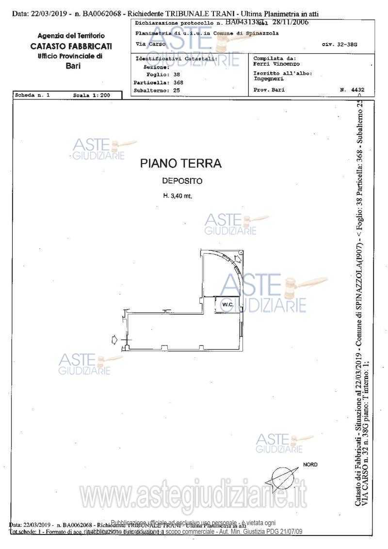 Vendita all'asta Senza incanto, con gara telematica sincrona - LOTTO 1: Piena proprietà, per la quota di 1000/1000, di locale ad uso deposito sito in Spinazzola (BT) alla Via Carso n.32, piano terra, identificato nel N.C.E.U. del Comune di Spinazzola al foglio di mappa 38, particella 368, sub. 25, categoria C/2, classe 5, consistenza mq 68, superficie catastale mq 78, interno 1, piano T, rendita catastale € 126,43. Prezzo base € 19.428,61 (offerta minima € 14.571,46). Data vendita 22/04/2026 ore 10:30. Giudice Margherita Valeriani. Professionista delegato alla vendita Avv. Carlo Barracchia - Email "studiolegalebarcan@gmail.com"; Tel. 0883532077. Custode Giudiziario Avv. Carlo Barracchia - Email "studiolegalebarcan@gmail.com"; Tel. 0883532077. Rif. Tribunale di Trani - Esecuzione immobiliare post legge 80 n. 311/2018