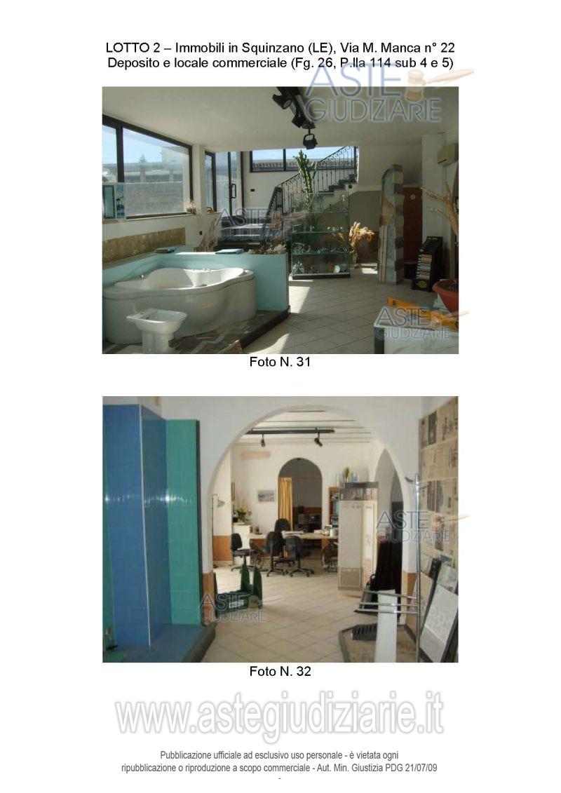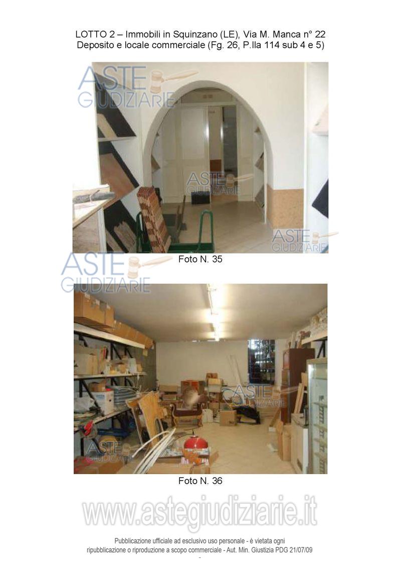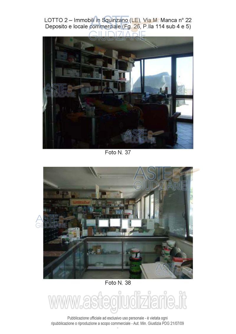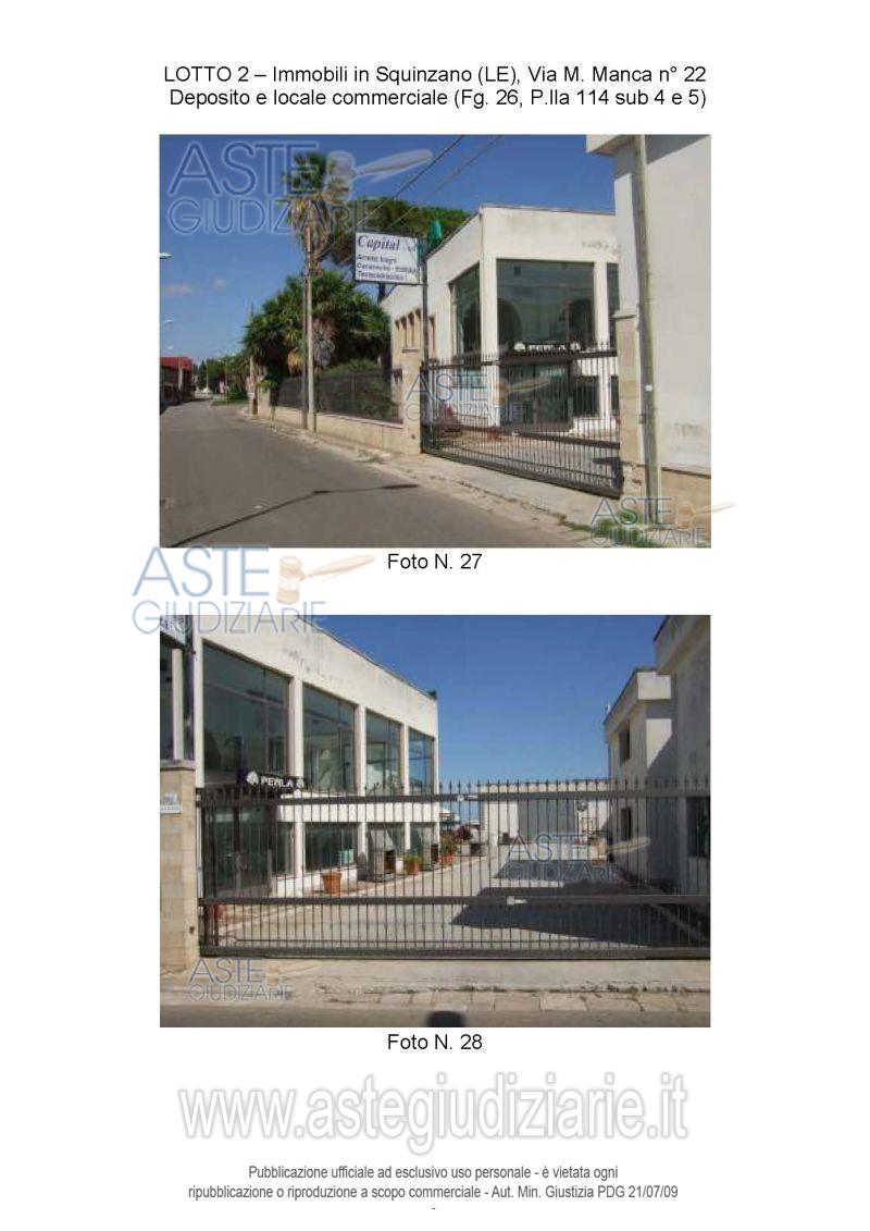Vendita all'asta Senza incanto, con gara telematica asincrona - LOTTO 2: Piena proprietà per la quota di 1000/1000 di deposito e locale commerciale siti in Squinzano, alla Via M. Manca n. 22. Prezzo base € 46.311,75 (offerta minima € 34.733,81). Data inizio operazioni di vendita: 19/03/2026 ore 15:00. Professionista delegato alla vendita Avv. Andrea Francesco Pezzuto - Email "andrepezzuto@virgilio.it"; Cell. 3483331922; Tel. 08321815193. Custode Giudiziario Avv. Andrea Francesco Pezzuto - Email "andrepezzuto@virgilio.it"; Cell. 3483331922; Tel. 08321815193. Rif. Tribunale di Lecce - Esecuzione immobiliare post legge 80 n. 85/2004