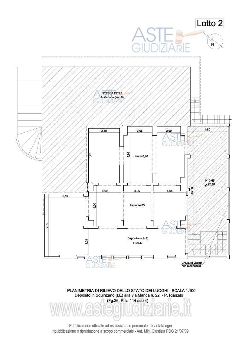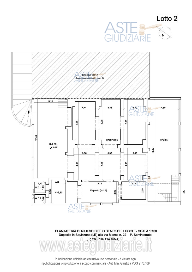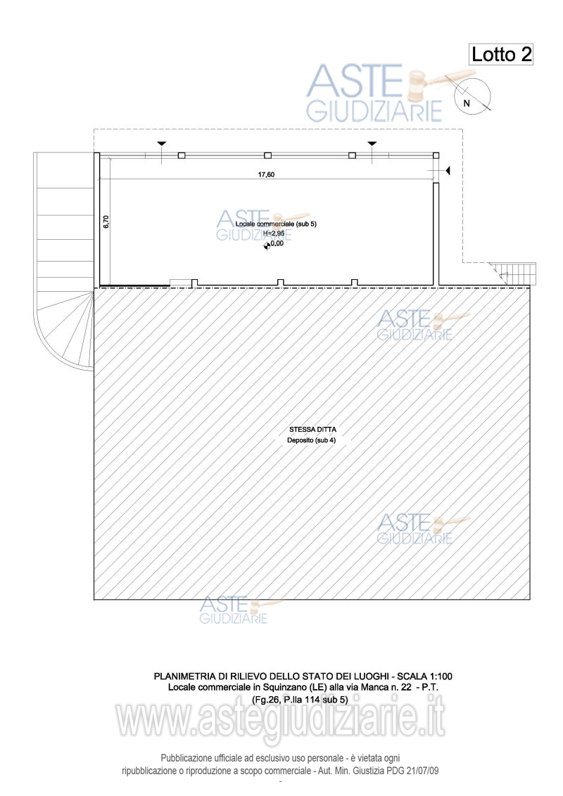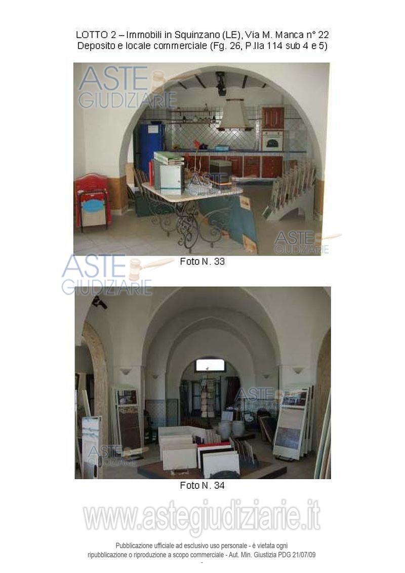Vendita all'asta Senza incanto, con gara telematica asincrona - LOTTO 2: Piena proprietà per la quota di 1000/1000 di deposito e locale commerciale siti in Squinzano, alla Via M. Manca n. 22. Prezzo base € 46.311,75 (offerta minima € 34.733,81). Data inizio operazioni di vendita: 19/03/2026 ore 15:00. Professionista delegato alla vendita Avv. Andrea Francesco Pezzuto - Email "andrepezzuto@virgilio.it"; Cell. 3483331922; Tel. 08321815193. Custode Giudiziario Avv. Andrea Francesco Pezzuto - Email "andrepezzuto@virgilio.it"; Cell. 3483331922; Tel. 08321815193. Rif. Tribunale di Lecce - Esecuzione immobiliare post legge 80 n. 85/2004