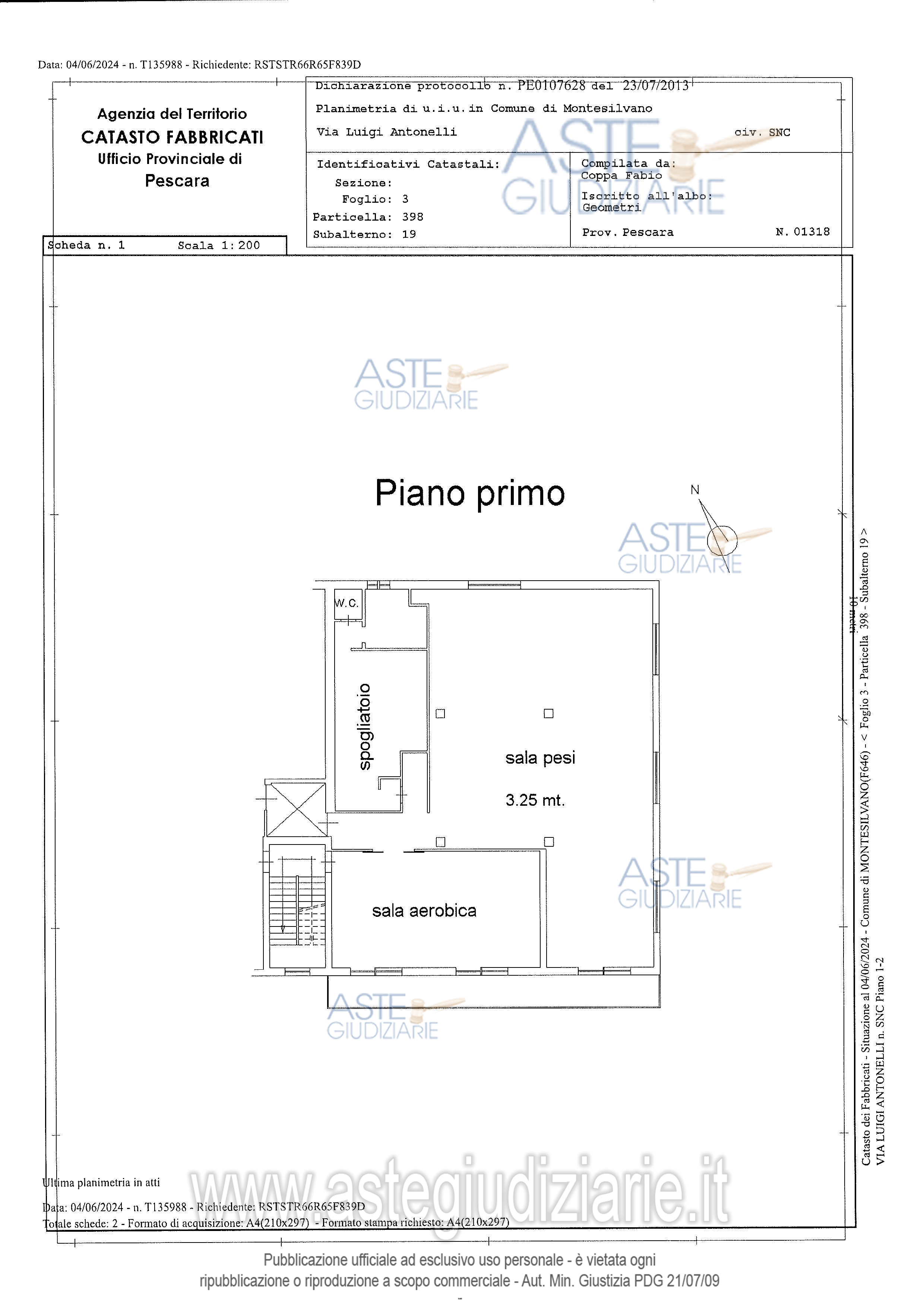 Vendita all'asta Senza incanto, con gara telematica asincrona - LOTTO UNICO: Diritti di piena proprietà su locale palestra (mq. 268,73) al piano primo. Prezzo base € 213.399,56 (offerta minima € 160.049,67). Data inizio operazioni di vendita: 28/10/2025 ore 15:30. Professionista delegato alla vendita Avv. Andrea Consorte. Custode Giudiziario Avv. Andrea Consorte - Email "andrea.consorte76@gmail.com". Rif. Tribunale di Pescara - Espropriazione immobiliare (cartabia) n. 74/2024