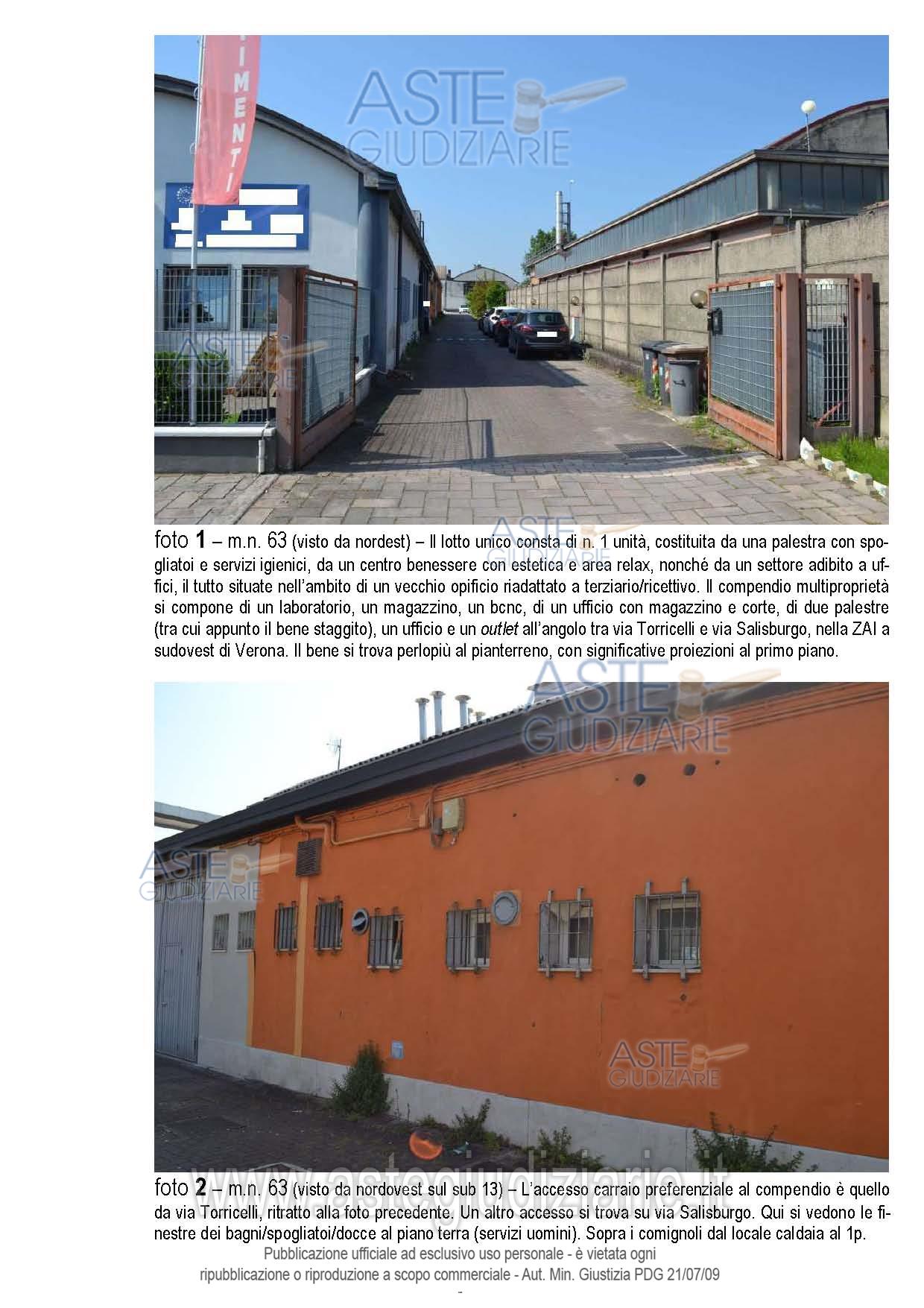 Vendita all'asta Senza incanto, con gara telematica sincrona mista - LOTTO UNICO: Piena proprietà di un immobile costituito da una palestra al pian terreno, con spogliatoi e servizi igienici anche al primo piano, da un centro estetico con zona relax e da un settore adibito a tre uffici. Prezzo base € 250.000,00 (offerta minima € 187.500,00). Data vendita 03/03/2026 ore 15:00. Giudice Francesco Fontana. Professionista delegato alla vendita Avv. Nicola Sordi - Email "segreteria@studiolegalesordi.it"; Tel. 045590819. Custode Giudiziario Avv. Nicola Sordi - Email "segreteria@studiolegalesordi.it"; Tel. 045590819. Rif. Tribunale di Verona - Espropriazione immobiliare (cartabia) n. 48/2025