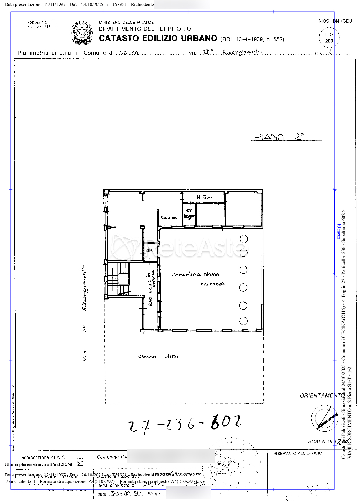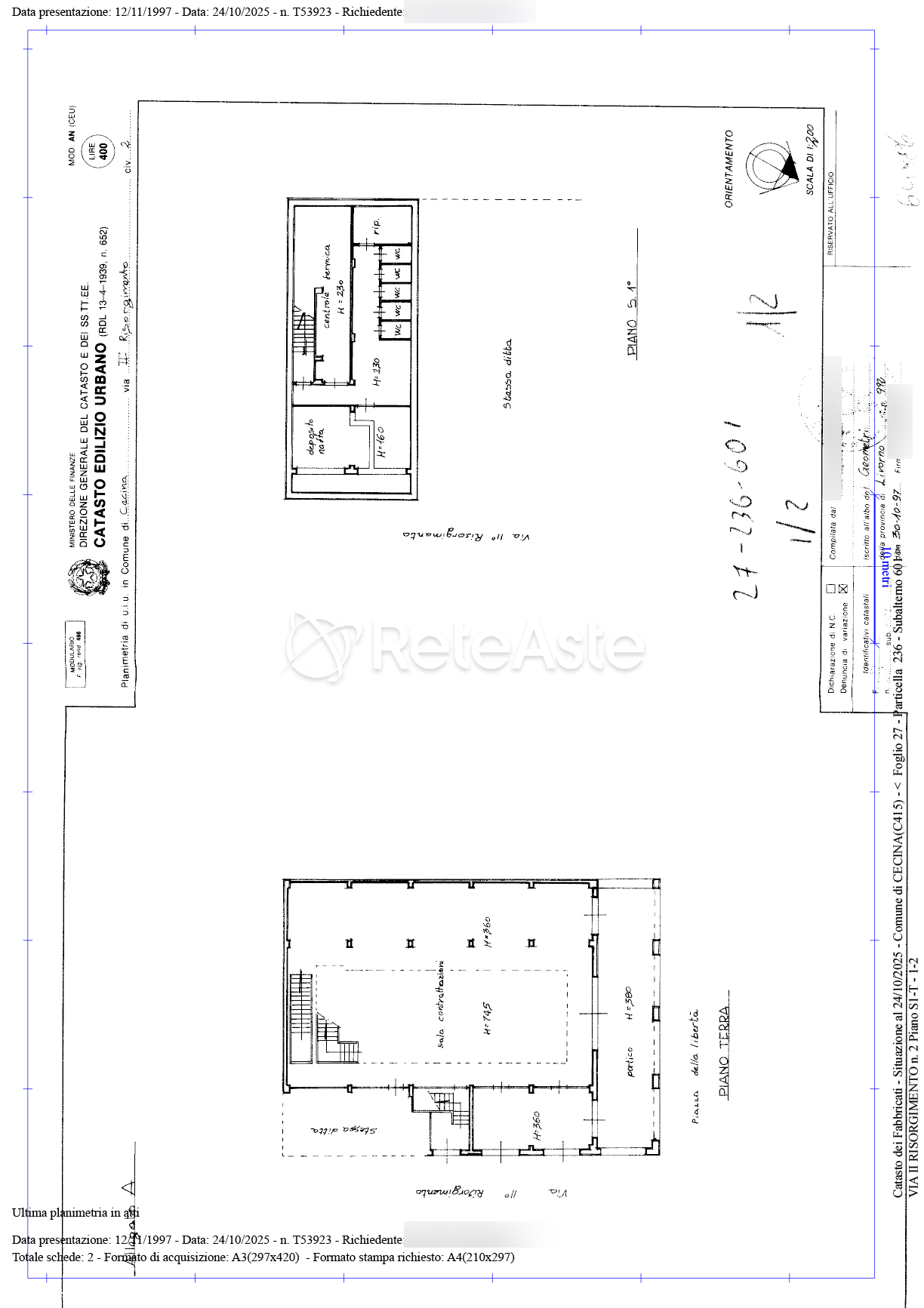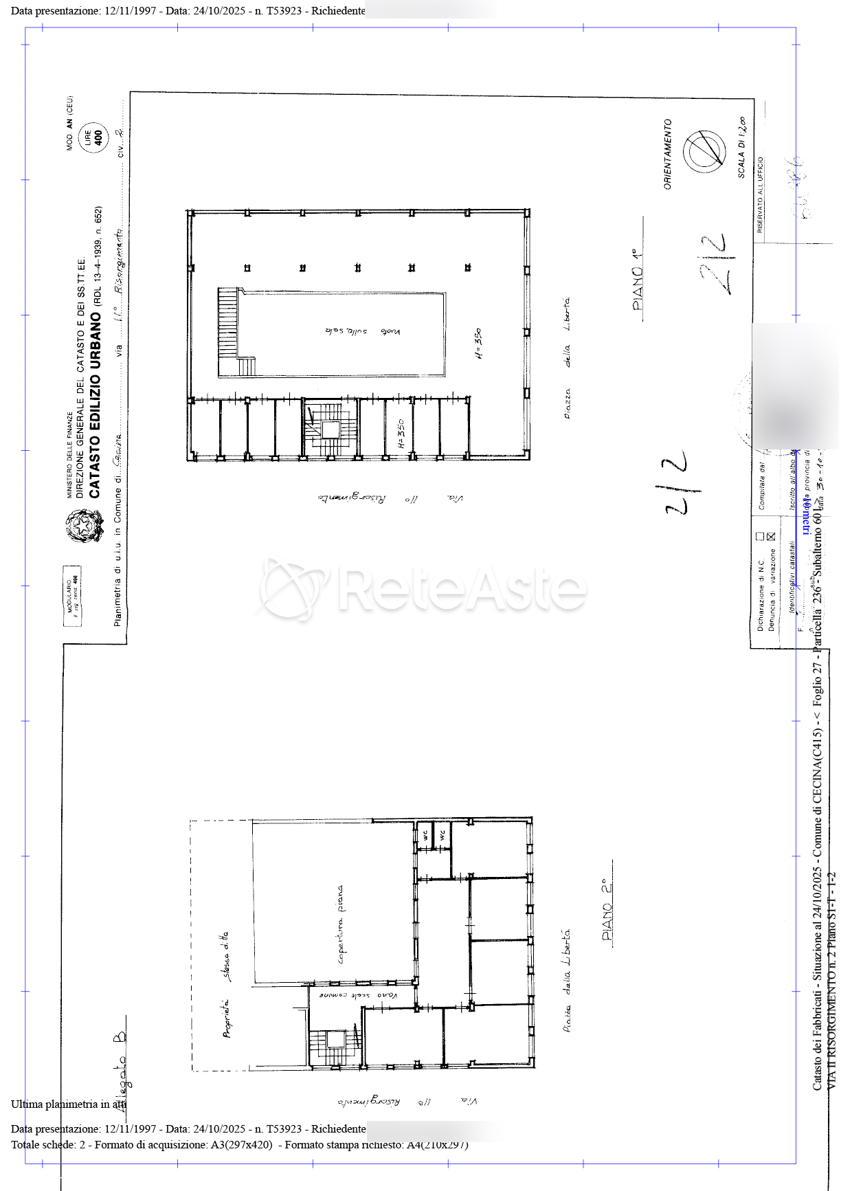 塞西纳市中心的多功能建筑,位于一个服务设施密集的区域。附近有公共办公场所,车abinieri兵营,信贷机构和零售商店。自由广场是主要入口的所在地,那里设有长途汽车站,火车站也只需几分钟步行即可抵达。临近交通有限制和步行专用区,提供优良的公共交通连接和附近停车场。该建筑建于1957年至1961年,采用钢筋混凝土结构,地上三层外加一个半地下室。外墙采用多种饰面:一层为“终结石”,上层是露面砖。主入口处的自由广场有一个具有珍贵建筑细节的雄伟门廊。该房产自2005年停用,目前空置,分为三个主要单位:• 主单位:跨越多个层面,一楼为大型交易大厅,二楼为办公室,设有围合式阳台,三楼为大型办公室和卫生间。半地下室设有卫生间、锅炉房和储藏室。• 次要单位:一楼为一间小型商铺,设有独立卫生间;二楼为一间服务式住宅,包括门厅、宽敞的起居区带厨房、两间卧室、浴室和天台。该房产维护状况不佳,完全没有电力和暖通设施,未来任何用途都需要全面翻修。由于中心位置和大面积,该建筑对具有战略眼光的购买者来说是一个重要的整修机会。该建筑地理位置优越,毗邻主要交通道路:埃乌雷利亚国道和与A12高速公路的连接很便利,可迅速连接周边城市。