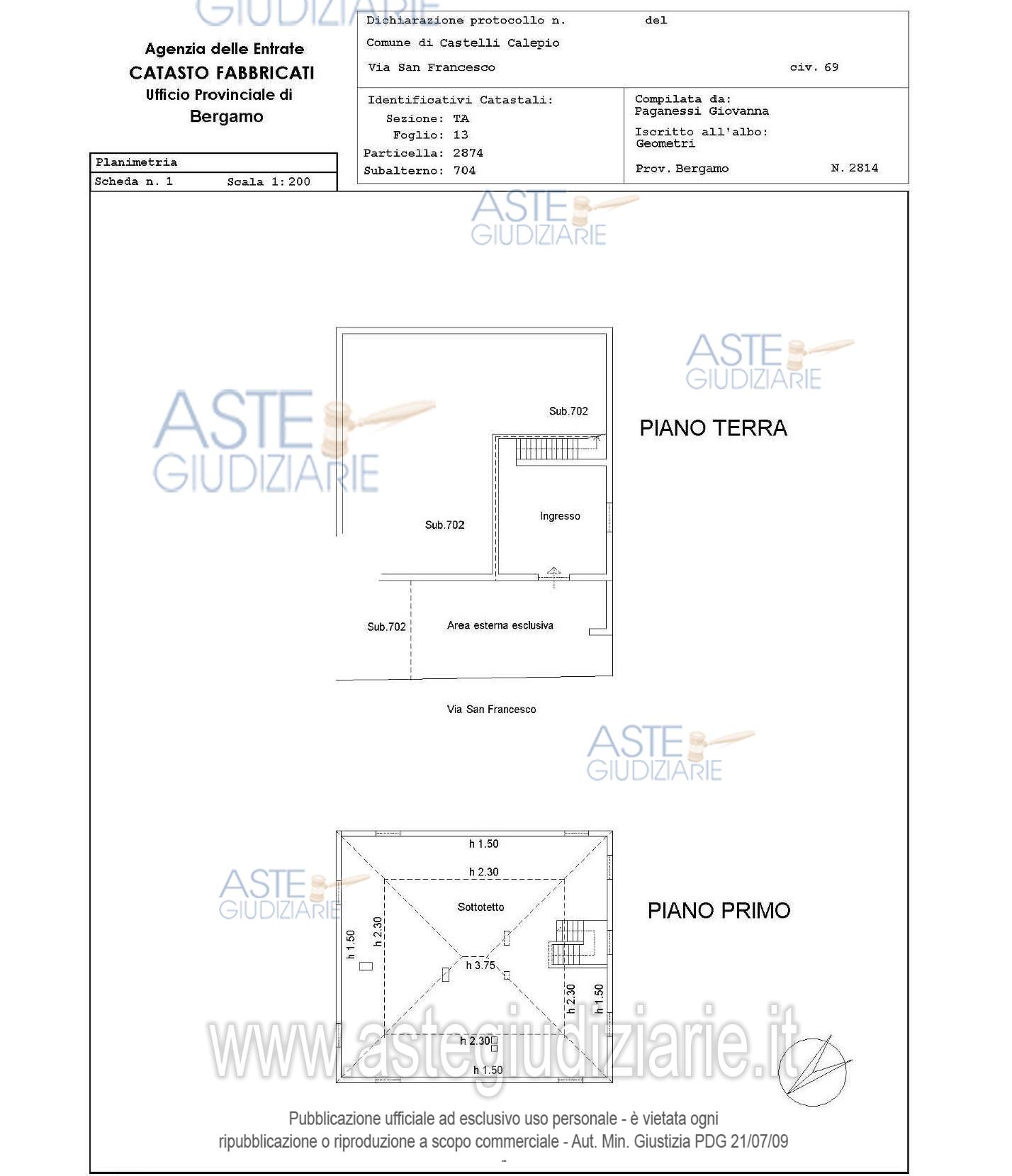 Vendita all'asta Senza incanto, con gara telematica asincrona - LOTTO UNICO: sottotetto al rustico al piano primo cui si accede dal piano terra mediante ingresso e scala interna esclusivi, con annessa area esterna esclusiva al piano terra. Prezzo base € 26.277,75 (offerta minima € 19.708,31). Data inizio operazioni di vendita: 15/04/2026 ore 14:30. Professionista delegato alla vendita Not. Lavinia Delfini - Email "esecuzioni@notarile-legale.it"; Tel. 035217551. Custode Giudiziario V.G.C. S.R.L. - Email "immobiliare@ivgbergamo.it"; Tel. 035234967. Rif. Tribunale di Bergamo - Espropriazione immobiliare (cartabia) n. 343/2024